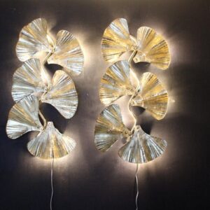 Paire d’appliques style Tommaso Barbi à feuilles de Gingko doré en verre de Murano