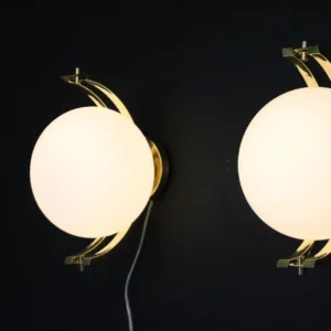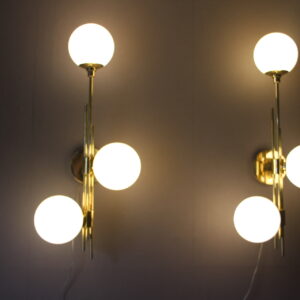 Paire de globes modernes en laiton et verre de Murano blanc, style Stilnovo