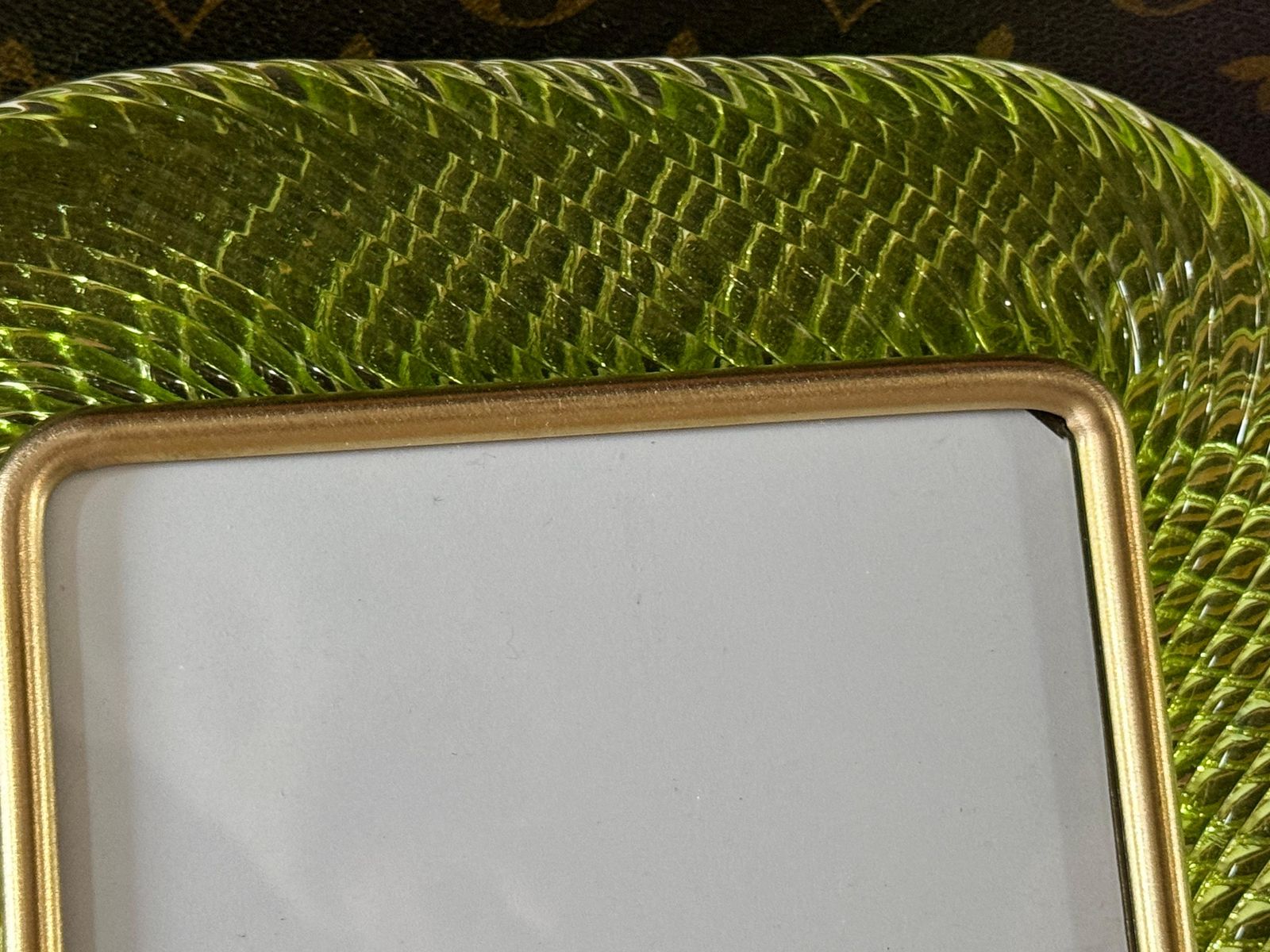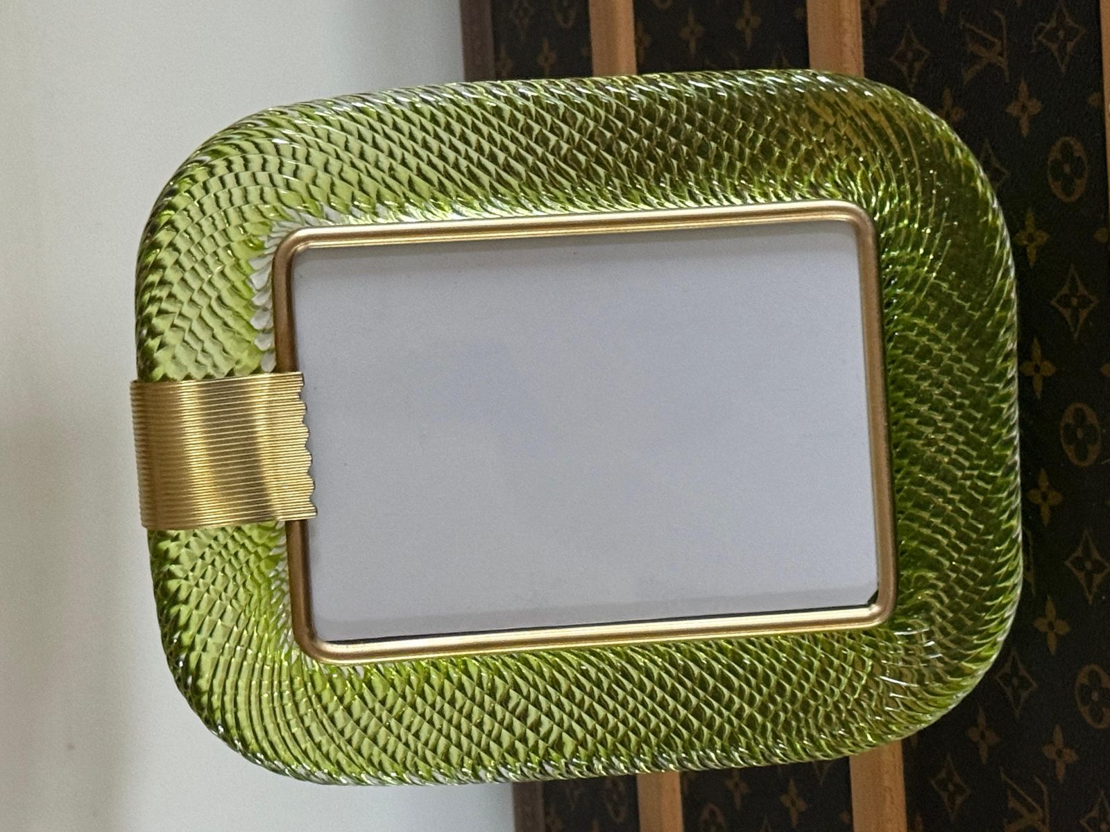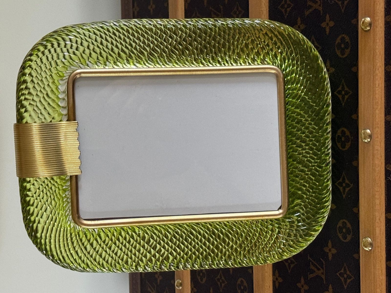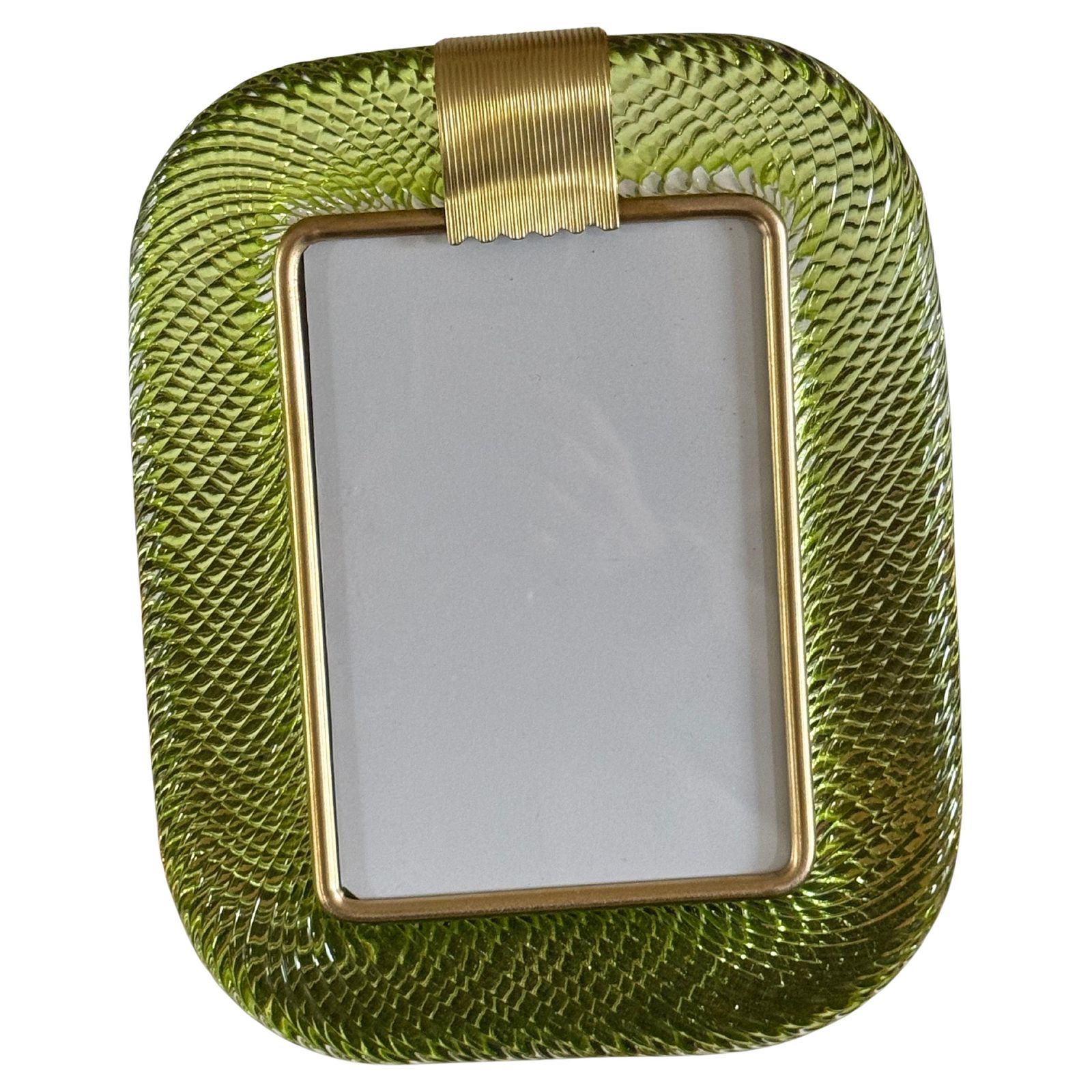 Ce cadre photo présente du verre de Murano soufflé en profondeur dans une couleur très spéciale, allant du jaune au vert, recouvert de cristal.