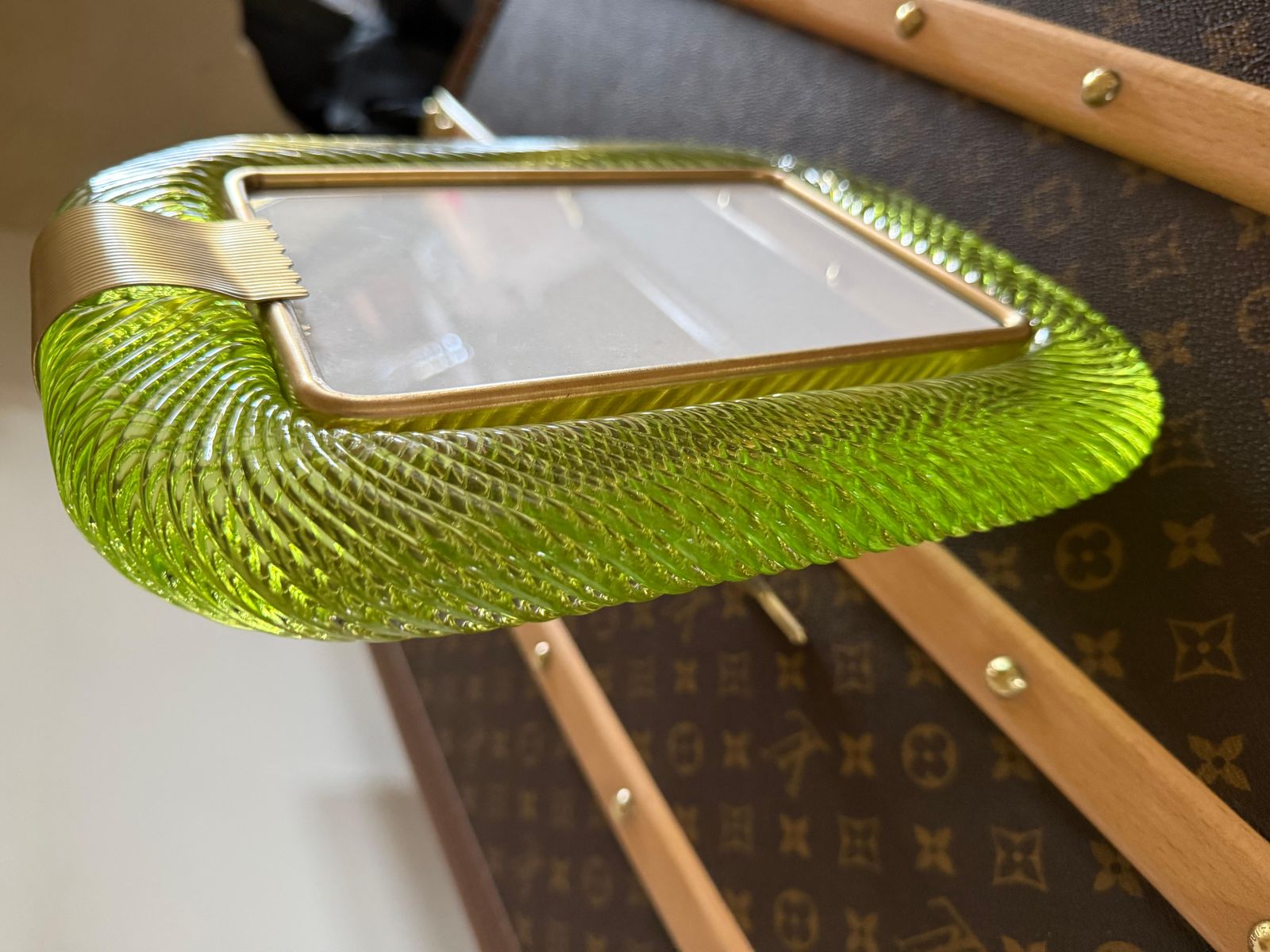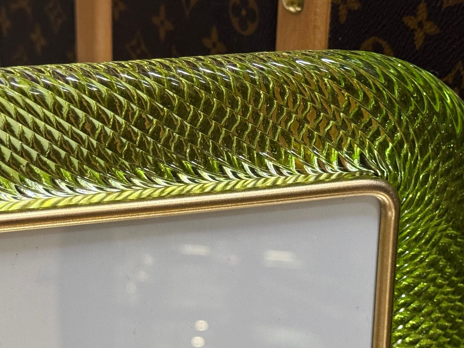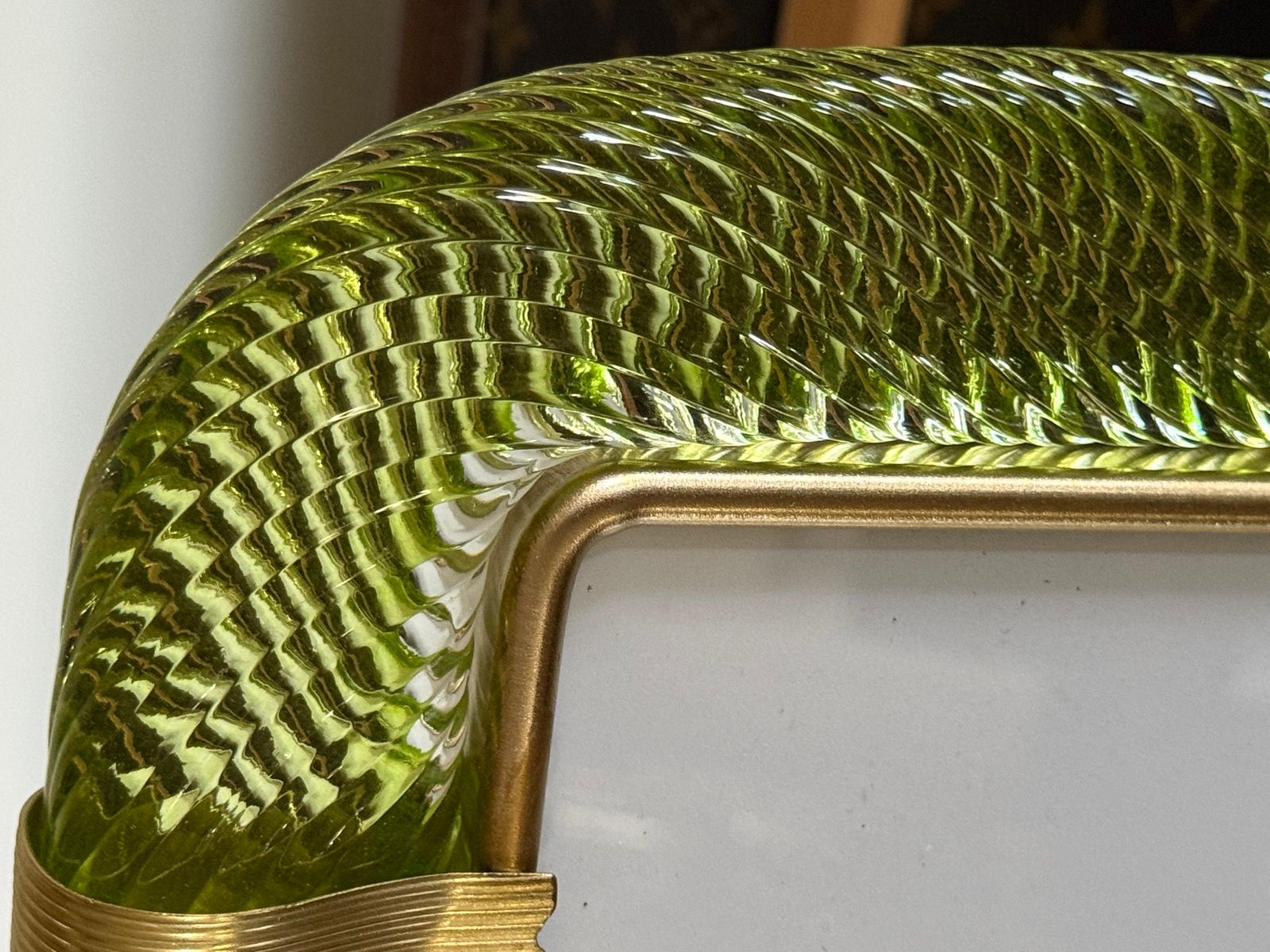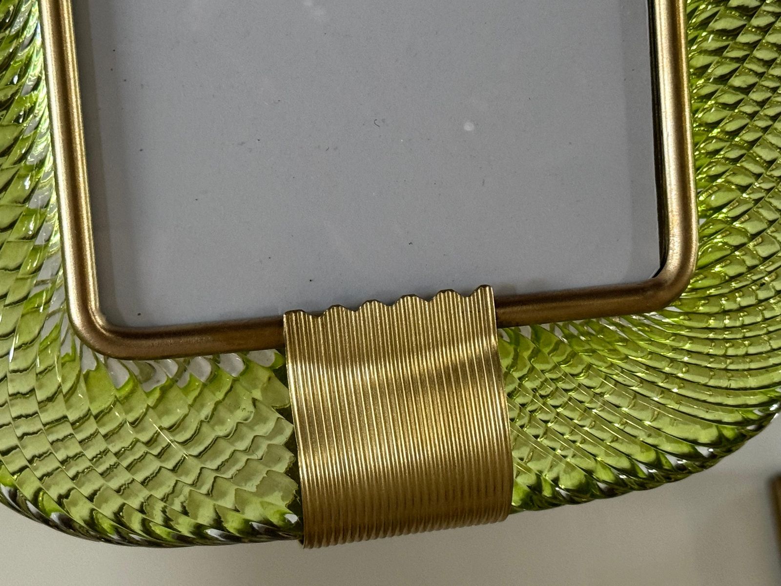 Ce cadre photo présente du verre de Murano soufflé en profondeur dans une couleur très spéciale, allant du jaune au vert, recouvert de cristal.