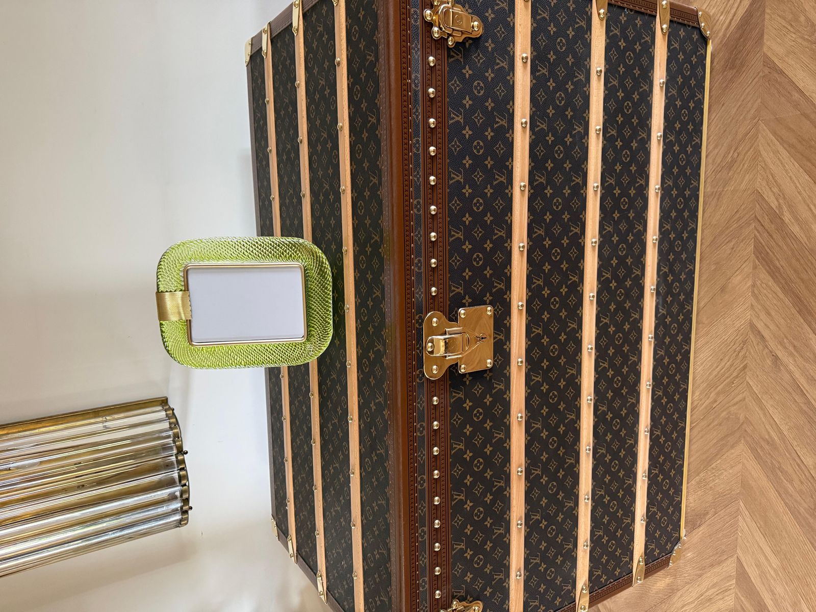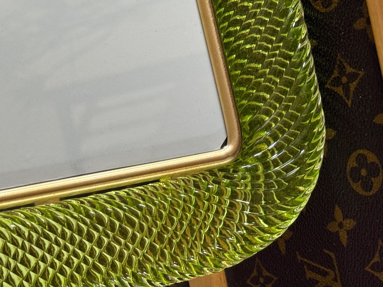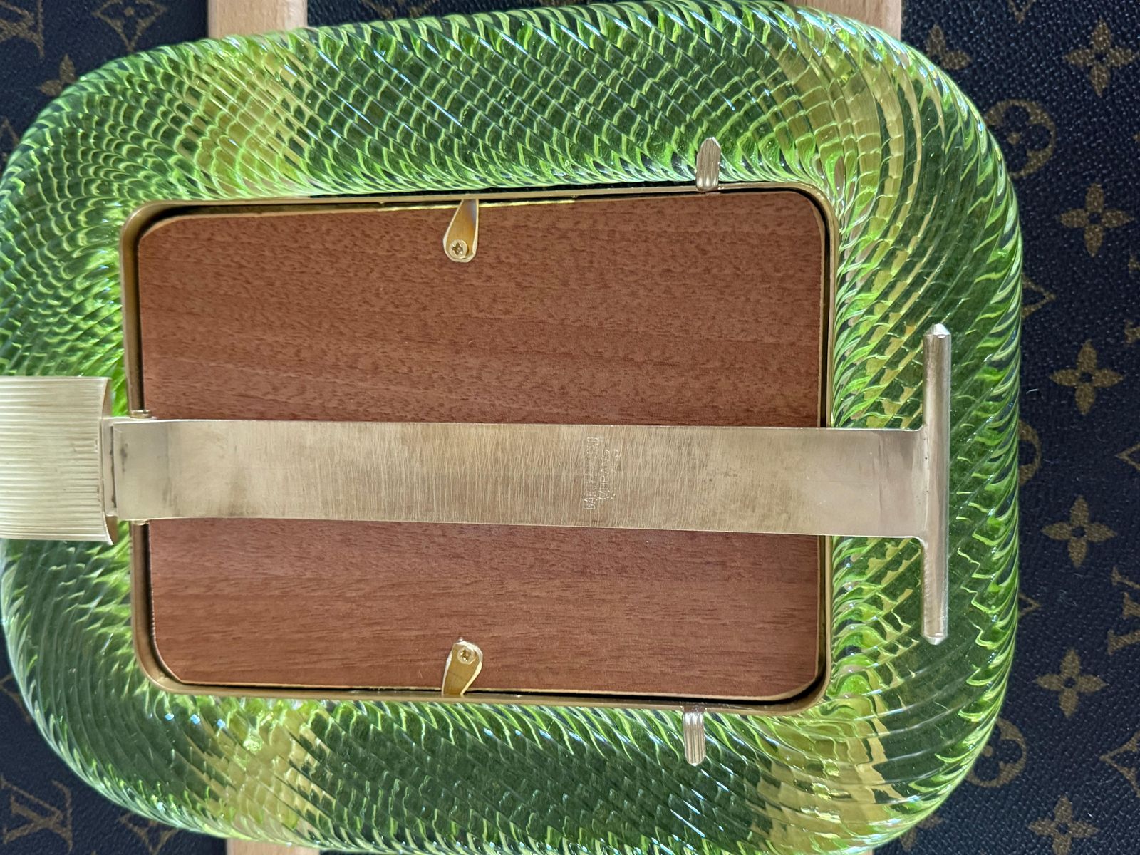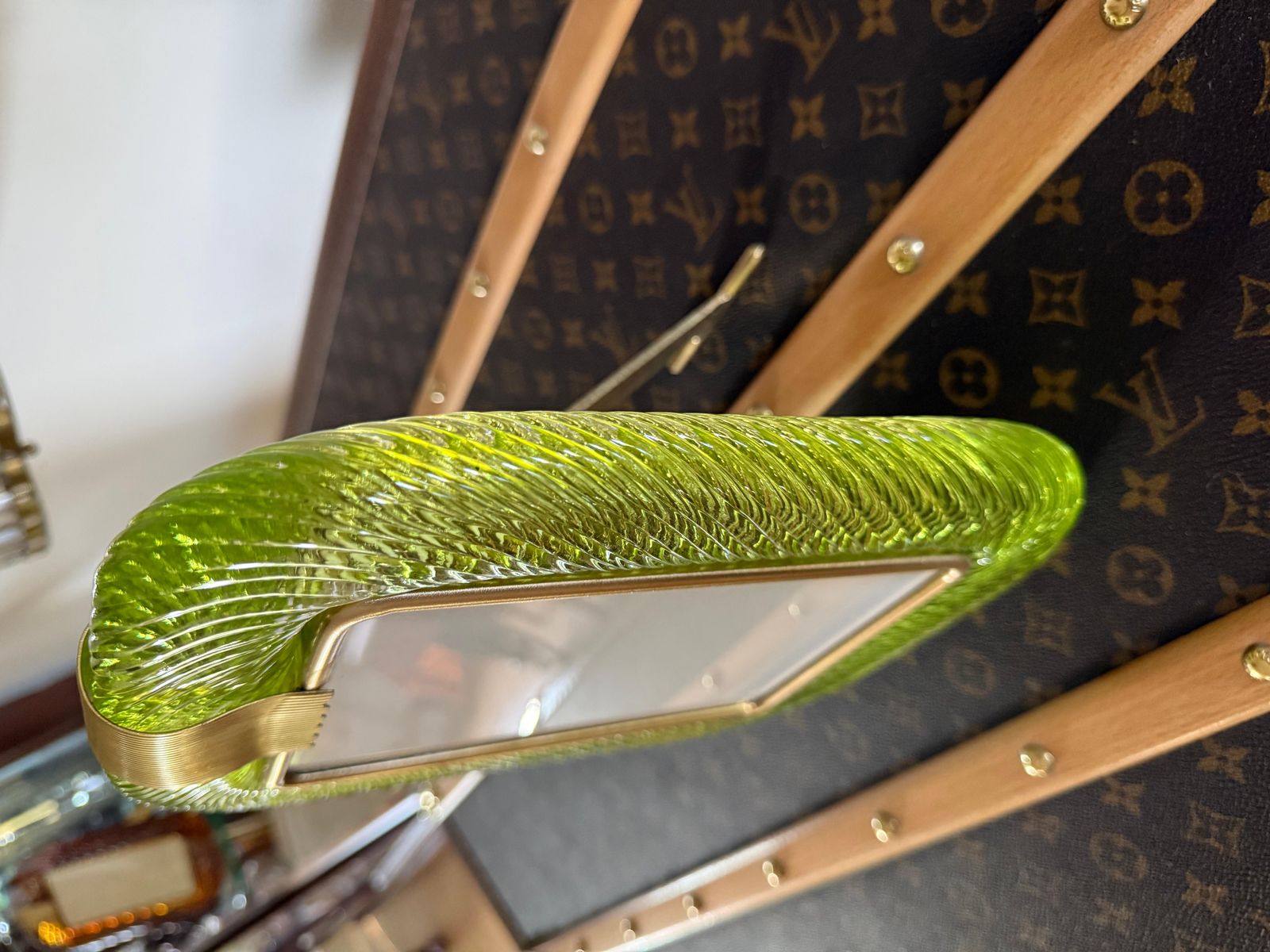 Ce cadre photo présente du verre de Murano soufflé en profondeur dans une couleur très spéciale, allant du jaune au vert, recouvert de cristal.