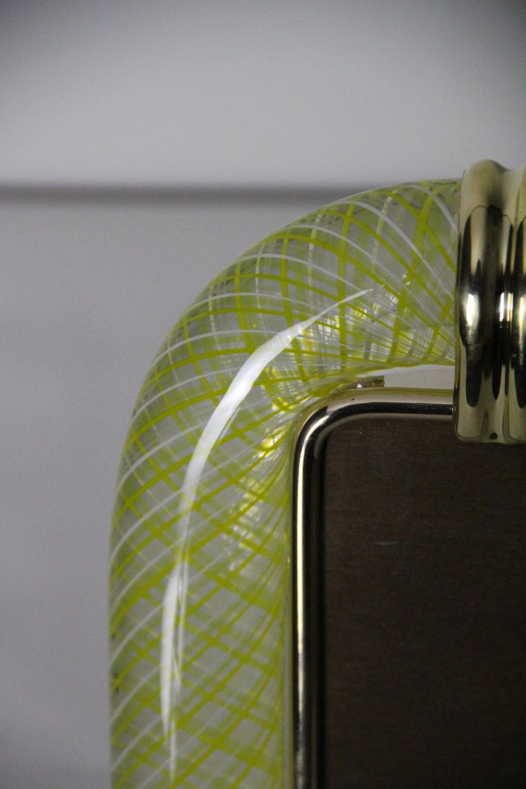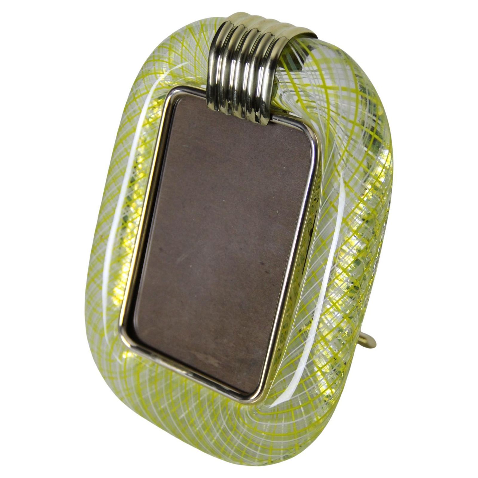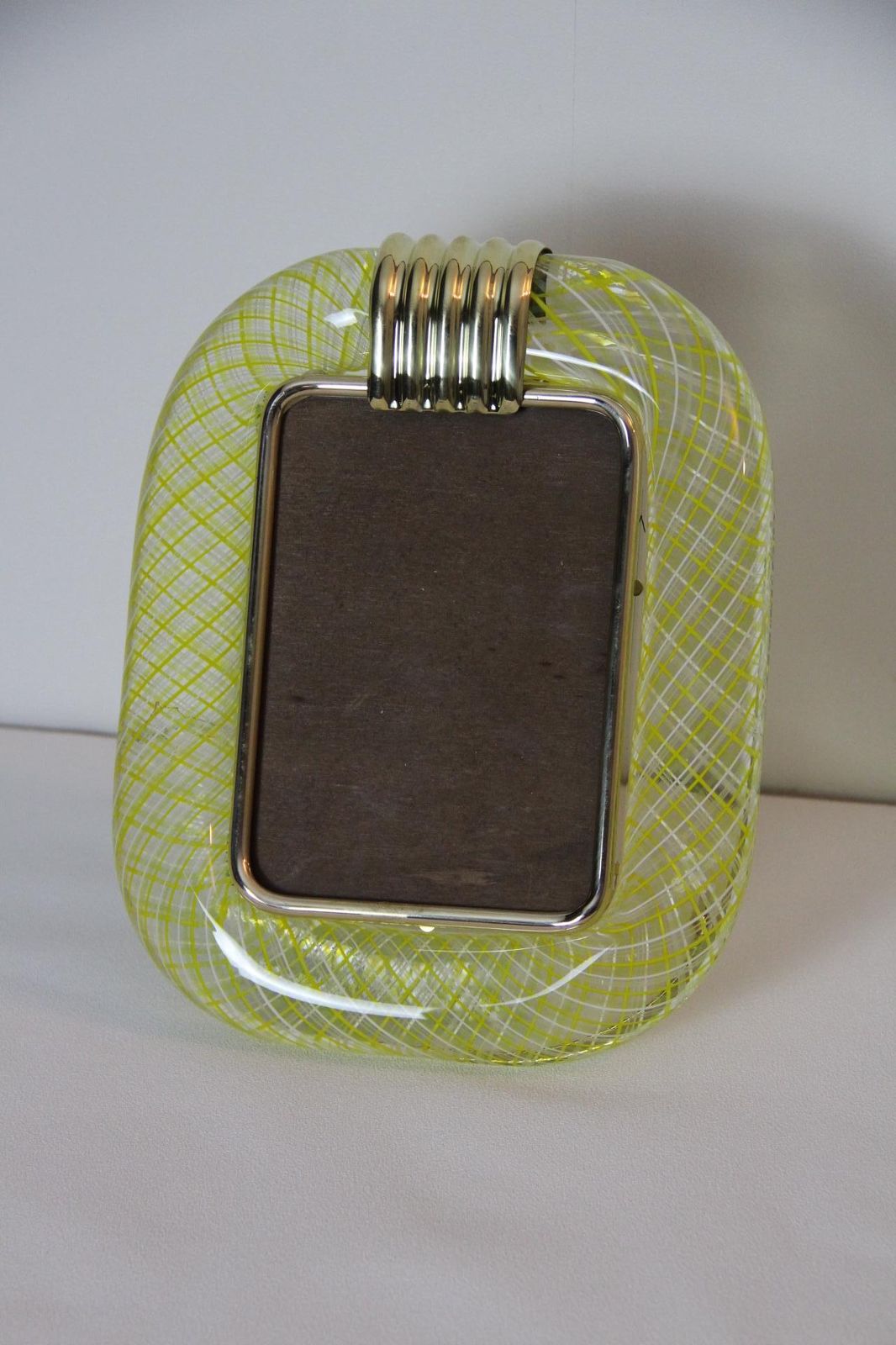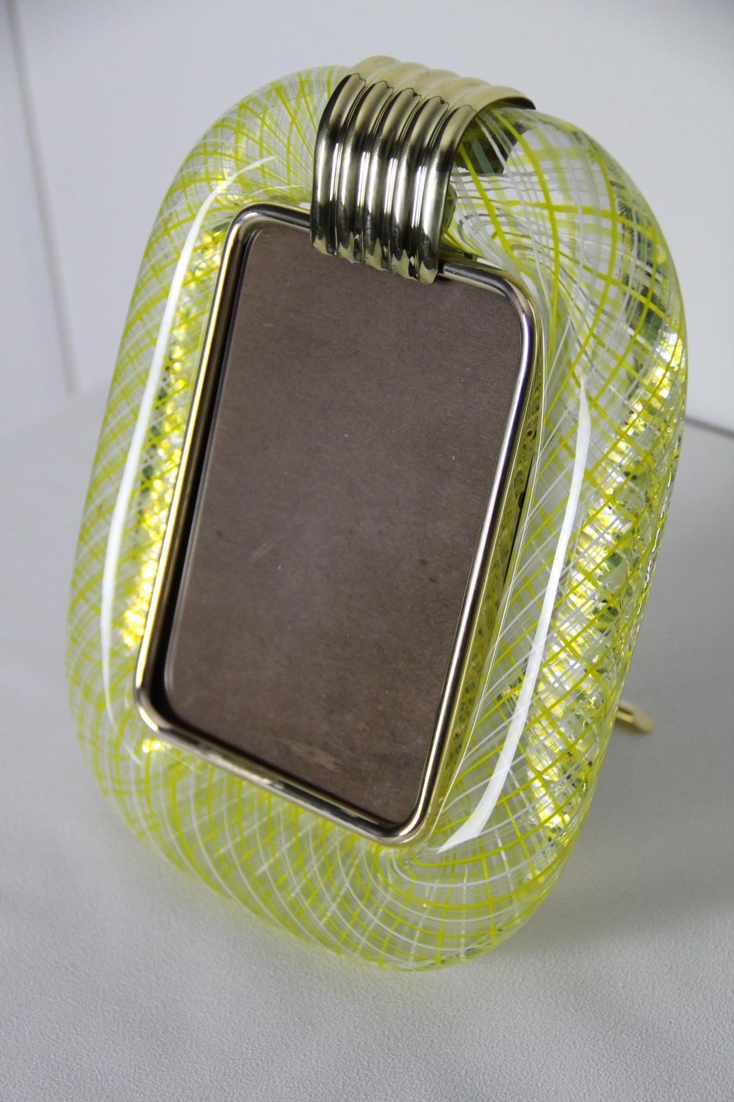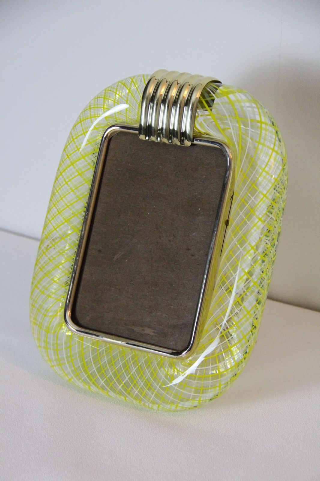 Ce magnifique cadre photo vertical est purement dans la tradition de la fabrication du verre vénitien tradition. La technique utilisée pour obtenir ce riche effet optique est appelée filigrana et nécessite des artisans hautement qualifiés. Ce cadre photo est composé de verre de Murano jaune-vert d’une couleur très vivante, recouvert de cristal. De fines lignes jaunes et blanches s’enroulent autour du cadre en verre de cristal comme des fils très fins.