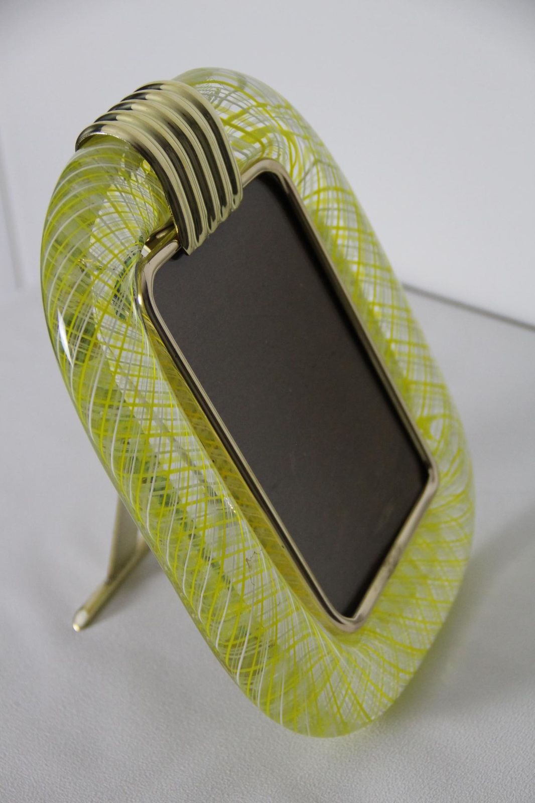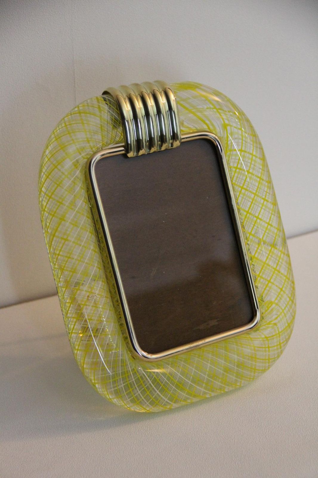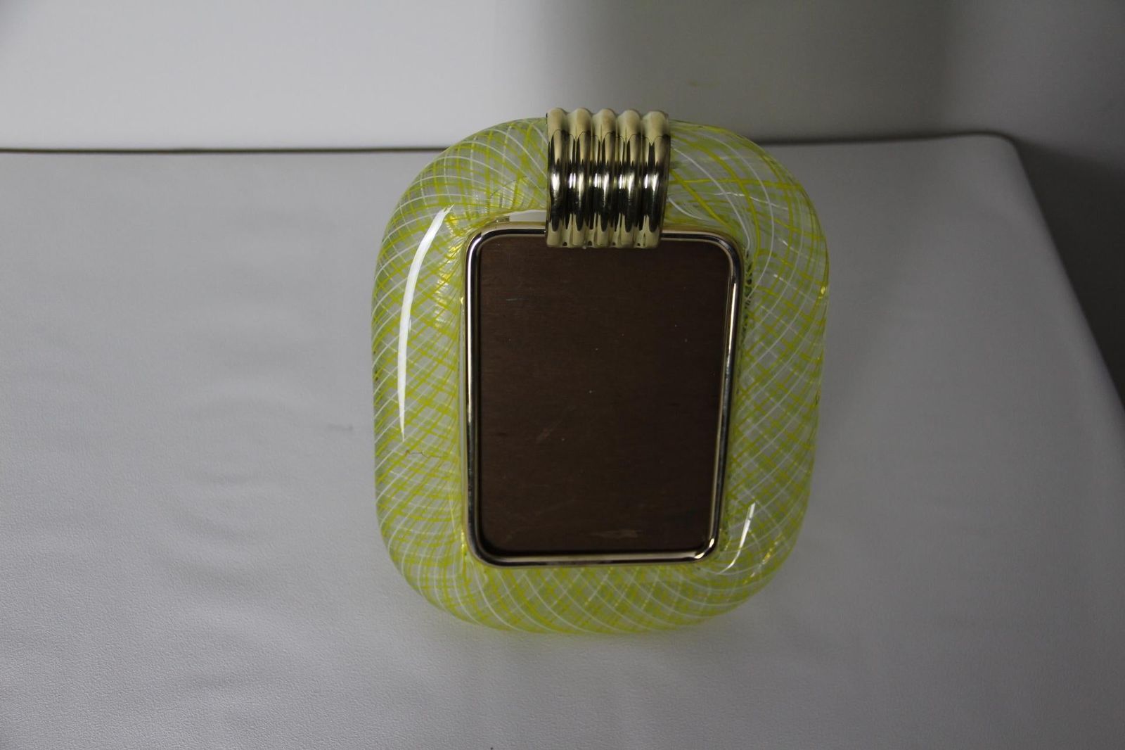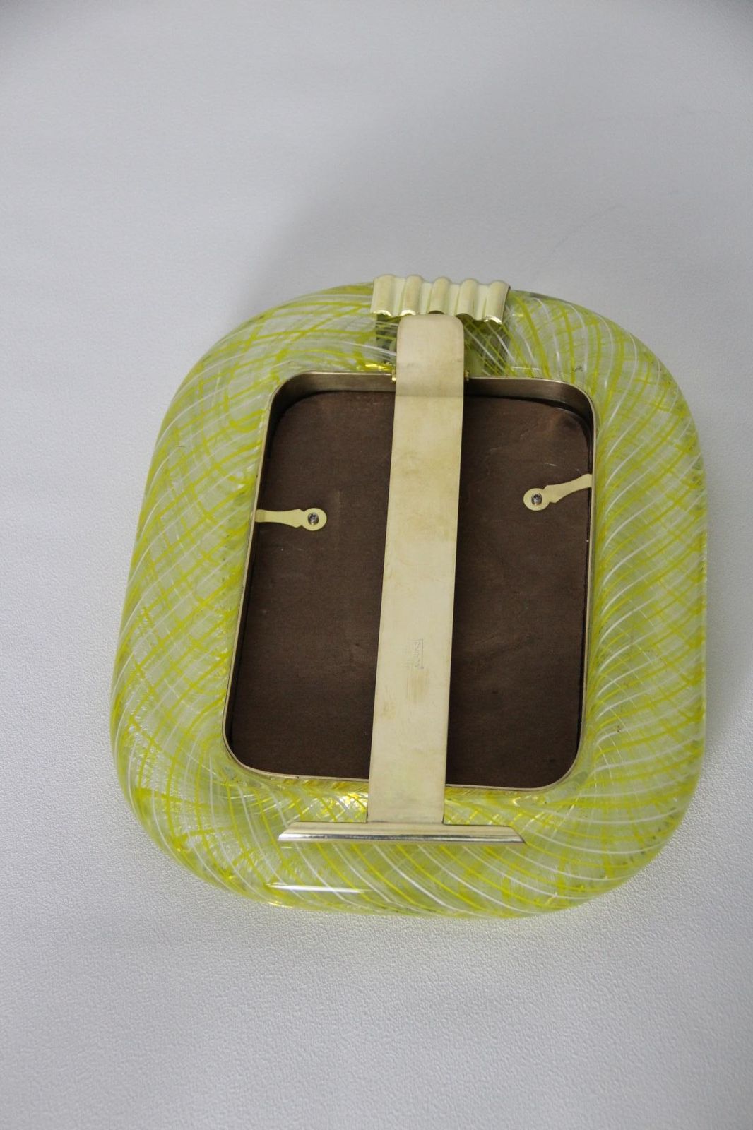 Ce magnifique cadre photo vertical est purement dans la tradition de la fabrication du verre vénitien tradition. La technique utilisée pour obtenir ce riche effet optique est appelée filigrana et nécessite des artisans hautement qualifiés. Ce cadre photo est composé de verre de Murano jaune-vert d’une couleur très vivante, recouvert de cristal. De fines lignes jaunes et blanches s’enroulent autour du cadre en verre de cristal comme des fils très fins.