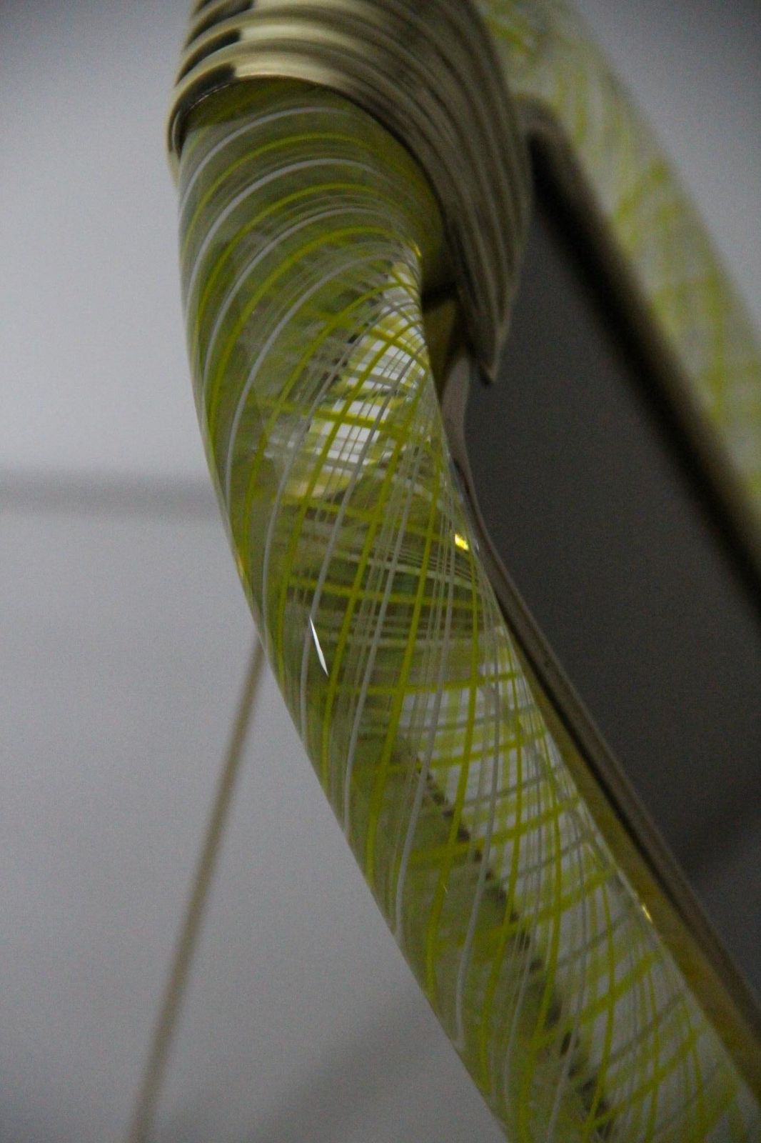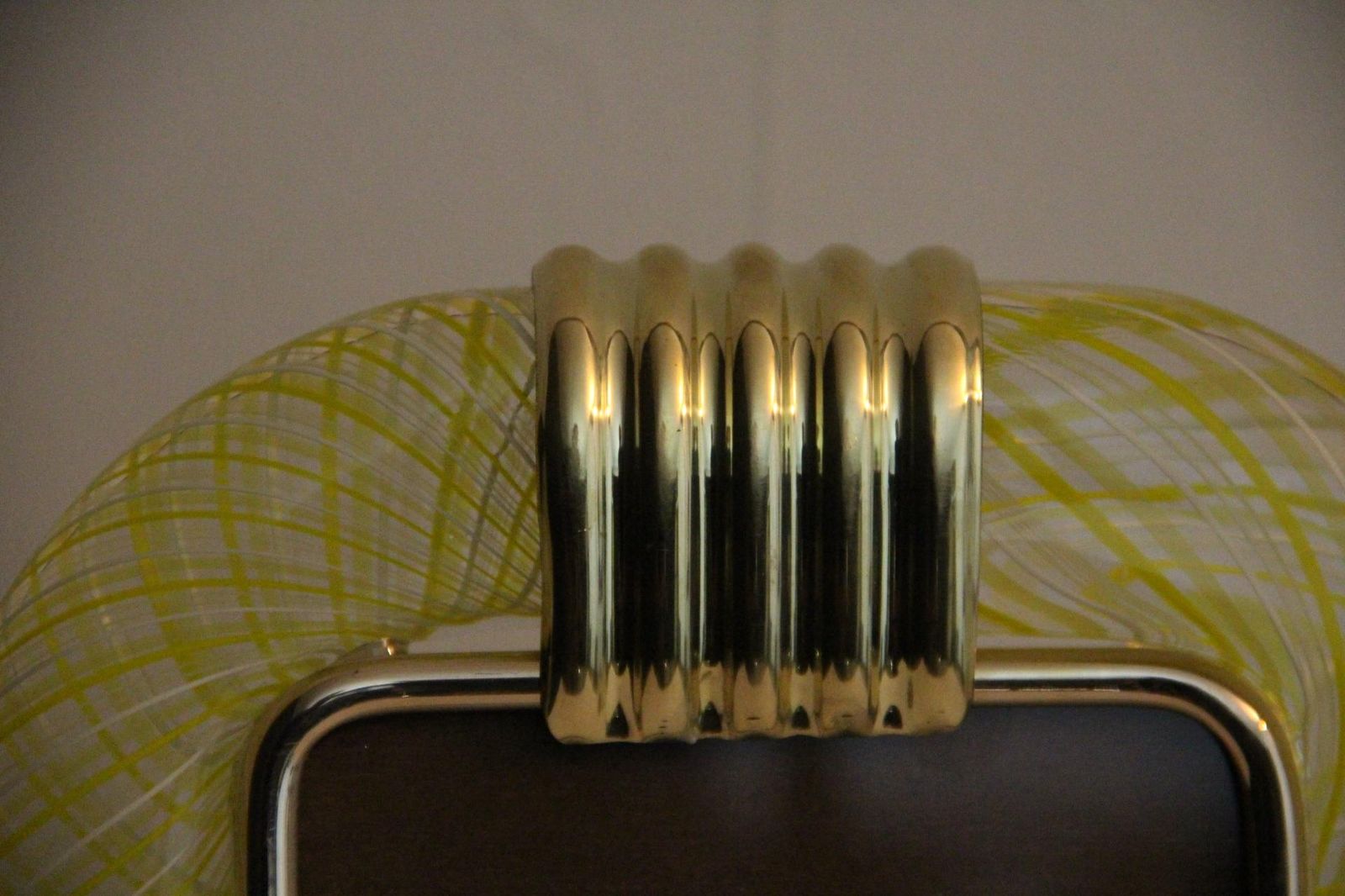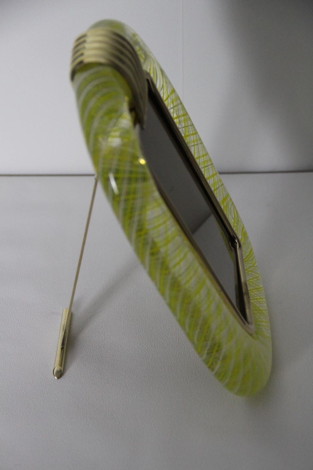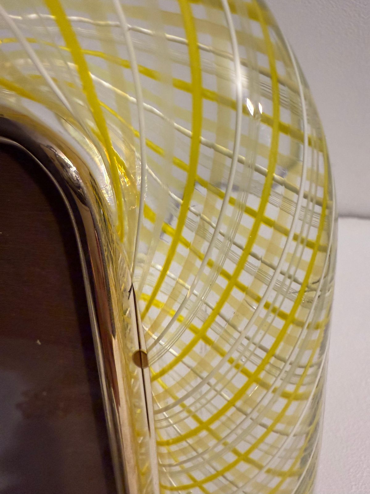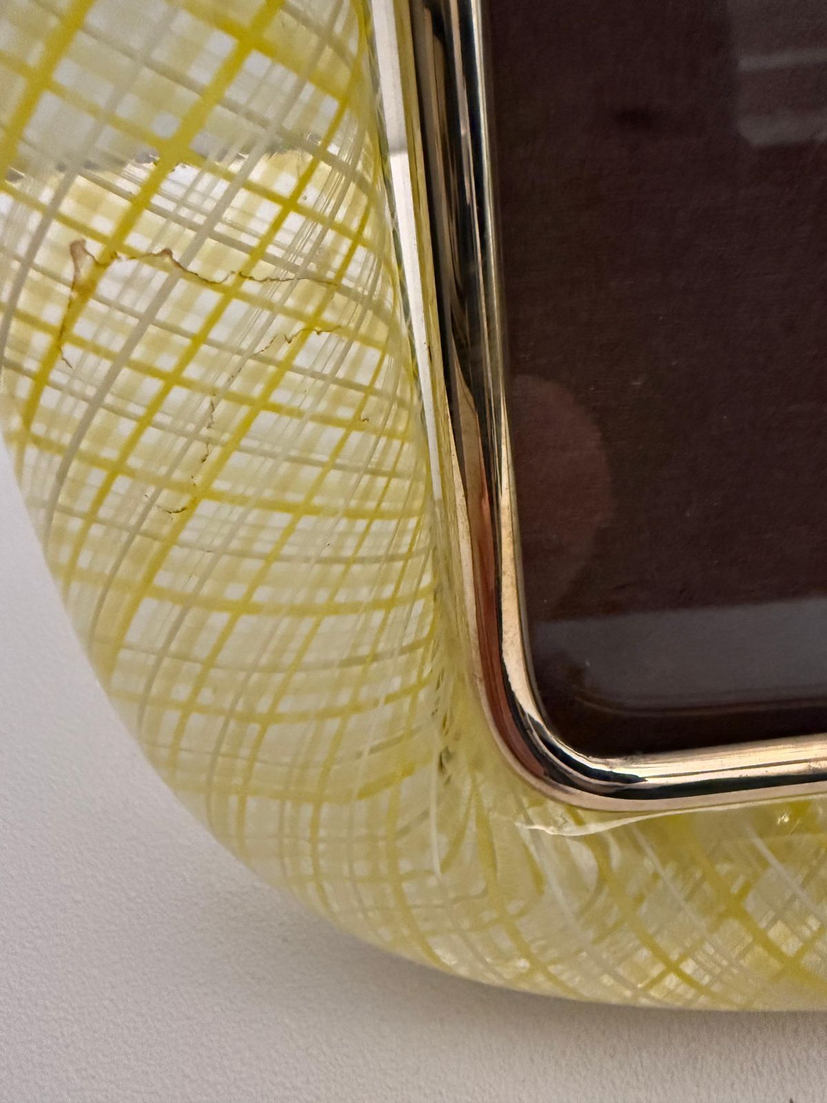 Ce magnifique cadre photo vertical est purement dans la tradition de la fabrication du verre vénitien tradition. La technique utilisée pour obtenir ce riche effet optique est appelée filigrana et nécessite des artisans hautement qualifiés. Ce cadre photo est composé de verre de Murano jaune-vert d’une couleur très vivante, recouvert de cristal. De fines lignes jaunes et blanches s’enroulent autour du cadre en verre de cristal comme des fils très fins.