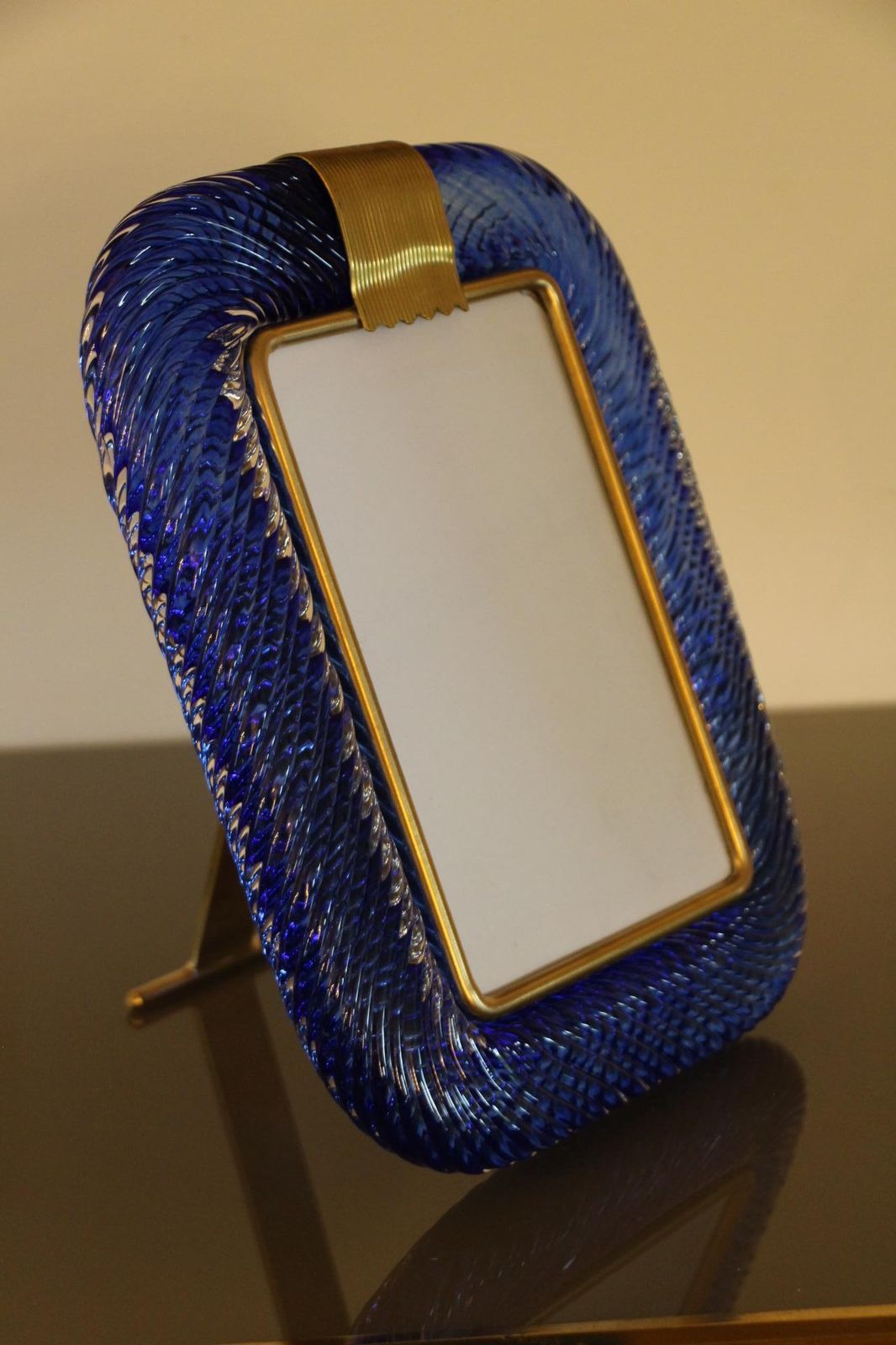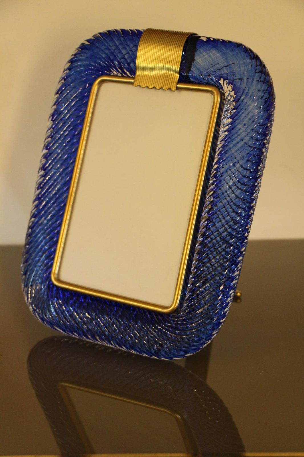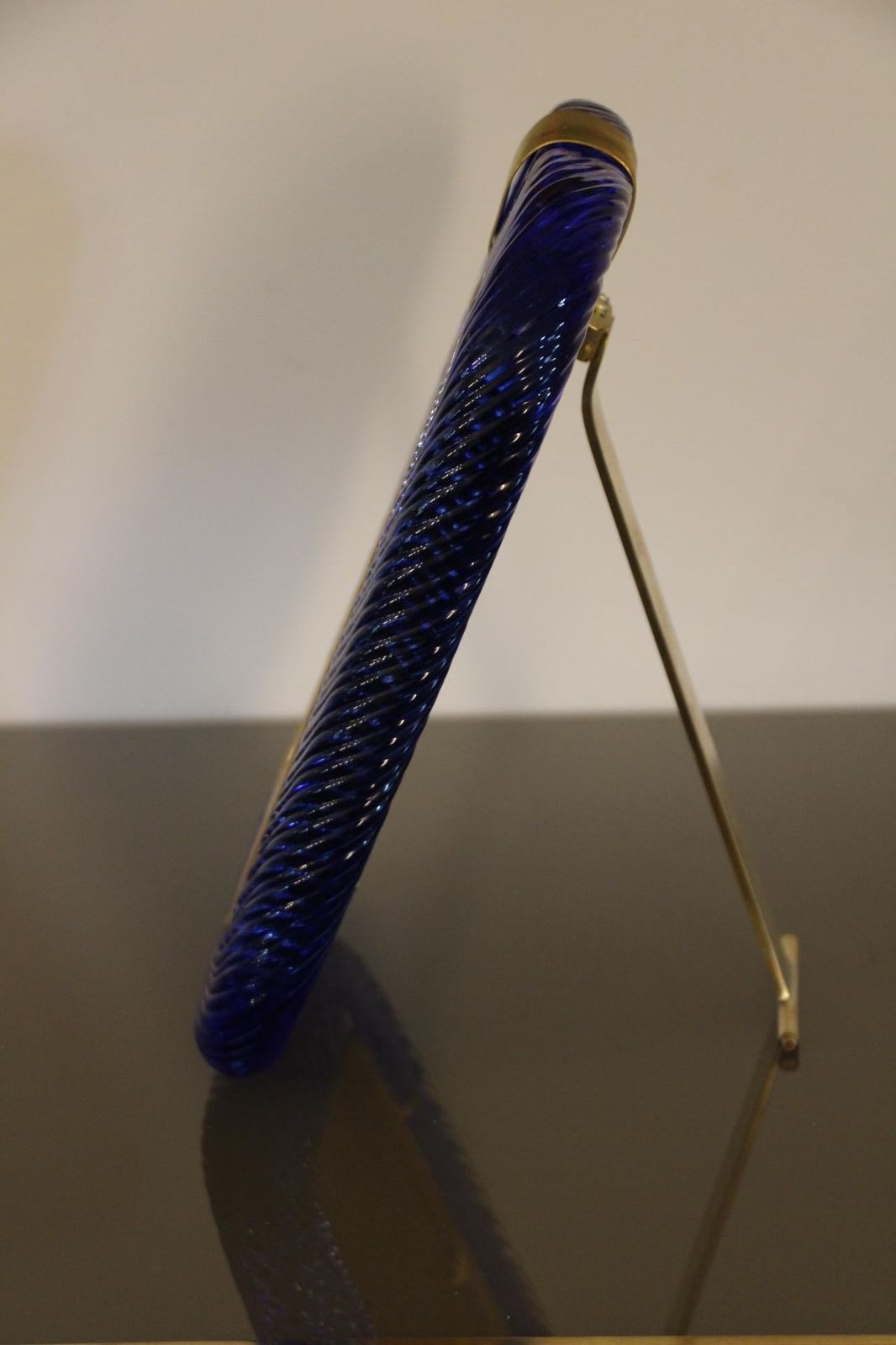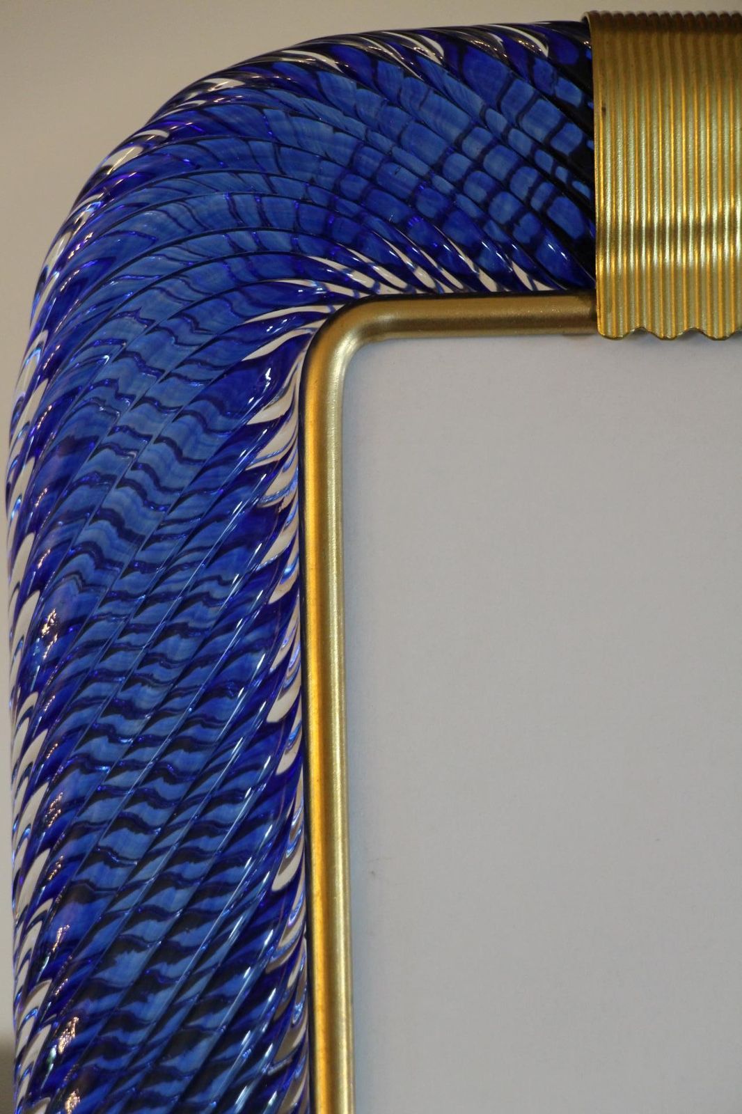 Ce magnifique cadre photo vertical est purement dans la tradition de la fabrication du verre vénitien. La technique utilisée pour obtenir ce riche effet de corde torsadée est appelée « torciglione » et requiert des artisans hautement qualifiés. Ce cadre photo est en verre soufflé de Murano d’un bleu saphir très vif, recouvert de cristal. Il peut être assorti à des intérieurs vintage, classiques, art déco, mid century ou contemporains et sera parfait pour orner vos bibliothèques, vos consoles, vos étagères ou vos coffres.