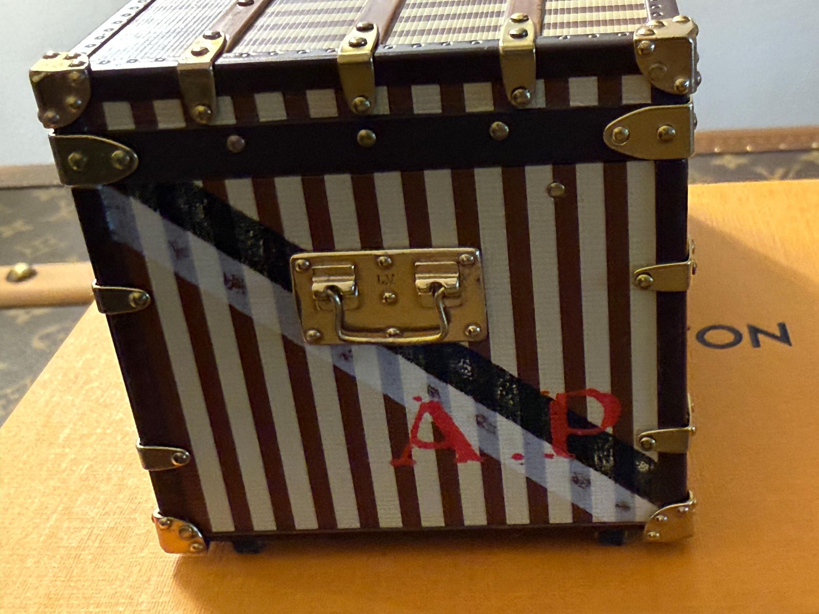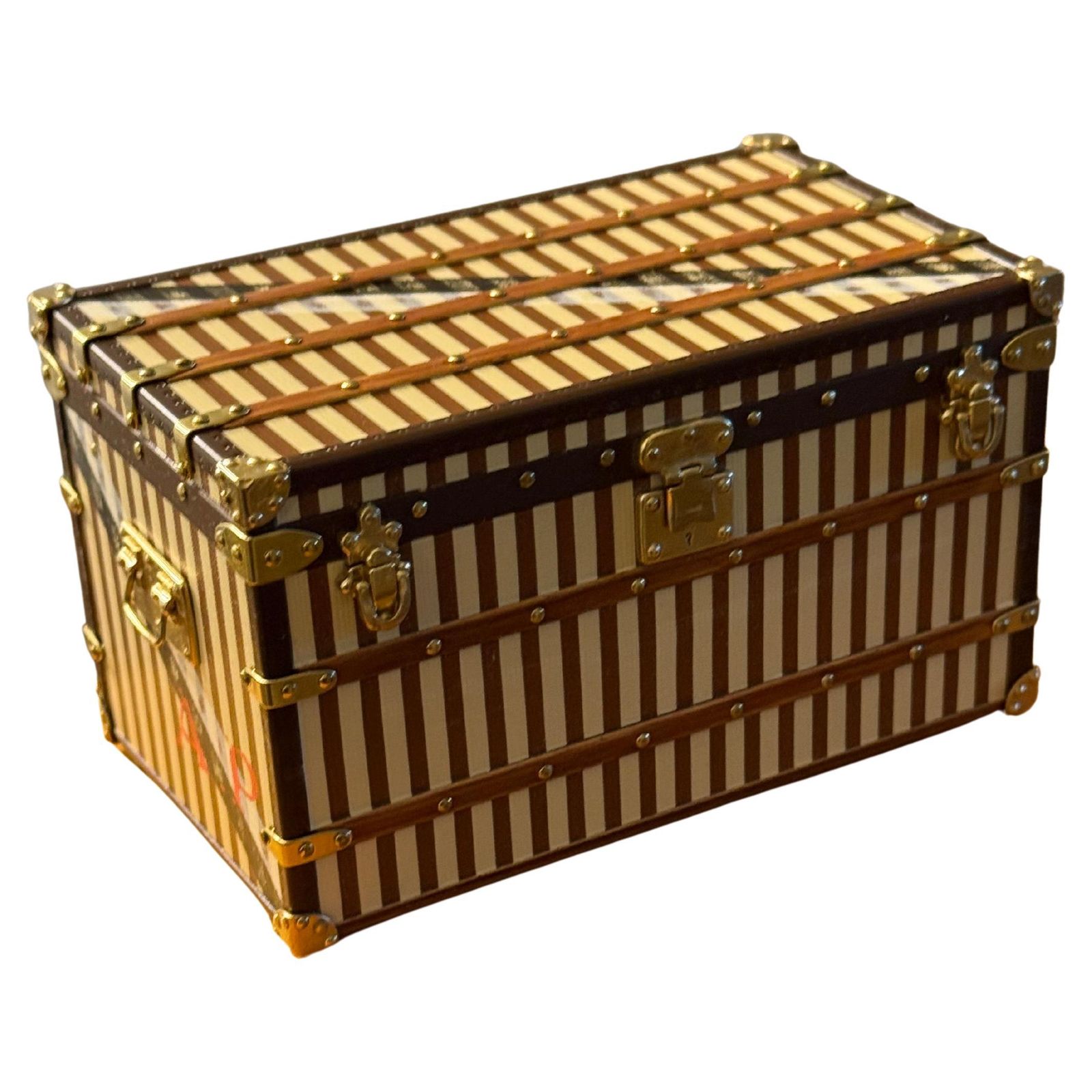 Ce magnifique presse-papier Louis Vuitton est entièrement réalisé en métal lithographié. Il arbore les lettres « A » et « P » à chaque extrémité, ainsi que des rayures peintes sur mesure. Son extérieur présente le motif à rayures emblématique, avec des charnières, une serrure et des fermoirs fonctionnels en laiton. Ses poignées latérales se déplient également. Cette superbe pièce reprend tous les détails raffinés des malles Vuitton grandeur nature.
