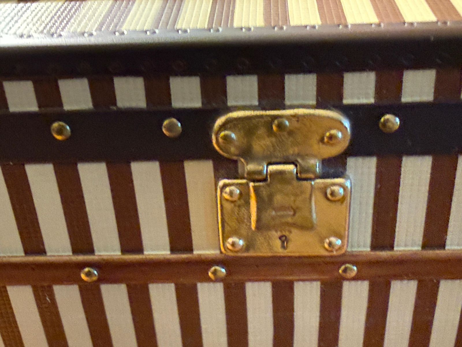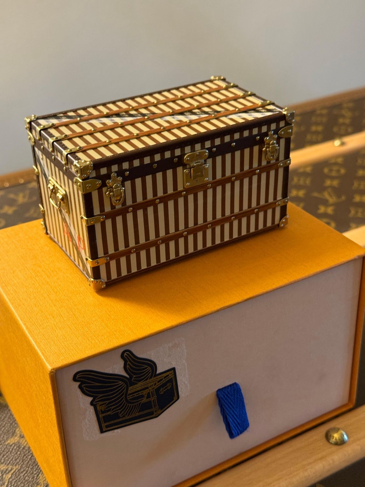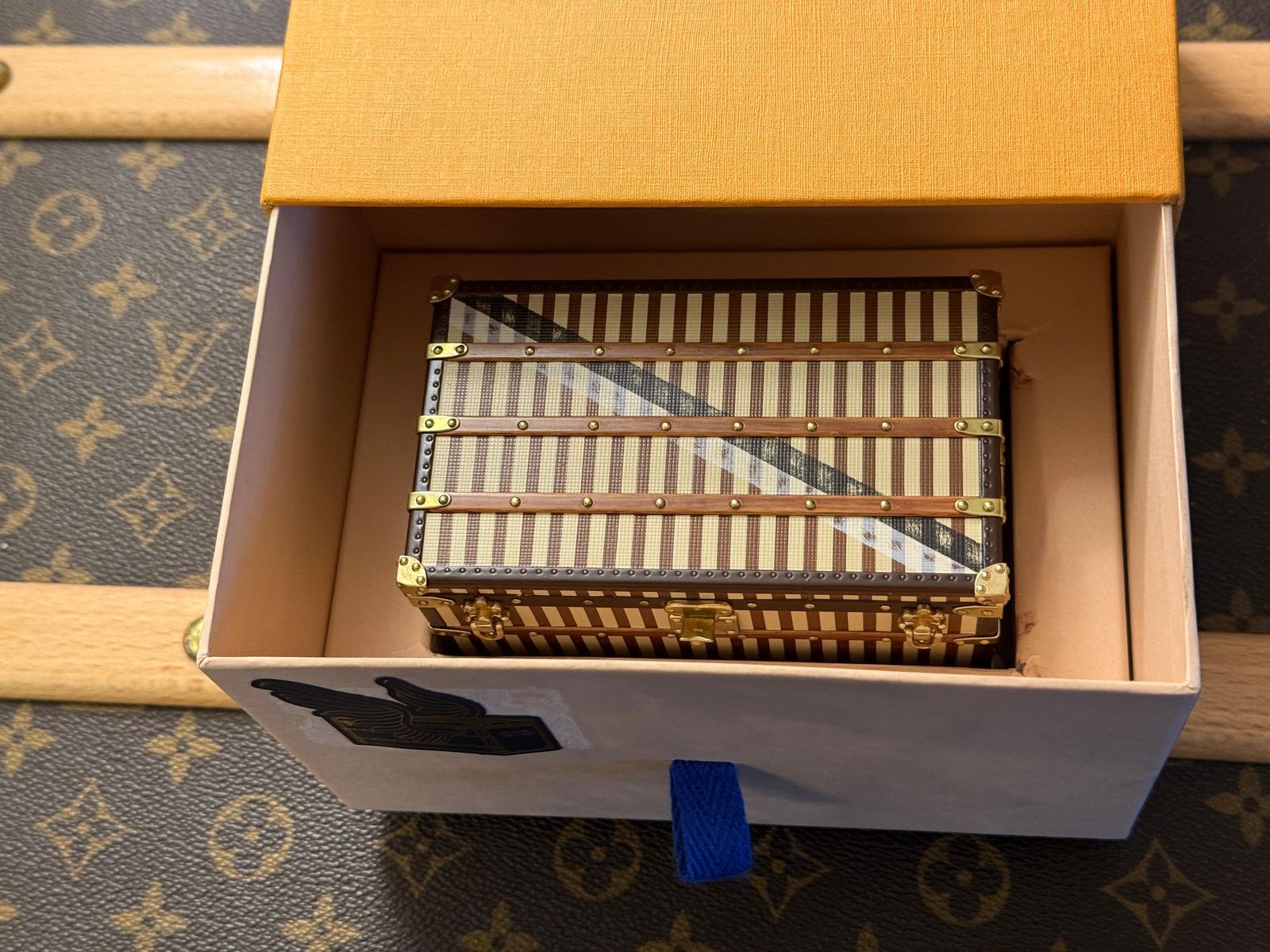 Quant à son intérieur, il est doublé de coton ivoire et comporte deux plateaux amovibles. Il présente un ruban rouge à l’intérieur du couvercle ainsi qu’une étiquette Louis Vuitton d’époque correspondante. Cette mini-malle à rayures de 2013 est une parfaite miniature d’un modèle de 1888, la malle courrier, fidèlement réduite à l’échelle 1/7. Cette mini-malle Louis Vuitton a été fabriquée en 2013 en tant que cadeau VIP très rare et n’a jamais été commercialisée par Vuitton. Elle peut servir de presse-papier très chic ou de petite boîte à bijoux très exclusive. Ses dimensions sont de 60 mm x 70 mm x 110 mm. Elle est livrée avec son coffret Louis Vuitton d’origine.