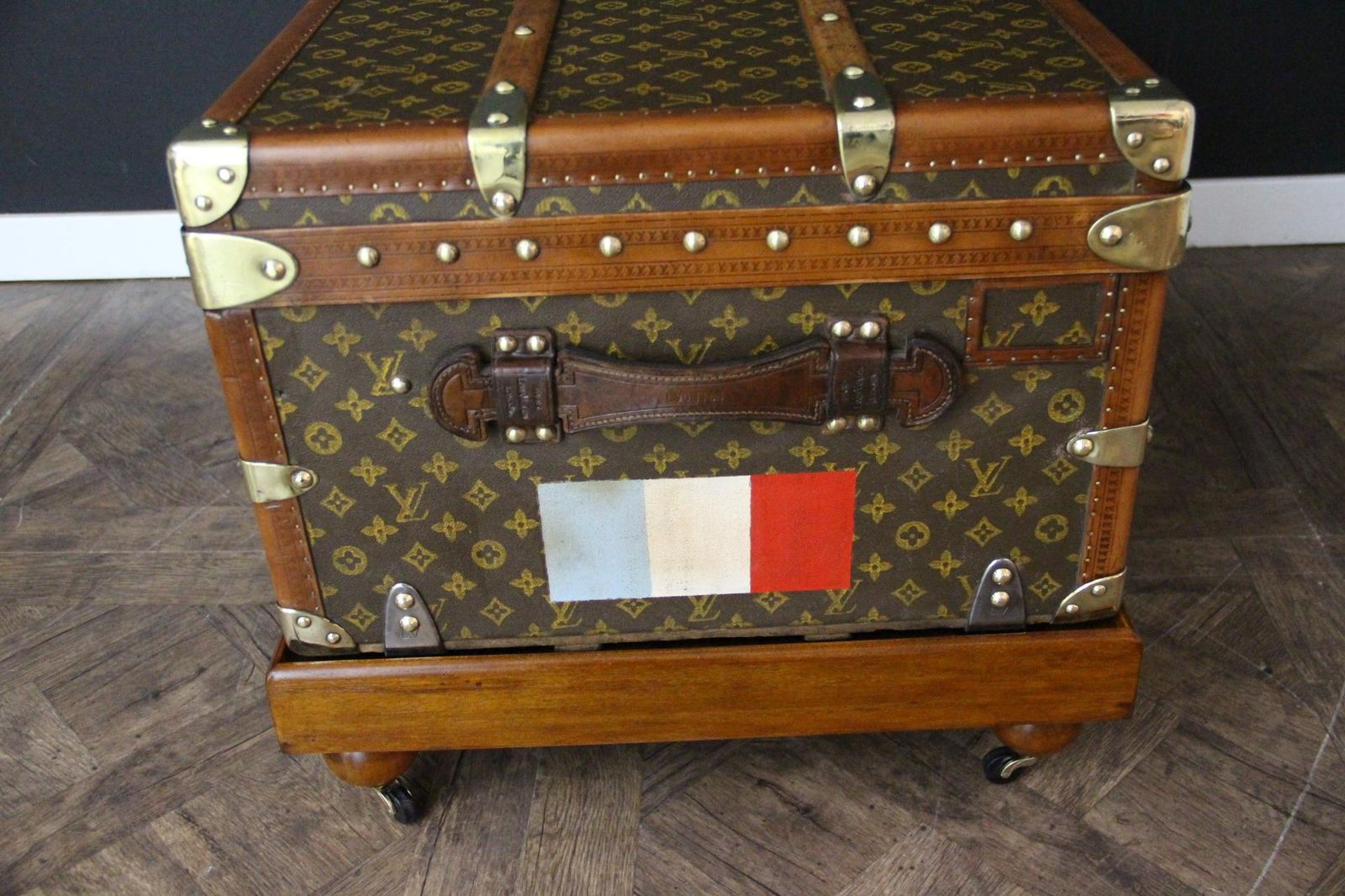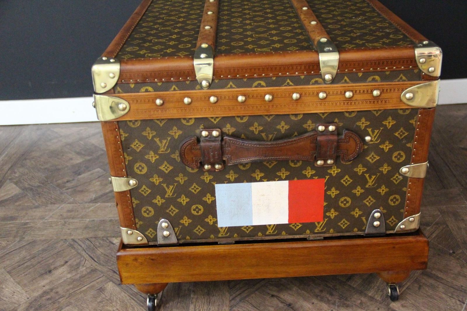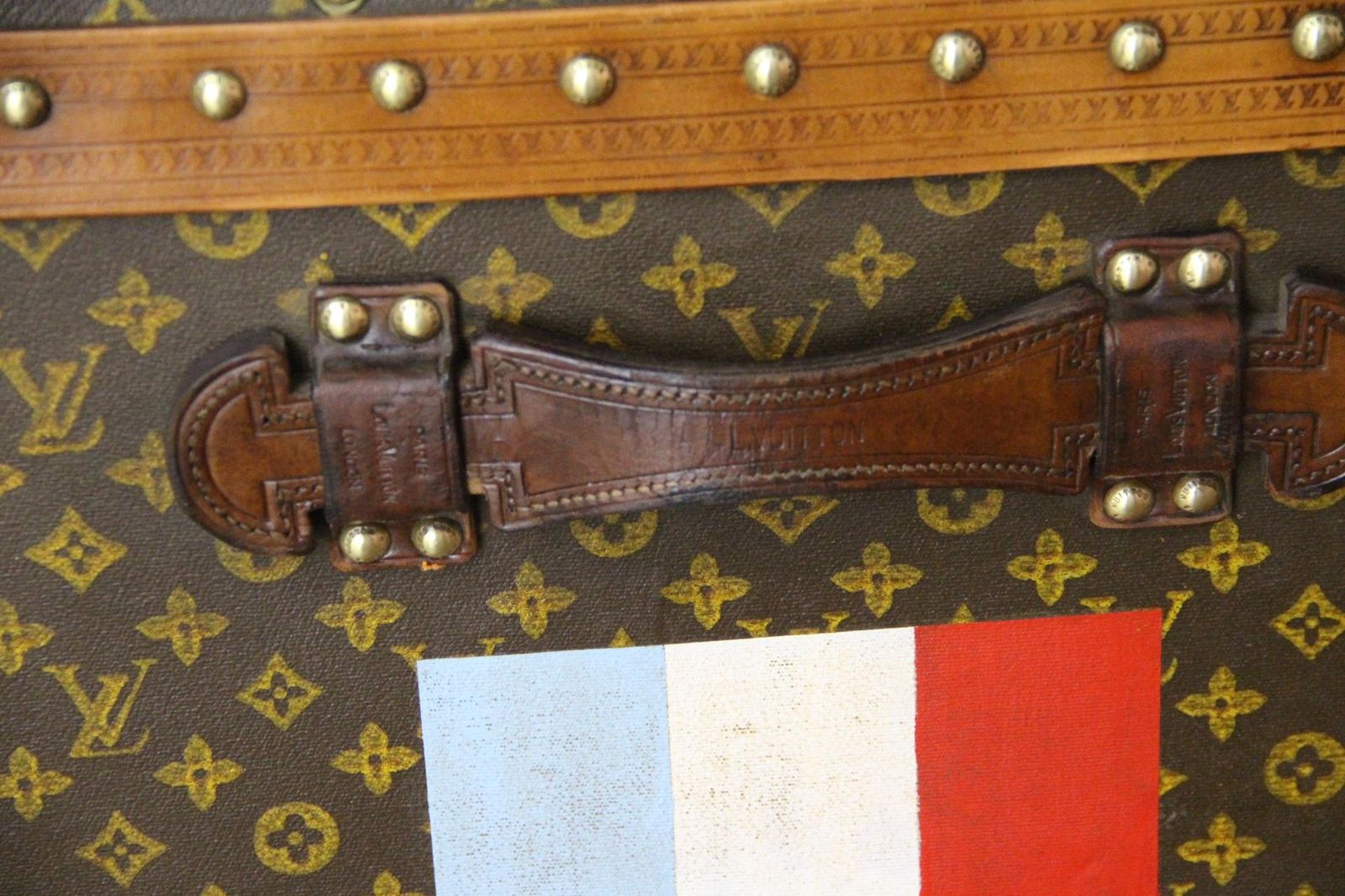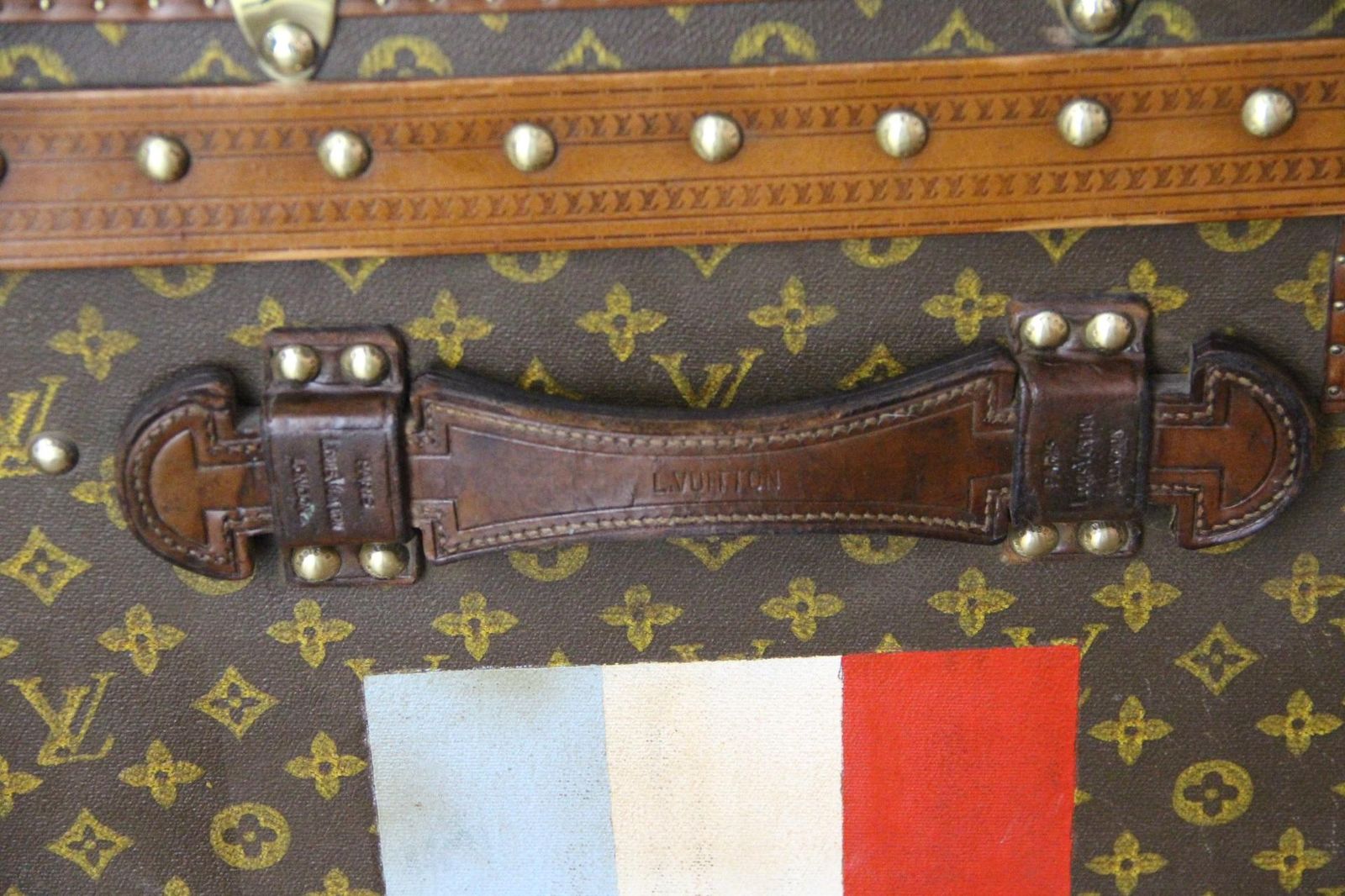 Cette superbe malle Louis Vuitton cabine est très rare. En effet, ses dimensions sont réduites pour une malle cabine puisqu’elle ne mesure que 90 cm de large. Cette malle Vuitton se caractérise par une toile Monogramme peinte à la main au pochoir, des bordures « lozine » de couleur miel clair, des serrures et fermoirs en laiton massif estampillés Louis Vuitton, des clous estampillés Louis Vuitton ainsi que de larges poignées latérales en cuir. Sa patine est chaleureuse et élégante. Le drapeau français peint à la main sur les deux côtés lui confère une touche unique et élégante.