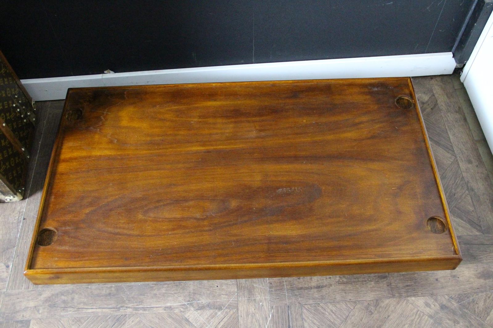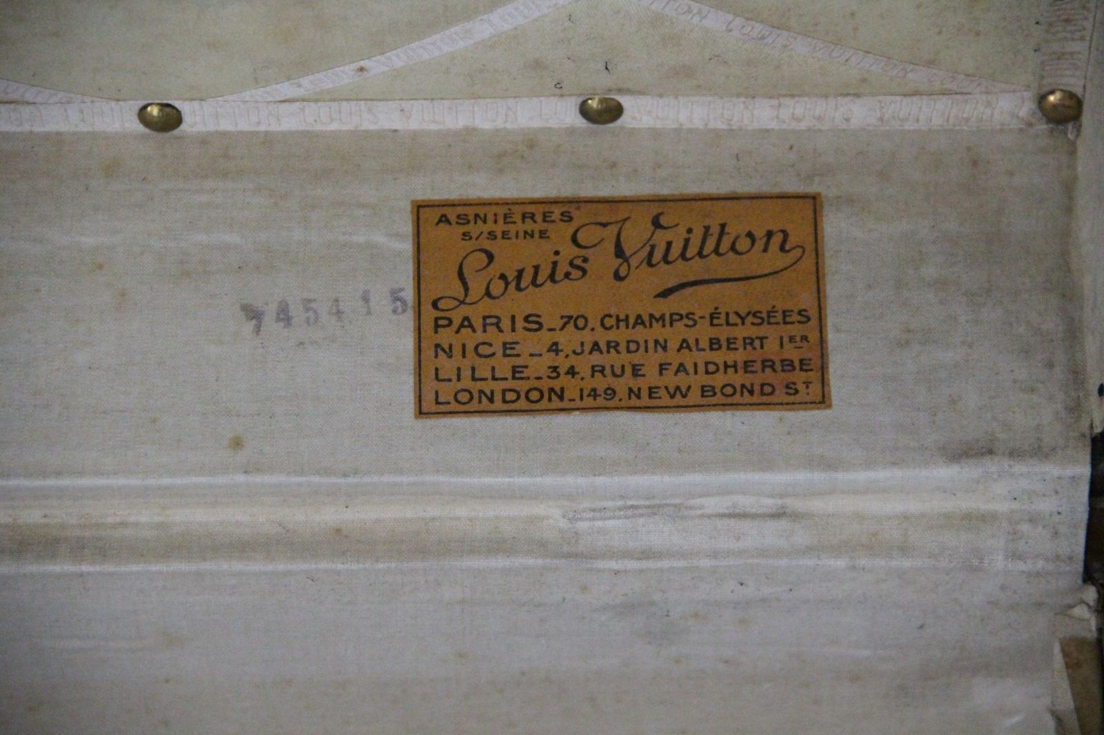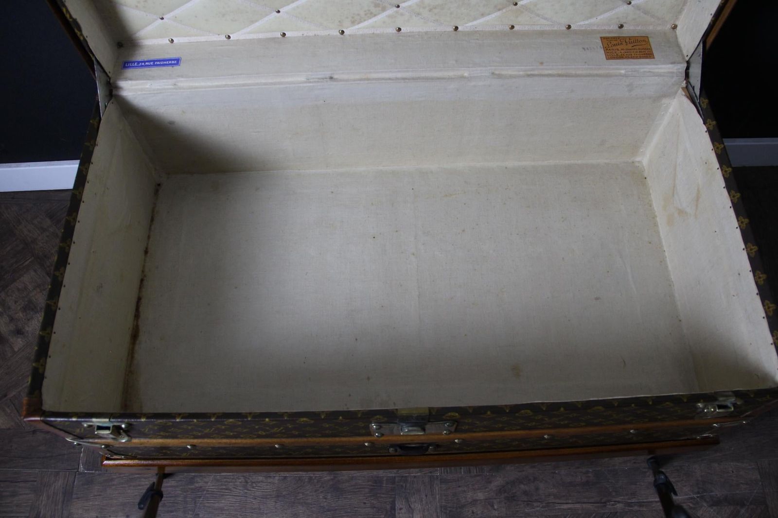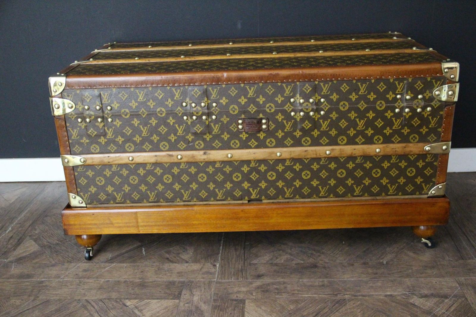 L’intérieur est d’origine, avec la doublure d’origine ainsi que le capiton d’origine sous son capot, et elle a également conservé son étiquette Louis Vuitton ainsi que son numéro de série. Comme elle a plus de 100 ans, elle présente de légères taches, comme on peut le voir sur les photos, mais rien de grave. Il n’y a pas d’odeur. L’intérieur est propre et en bon état. Le fond extérieur a pu conserver sa toile Monogram d’origine. Elle pourrait servir de table basse très élégante et spectaculaire ou de coffre à couvertures au pied d’un lit. Veuillez noter que cette malle Vuitton ne mesure que 33 cm de haut, mais grâce à son socle en bois réalisé sur mesure, elle atteint 50 cm de haut, une hauteur parfaite pour une table basse.