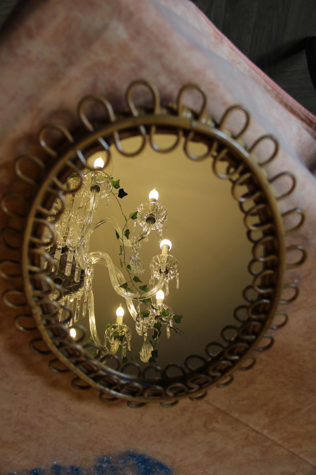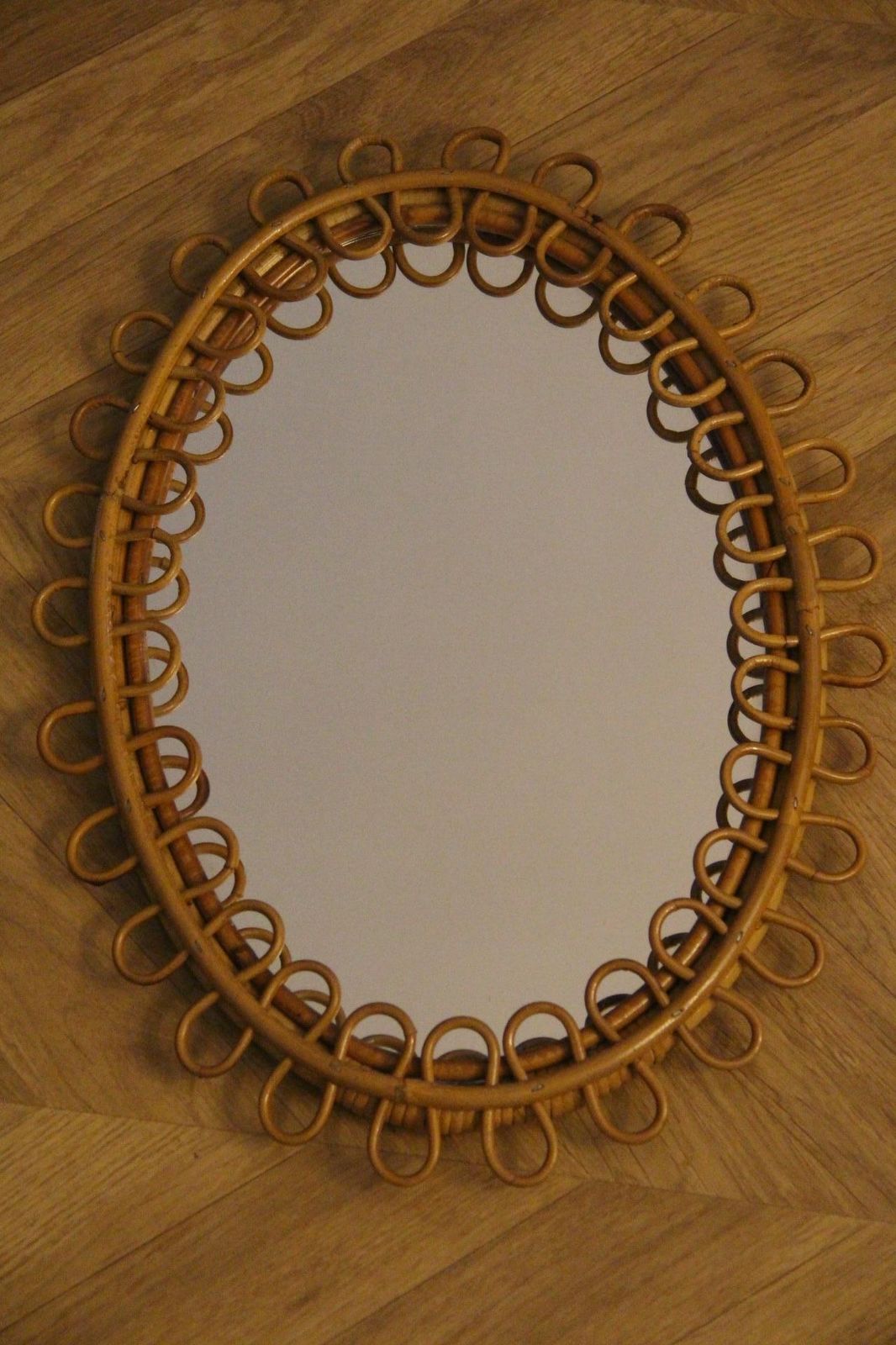 Ce miroir très décoratif a été fabriqué en Italie dans les années 1960. Il présente un design typique de cette époque et est entièrement d’origine. Il a été fabriqué à la main et est en parfait état. Il arbore une belle forme ovale. De plus, sa couleur est magnifique et chaleureuse : un ton miel doré. Il peut être accroché seul au mur ou associé à d’autres miroirs du même style pour créer un effet spectaculaire.