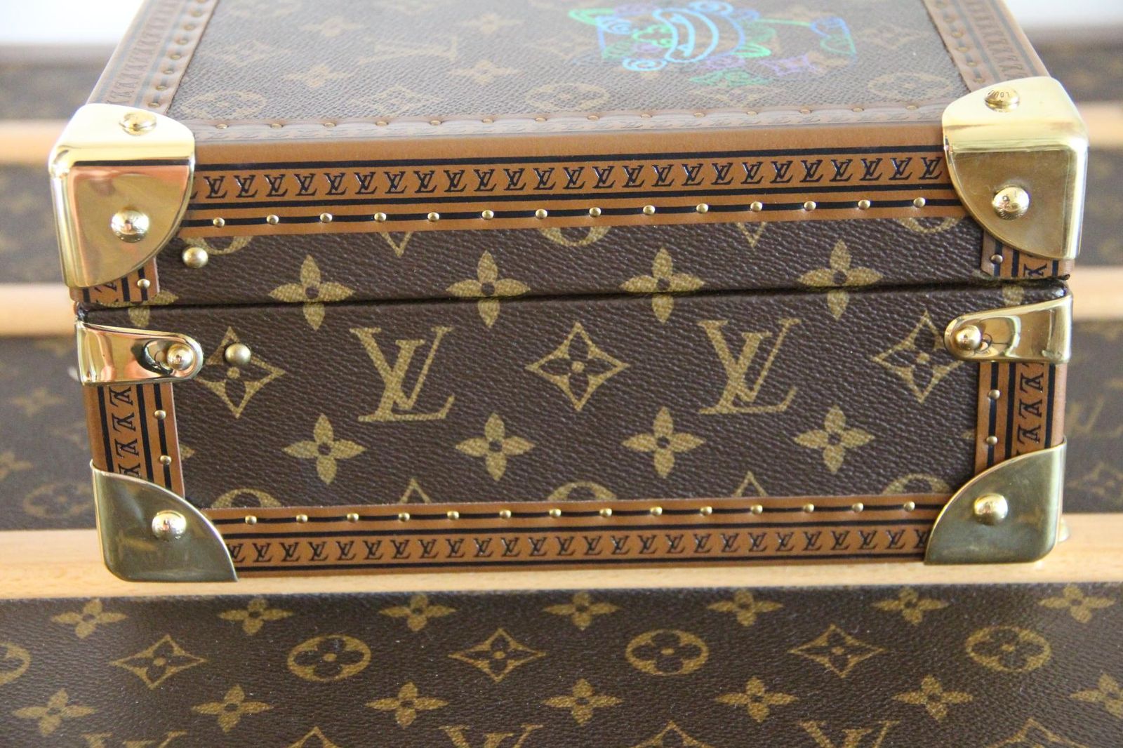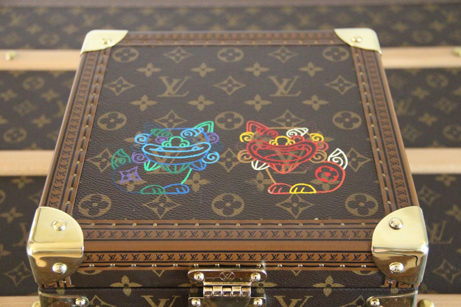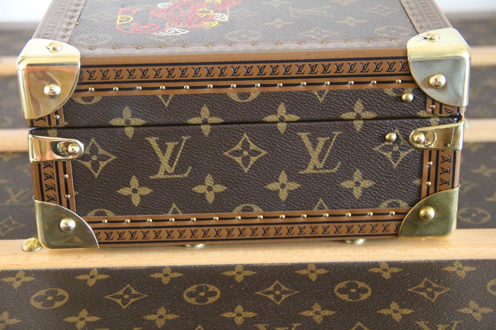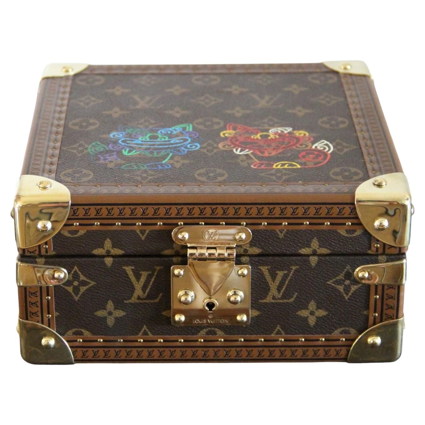 Ce coffret Louis Vuitton à bijoux, en toile monogram, a bénéficié d’une customisation à décor de 2 chats stylisés peints à la main et témoigne du savoir-faire emblématique de la maison. Cette petite malle à bijoux allie l’attrait intemporel des bagages Louis Vuitton à un rangement intérieur fonctionnel, ce qui en fait une pièce exceptionnelle pour les collectionneurs et les amateurs de design. Faite dans la célèbre toile enduite Monogram avec une bordure en cuir naturel, cette petite malle Louis Vuitton est dotée de ferrures en laiton brillant, de coins renforcés et de la fermeture en S classique de la marque.