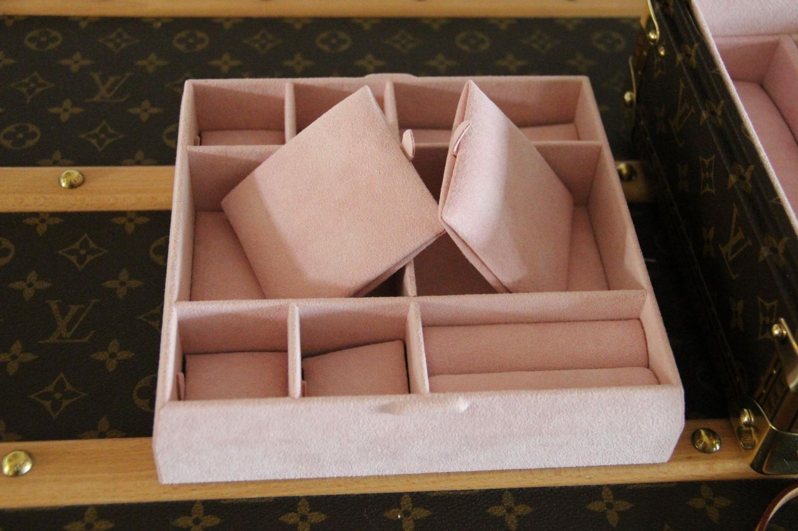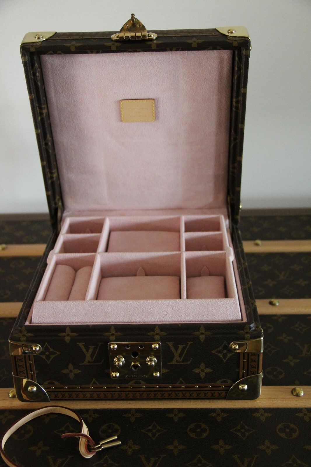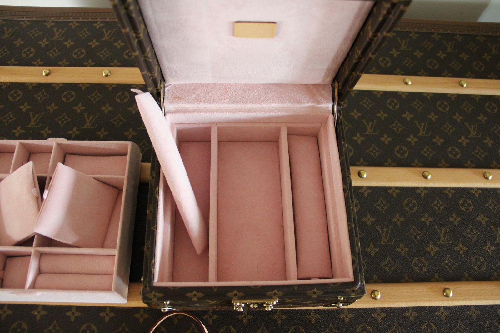 La caractéristique la plus remarquable est l’œuvre d’art peinte à la main sur le capot, qui ajoute de la personnalité et de la valeur artistique à cette pièce déjà rare. L’intérieur est doublé de d’alcantara rose poudré et comporte de multiples compartiments pour les bagues, les boucles d’oreilles, les bracelets et les petits accessoires. Un plateau amovible révèle un espace de rangement supplémentaire en dessous, ce qui permet de l’utiliser à la fois comme coffret à bijoux de voyage et comme vanity case de luxe. Il est accompagné de ses deux clés d’origine.