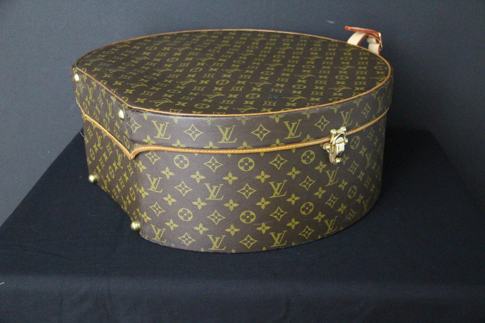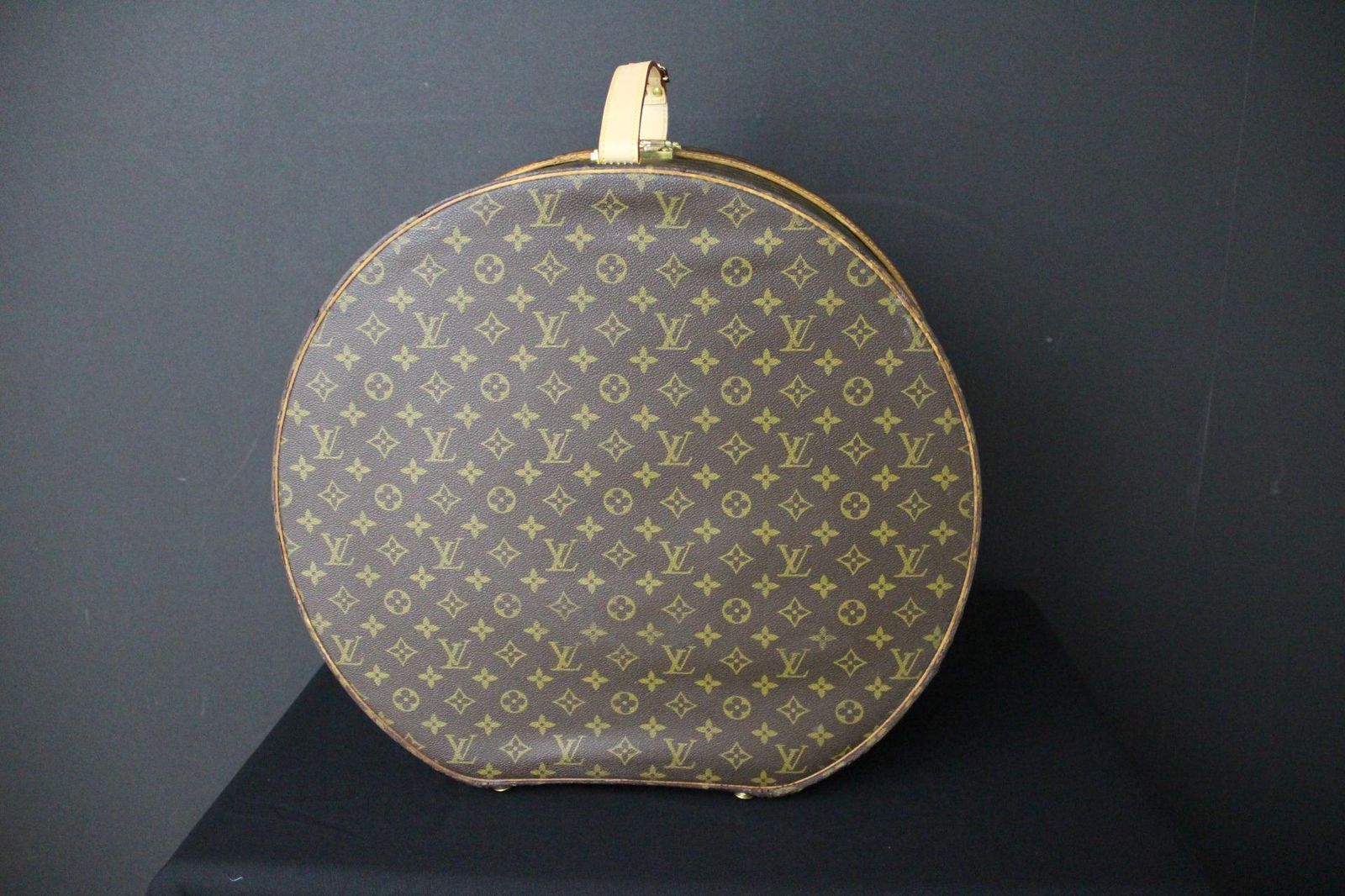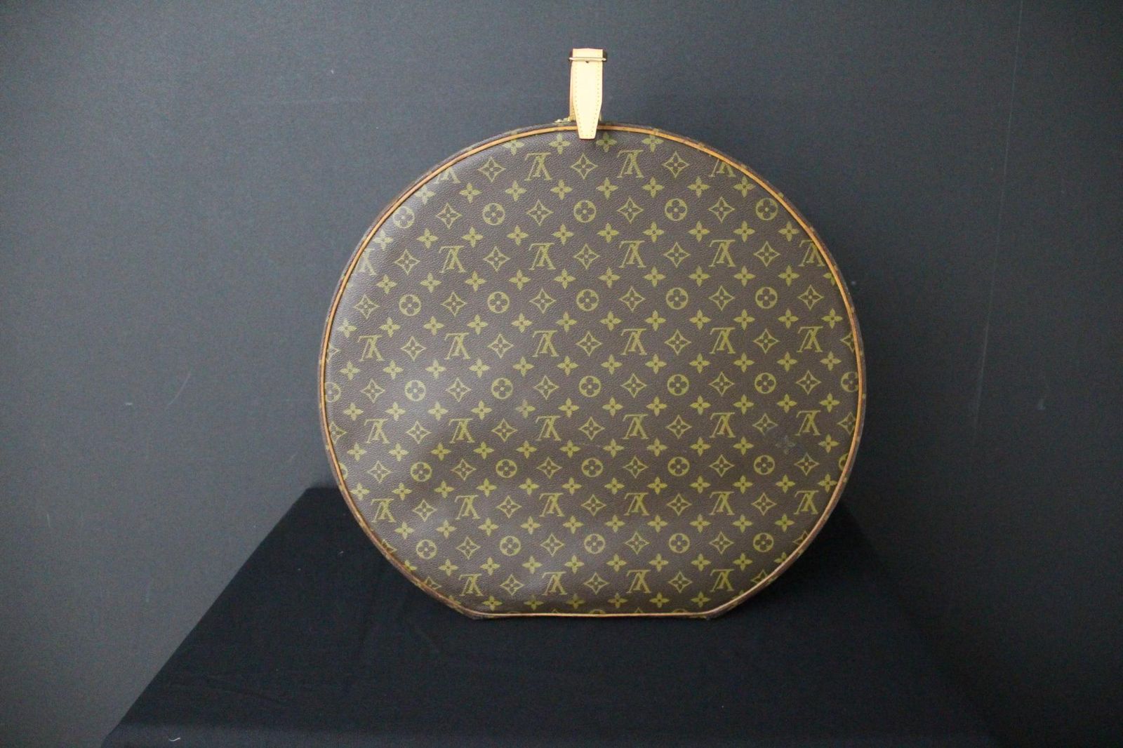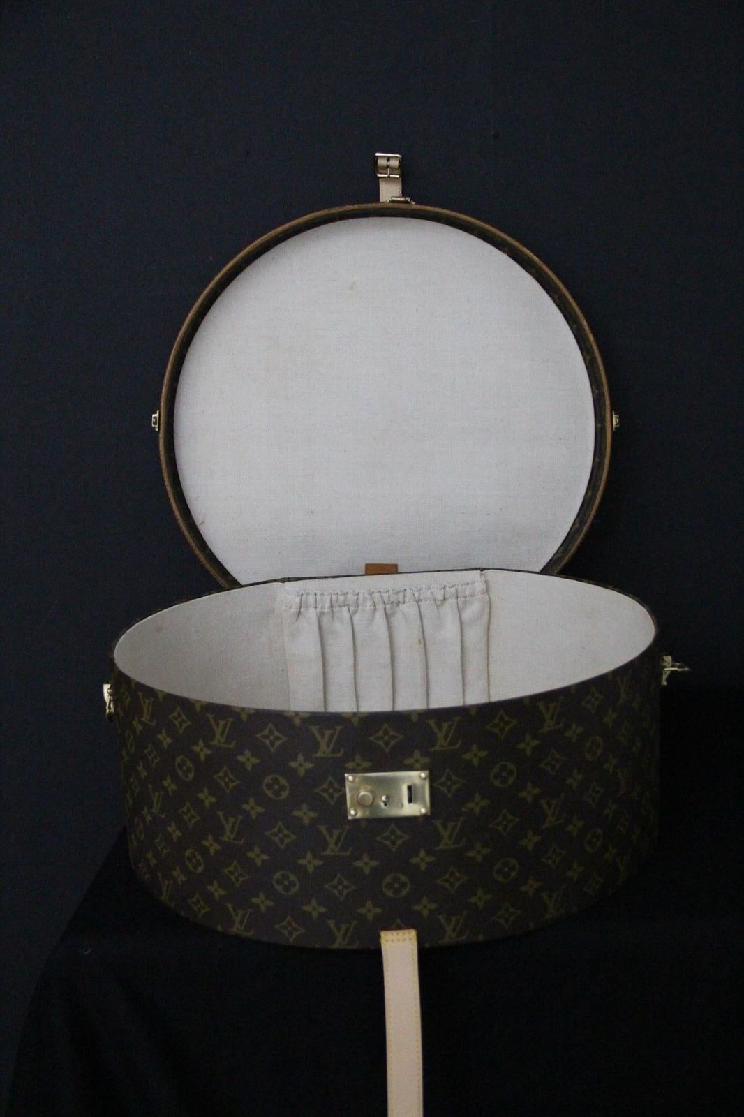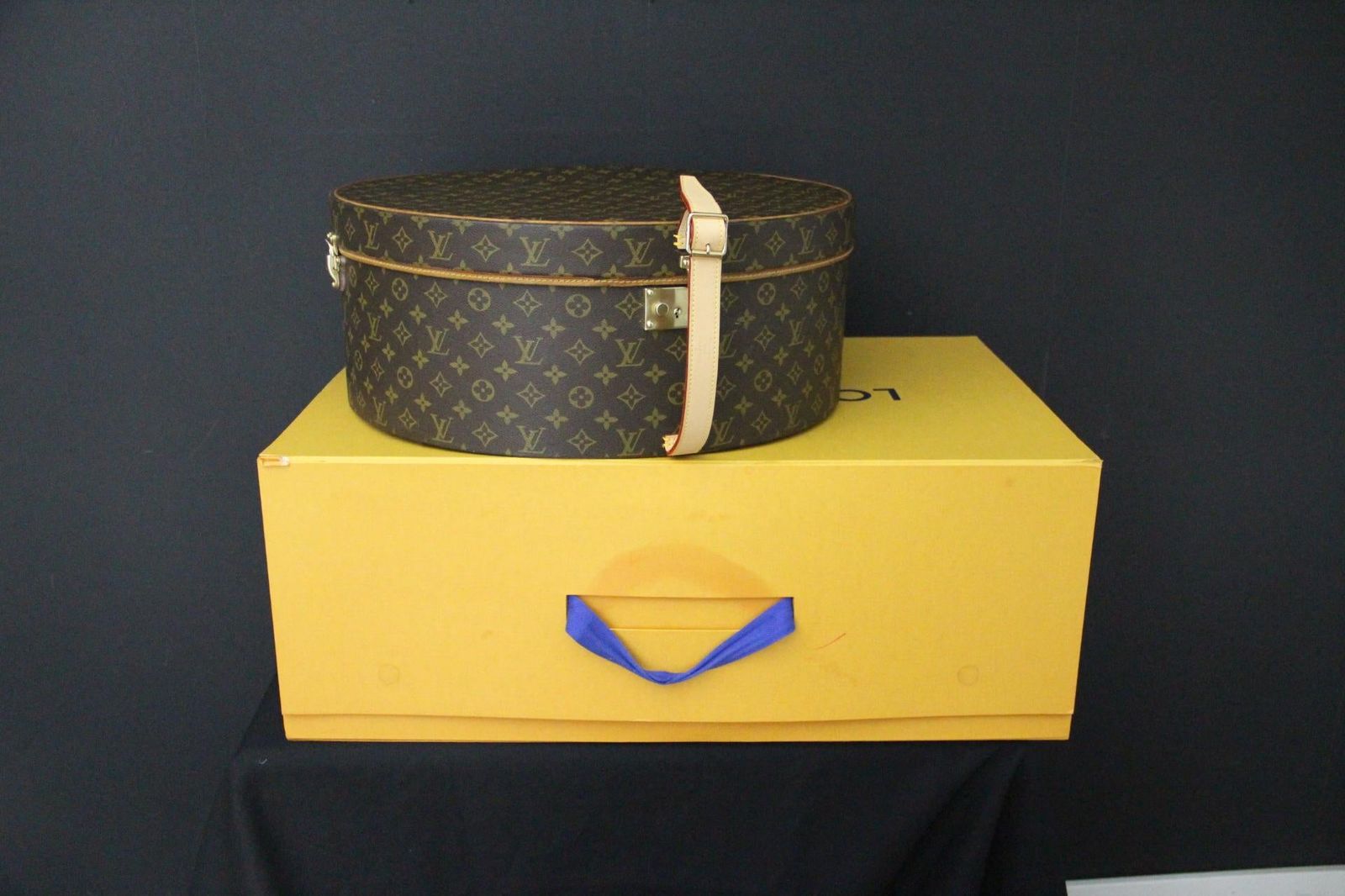Cette magnifique boîte à chapeaux Louis Vuitton Monogram d’occasion est composée d’une structure en bois recouverte de toile Monogram et renforcée par du cuir naturel. Elle est équipée d’une sangle en cuir réglable. Elle présente un fermoir en laiton et deux fermoirs en laiton estampillés Louis Vuitton sur les côtés.