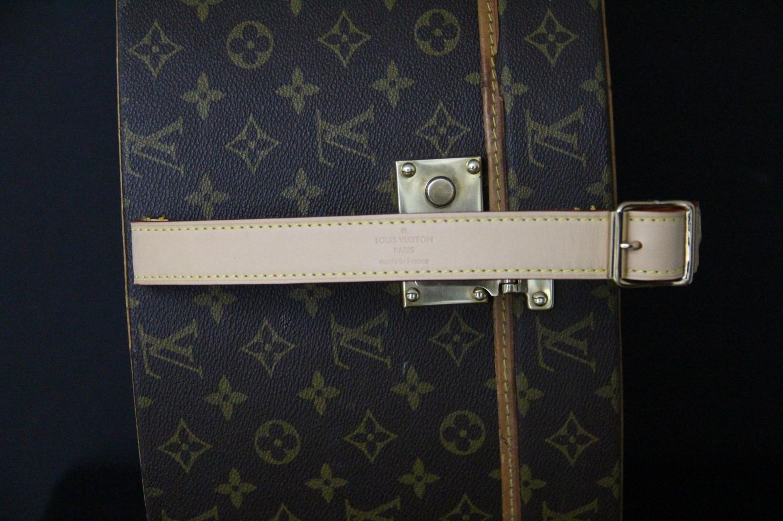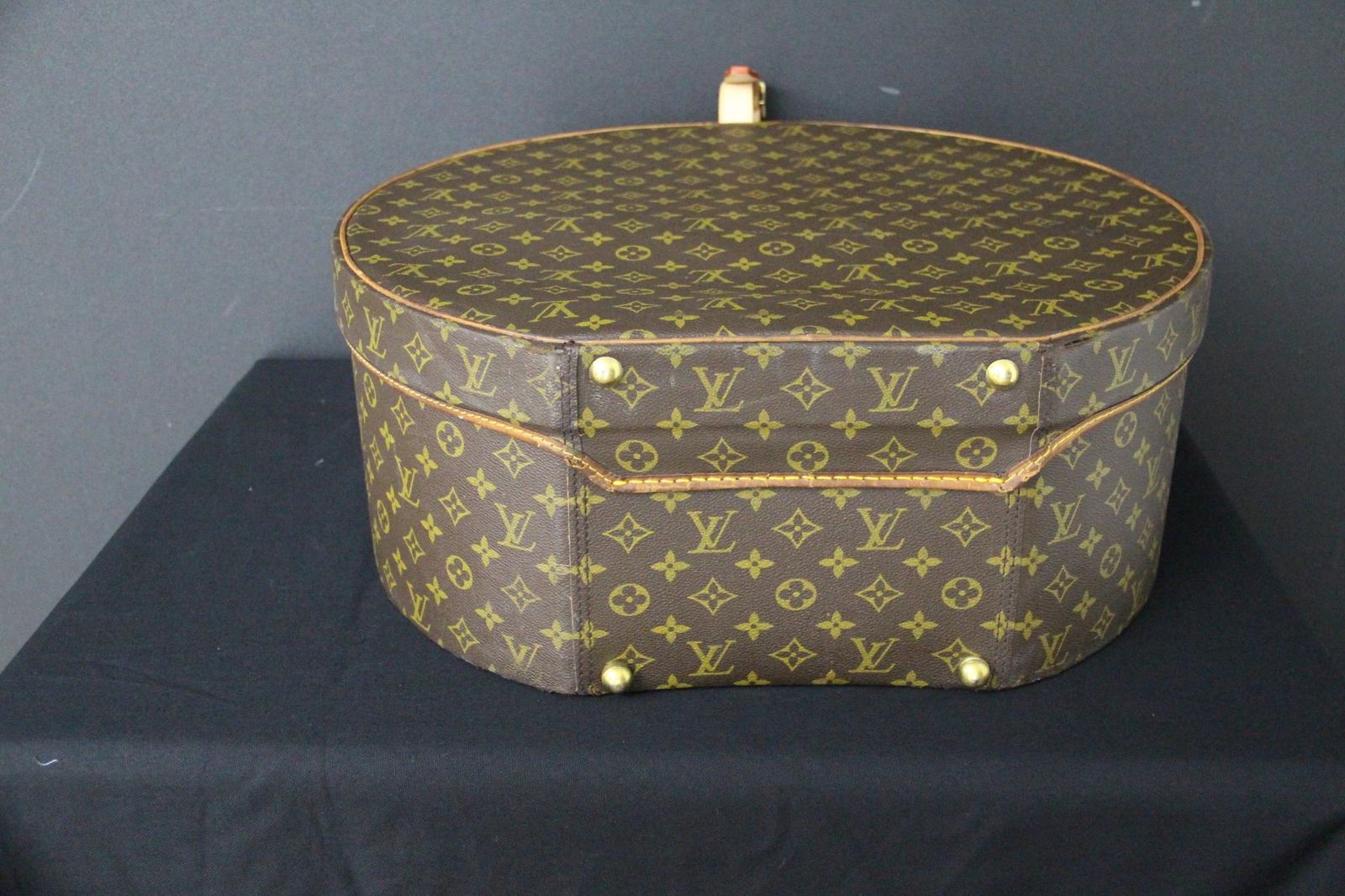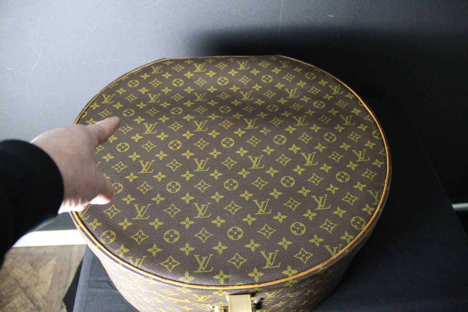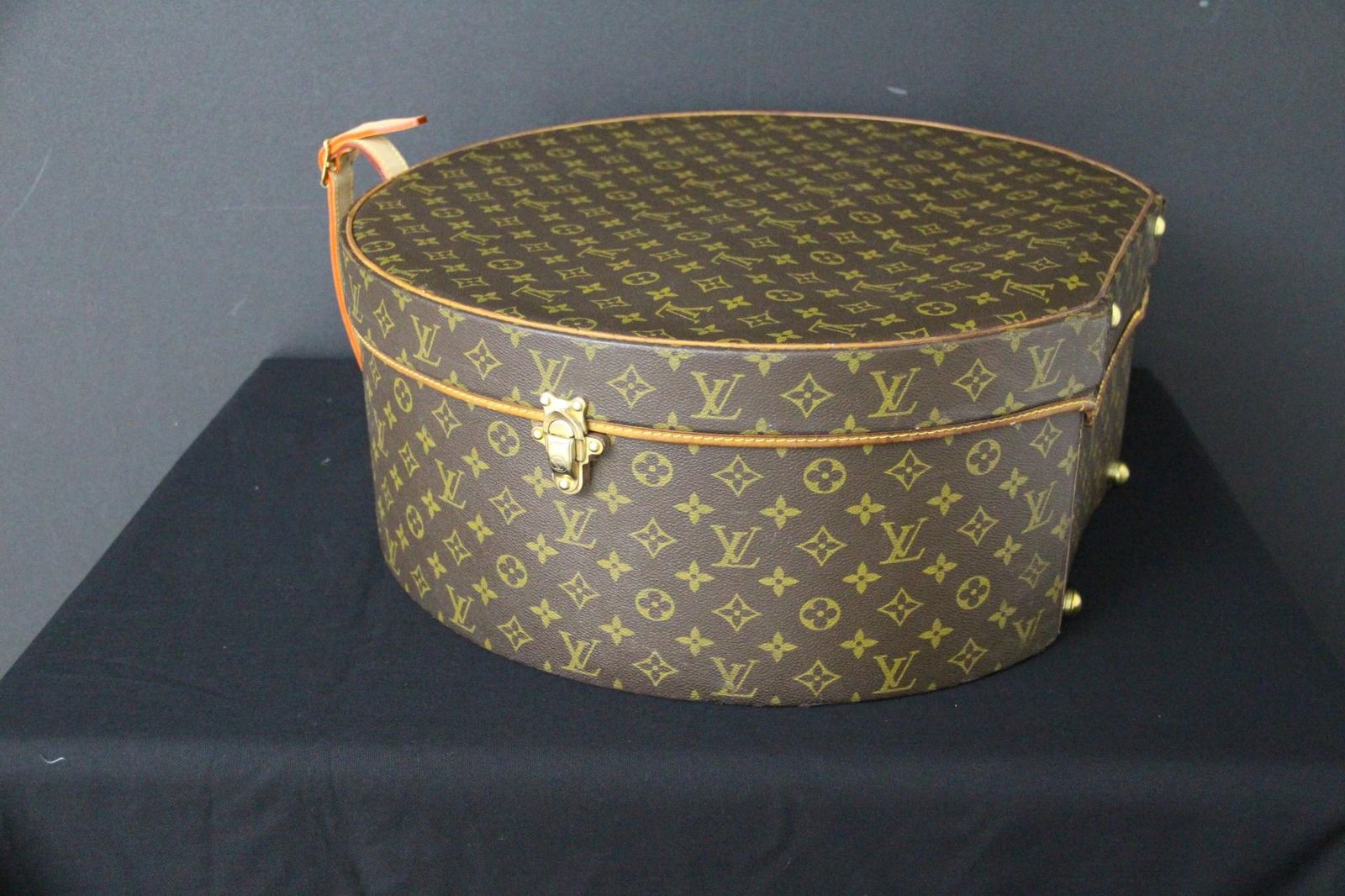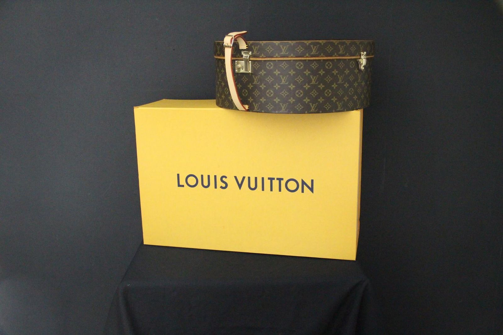 Cette magnifique boîte à chapeaux Louis Vuitton Monogram d’occasion est composée d’une structure en bois recouverte de toile Monogram et renforcée par du cuir naturel. Elle est équipée d’une sangle en cuir réglable. Elle présente un fermoir en laiton et deux fermoirs en laiton estampillés Louis Vuitton sur les côtés.