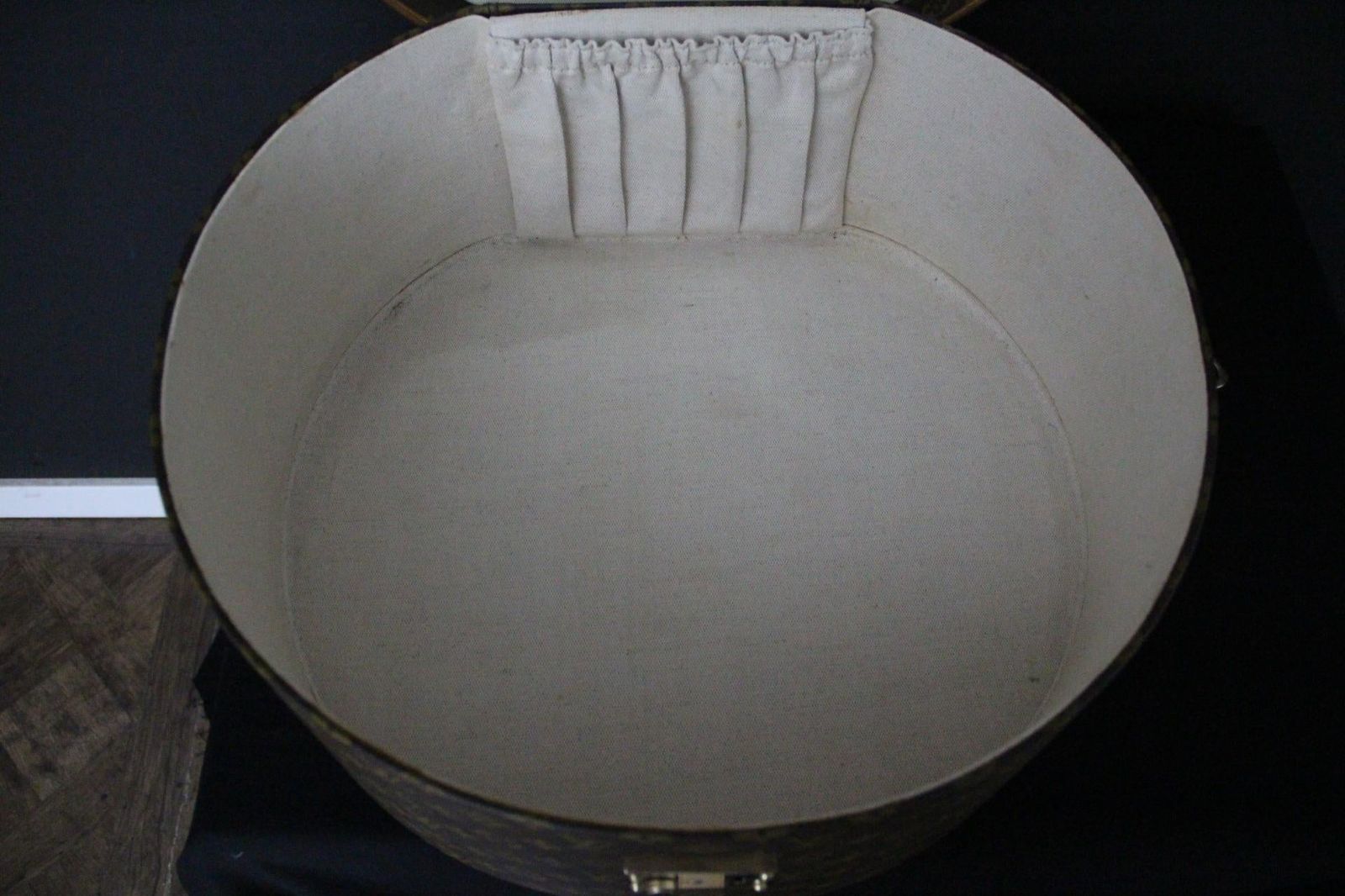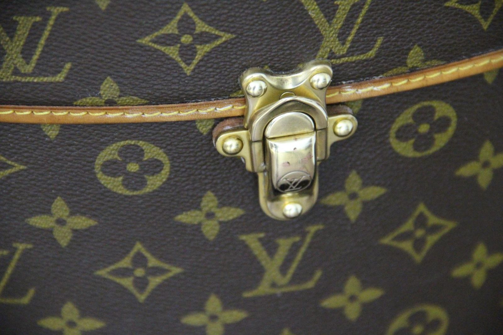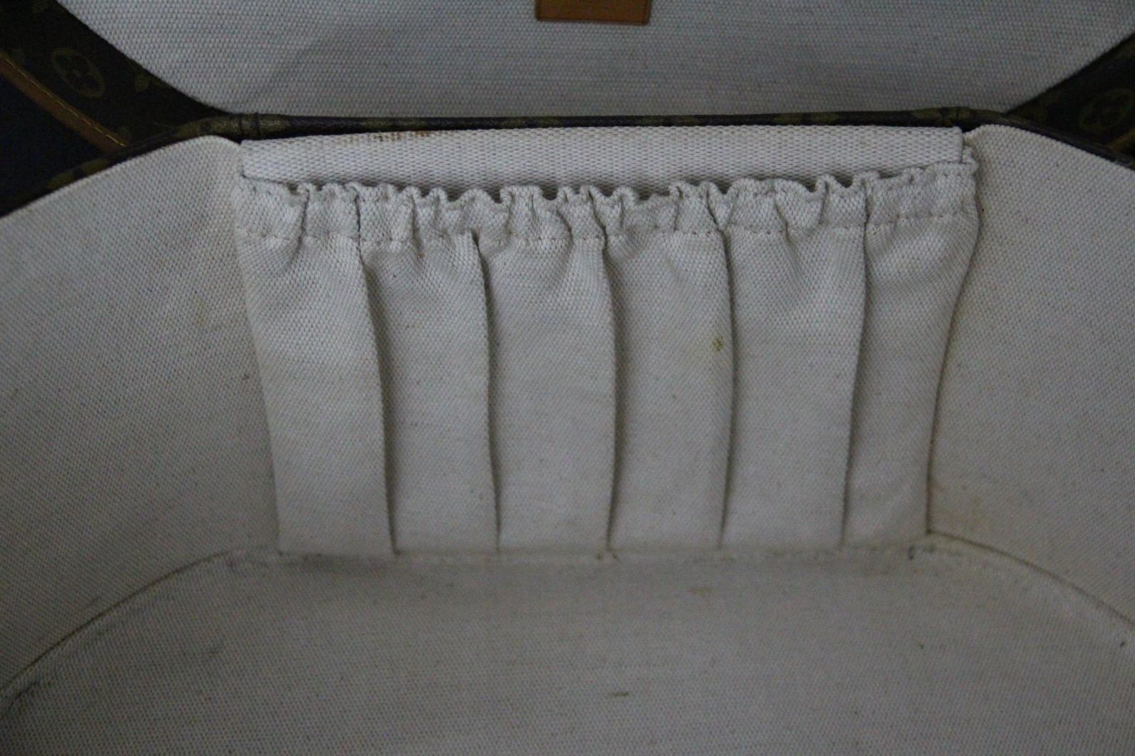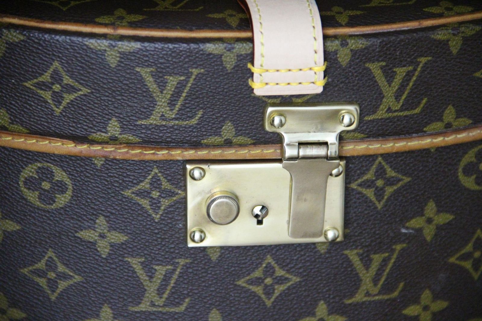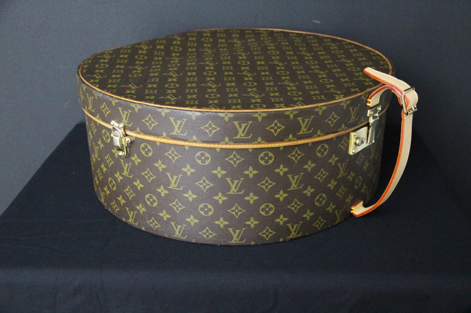 Cette magnifique boîte à chapeaux Louis Vuitton Monogram d’occasion est composée d’une structure en bois recouverte de toile Monogram et renforcée par du cuir naturel. Elle est équipée d’une sangle en cuir réglable. Elle présente un fermoir en laiton et deux fermoirs en laiton estampillés Louis Vuitton sur les côtés.