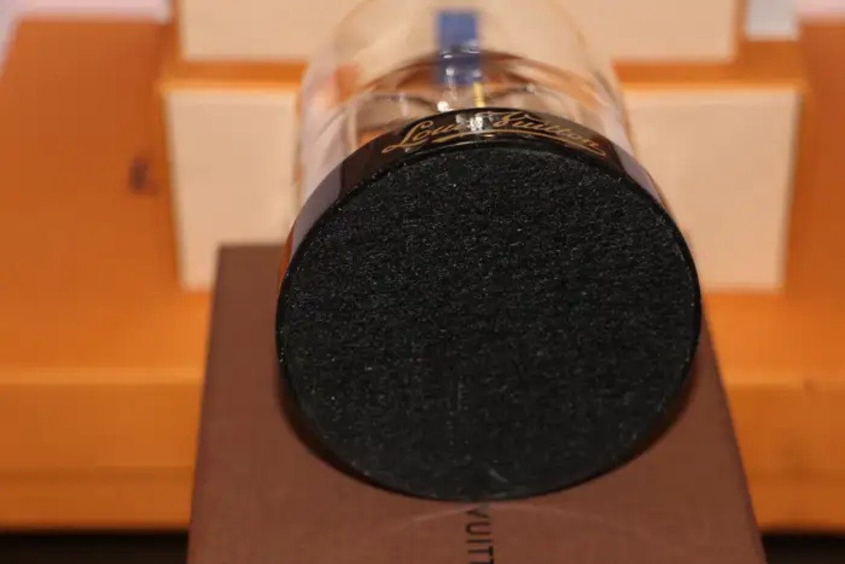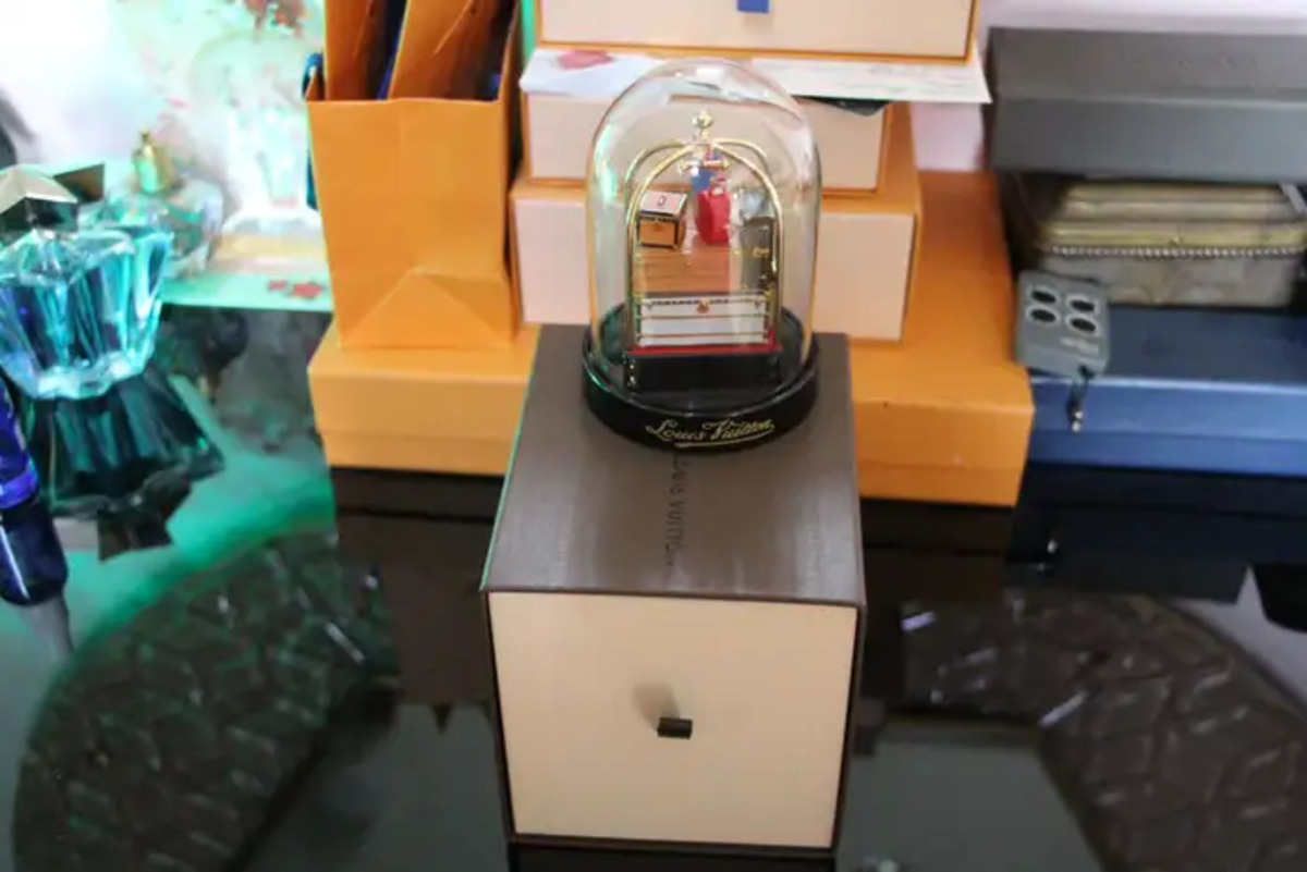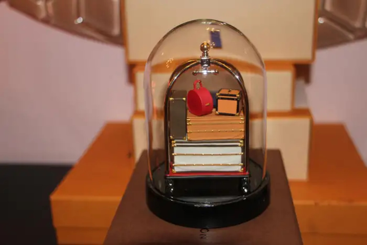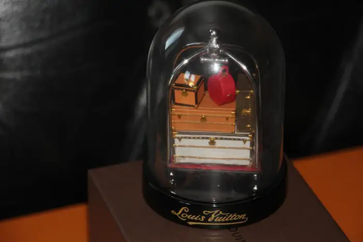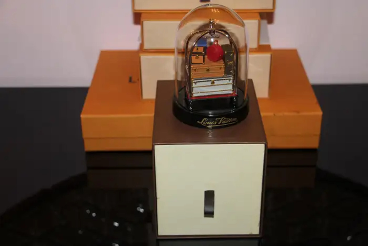 Il s’agit d’une édition très limitée .C’est un dôme en verre transparent avec une base en acrylique marquée Louis Vuitton. Cette pièce très décorative est livrée avec son coffret d’origine. Elle est en parfait état.