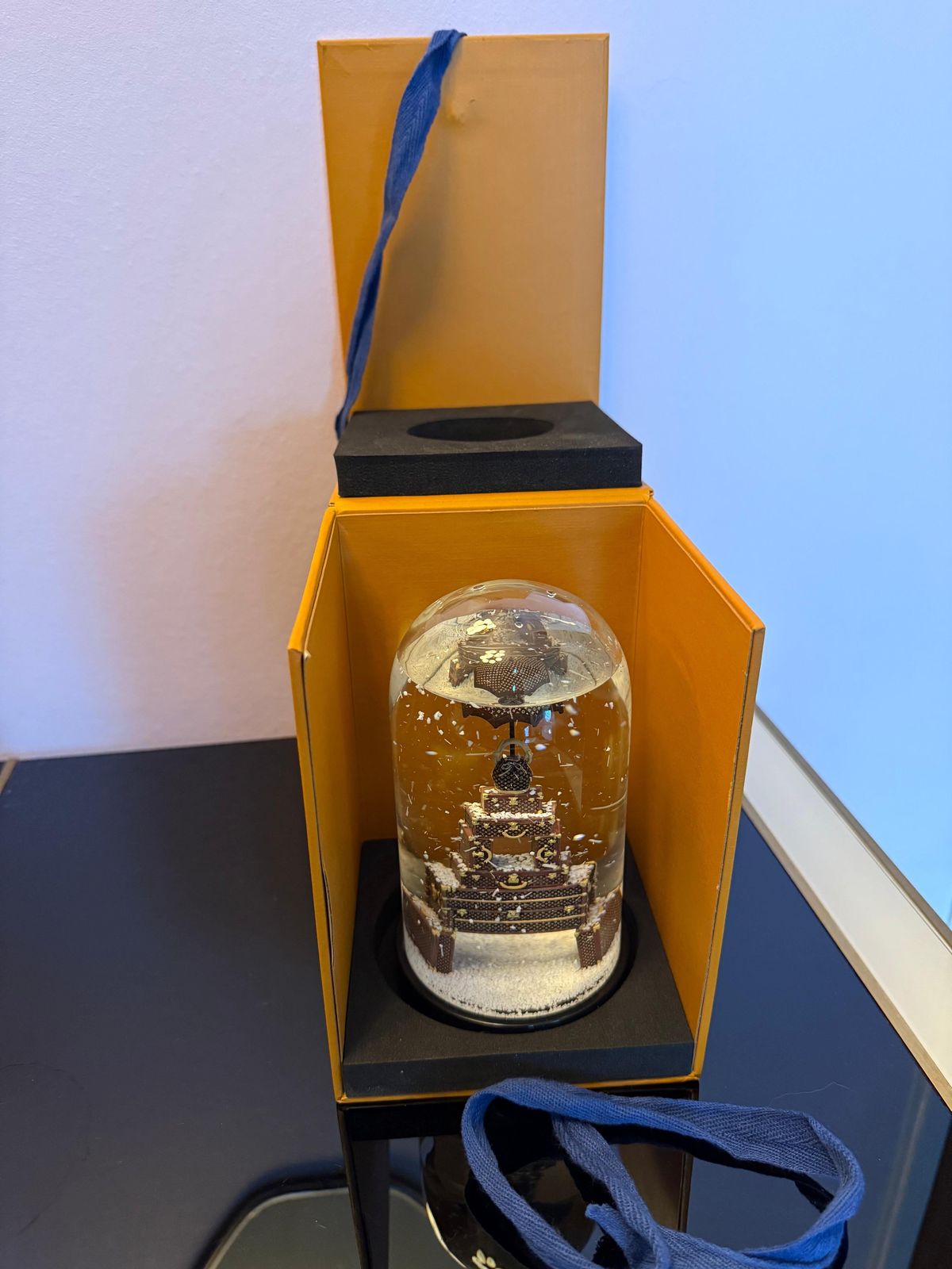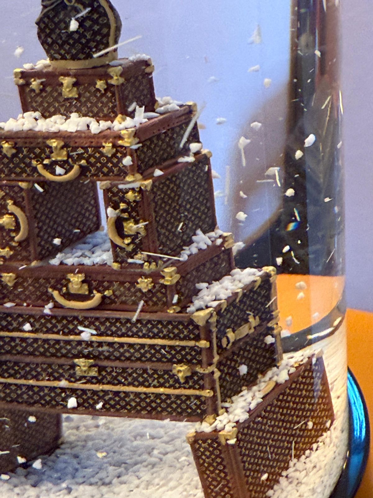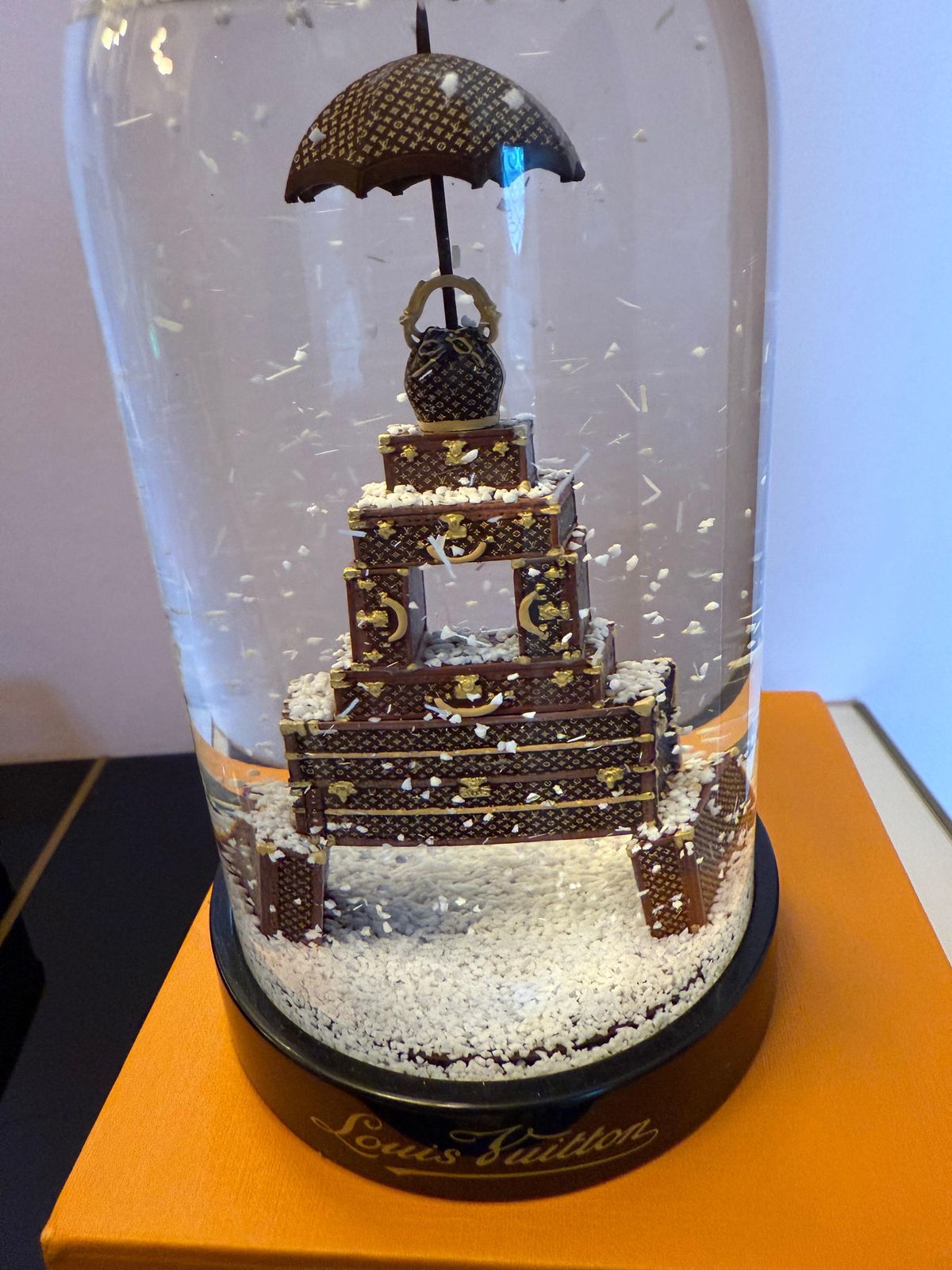 Le design est couronné d’un parapluie signature, une référence subtile à l’héritage de Louis Vuitton en matière de voyages de luxe et de savoir-faire artisanal. Lorsque l’on secoue doucement la boule, des flocons blancs semblables à de la neige tourbillonnent à l’intérieur, renforçant son attrait visuel et son impression de mouvement.