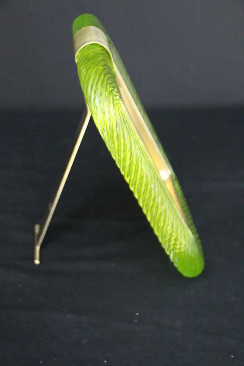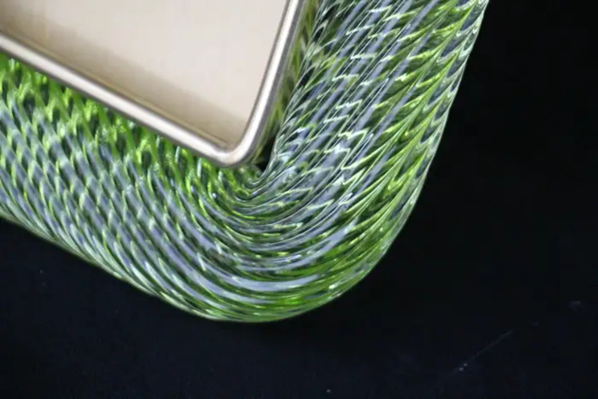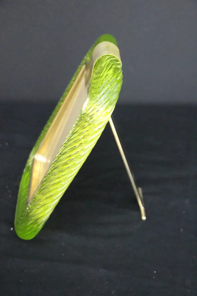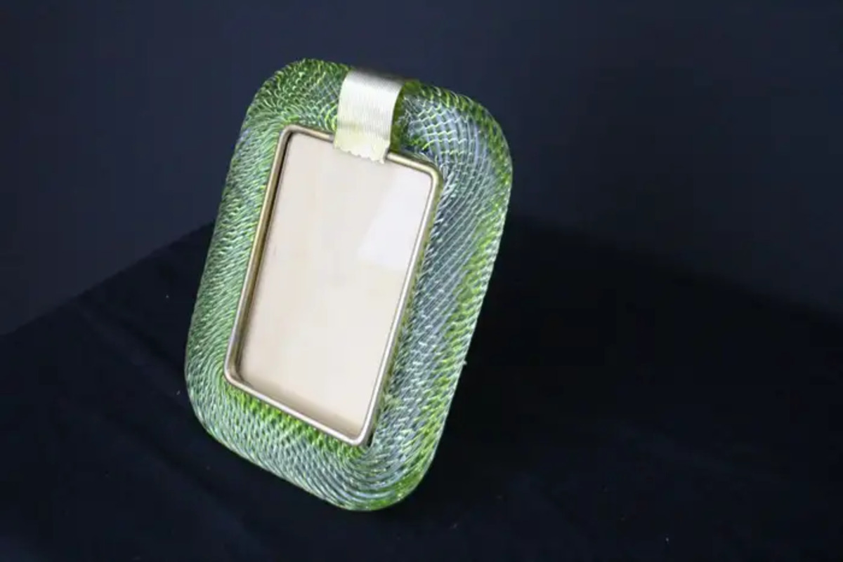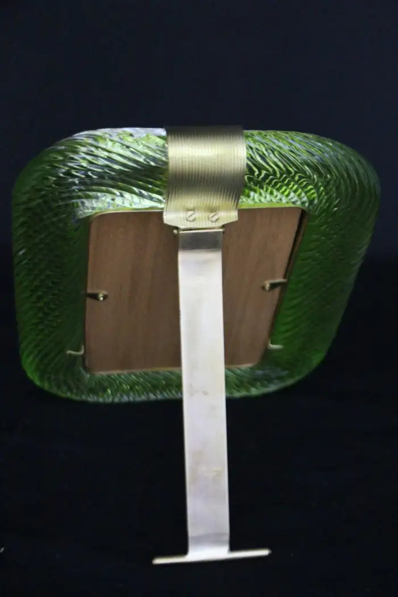Ce cadre photo en verre torsadé Torciglione est en verre soufflé de Murano d’un vert très vif de Barovier&Toso, Murano. Il est signé sur le dos du support en laiton. Il peut être assorti à des intérieurs vintage, classiques, art déco, mid century ou contemporains et sera parfait pour orner vos bibliothèques, vos consoles, vos étagères ou vos coffres…