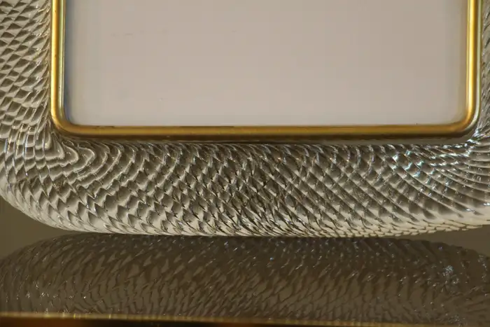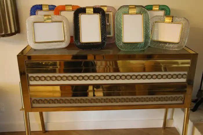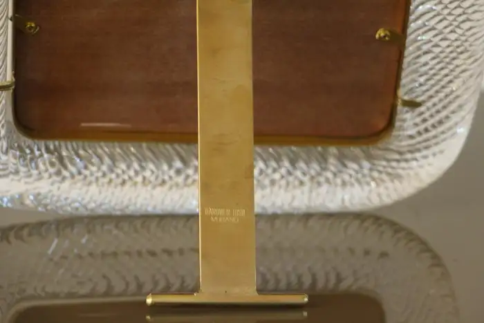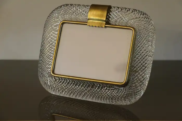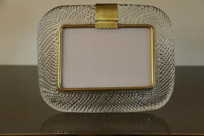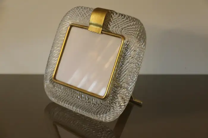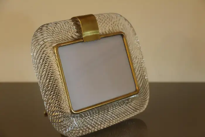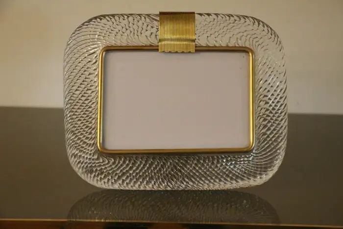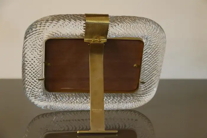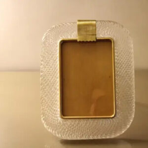 Ce cadre photo est en verre soufflé de Murano d’une très belle couleur cristal, recouvert de cristal de Barovier&Toso, Murano. Il est signé sur le dos du support en laiton. Il peut être assorti à des intérieurs vintage, classiques, art déco, mid century ou contemporains et sera parfait pour orner vos bibliothèques, vos consoles, vos étagères ou vos coffres…