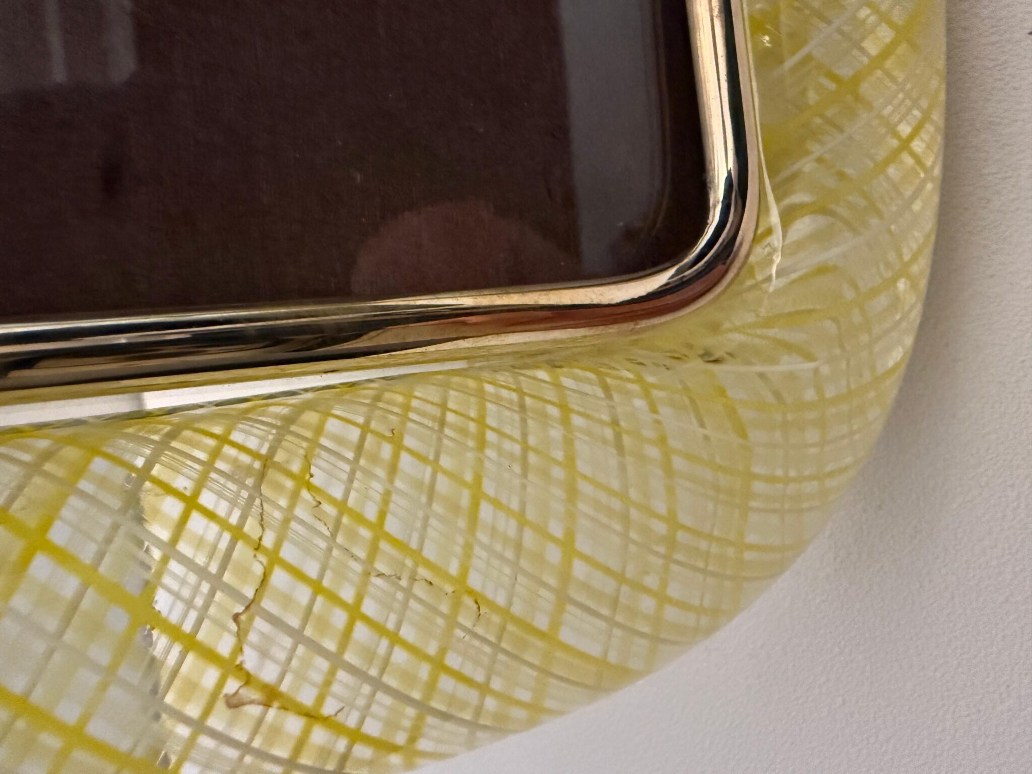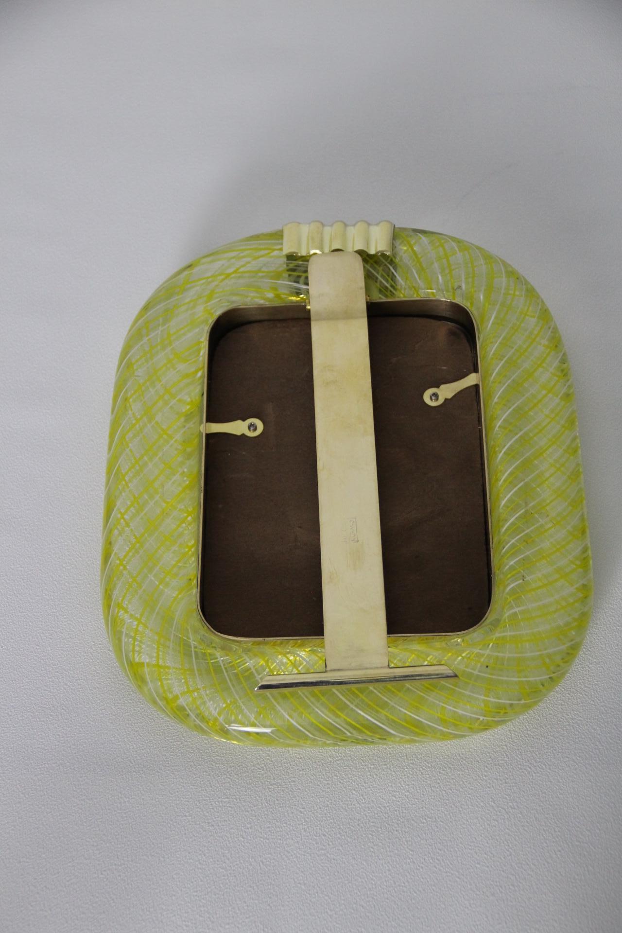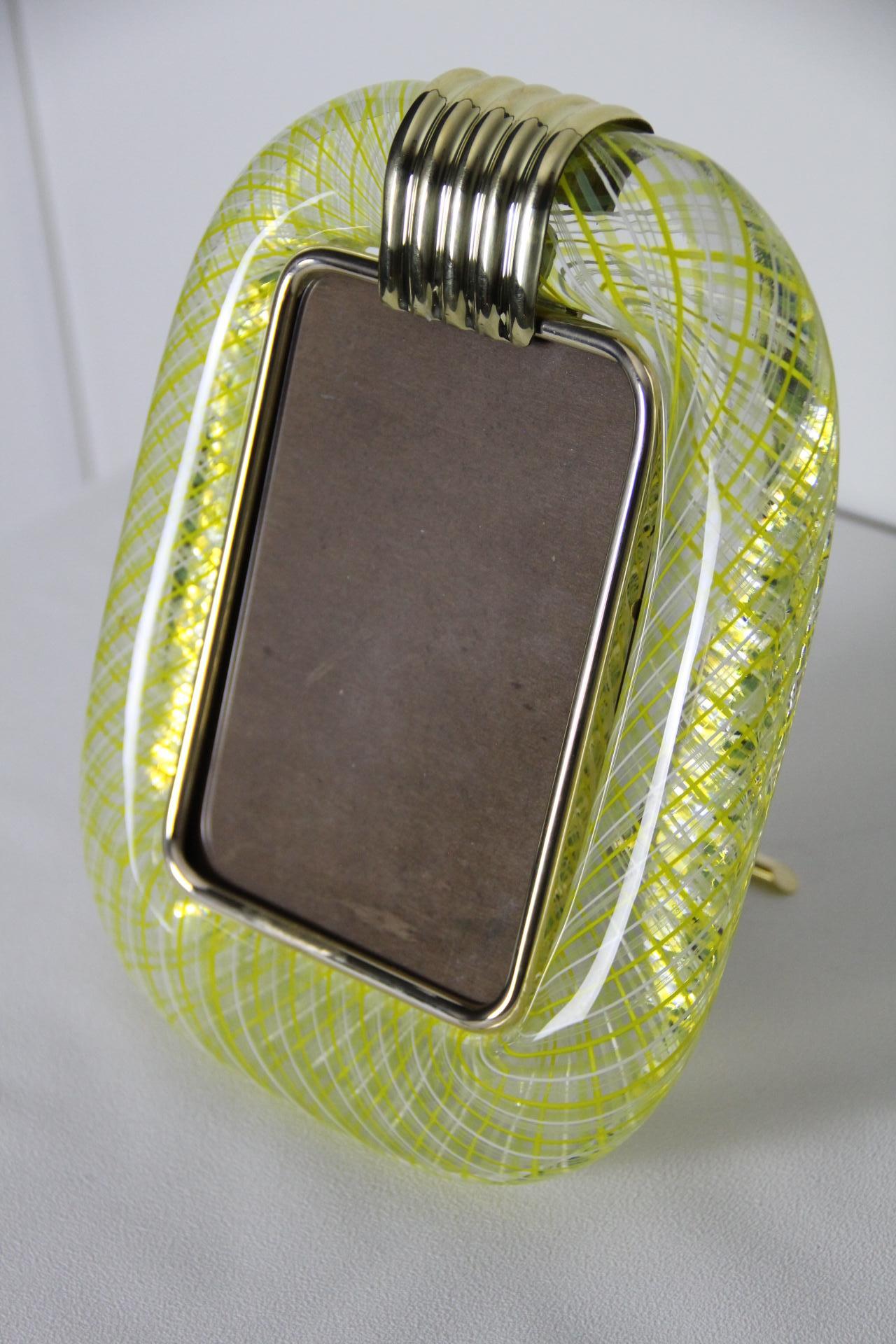 Ce beau cadre photo vertical est purement dans la tradition de fabrication du verre vénitien. La technique utilisée pour obtenir cet effet optique riche est appelée filigrane et nécessite des fabricants hautement qualifiés. Ce cadre photo est composé de verre de Murano rouge, orange et marron, superposé avec du cristal de Venini, Murano.
