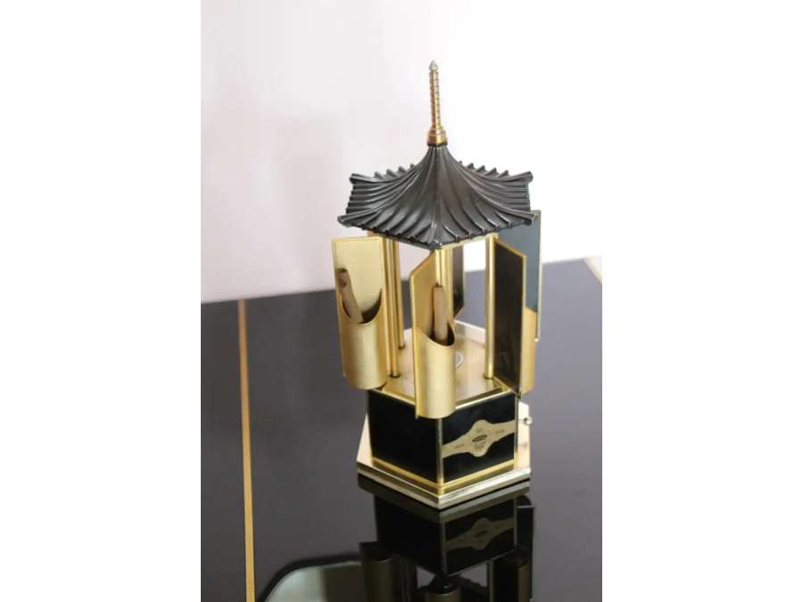 L’intérieur de chaque panneau est doté d’un aménagement en laiton avec des anneaux et des coupelles pour retenir les cigares et les cigarillos. Le dessous de la boîte à cigares comporte une boîte à musique à remontoir qui est en état de marche et joue un air musical charmant : Singing In The Rain .
