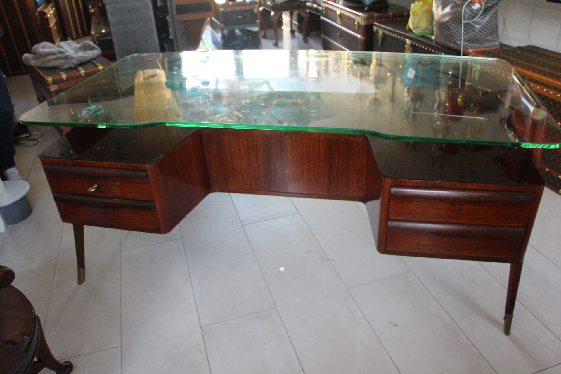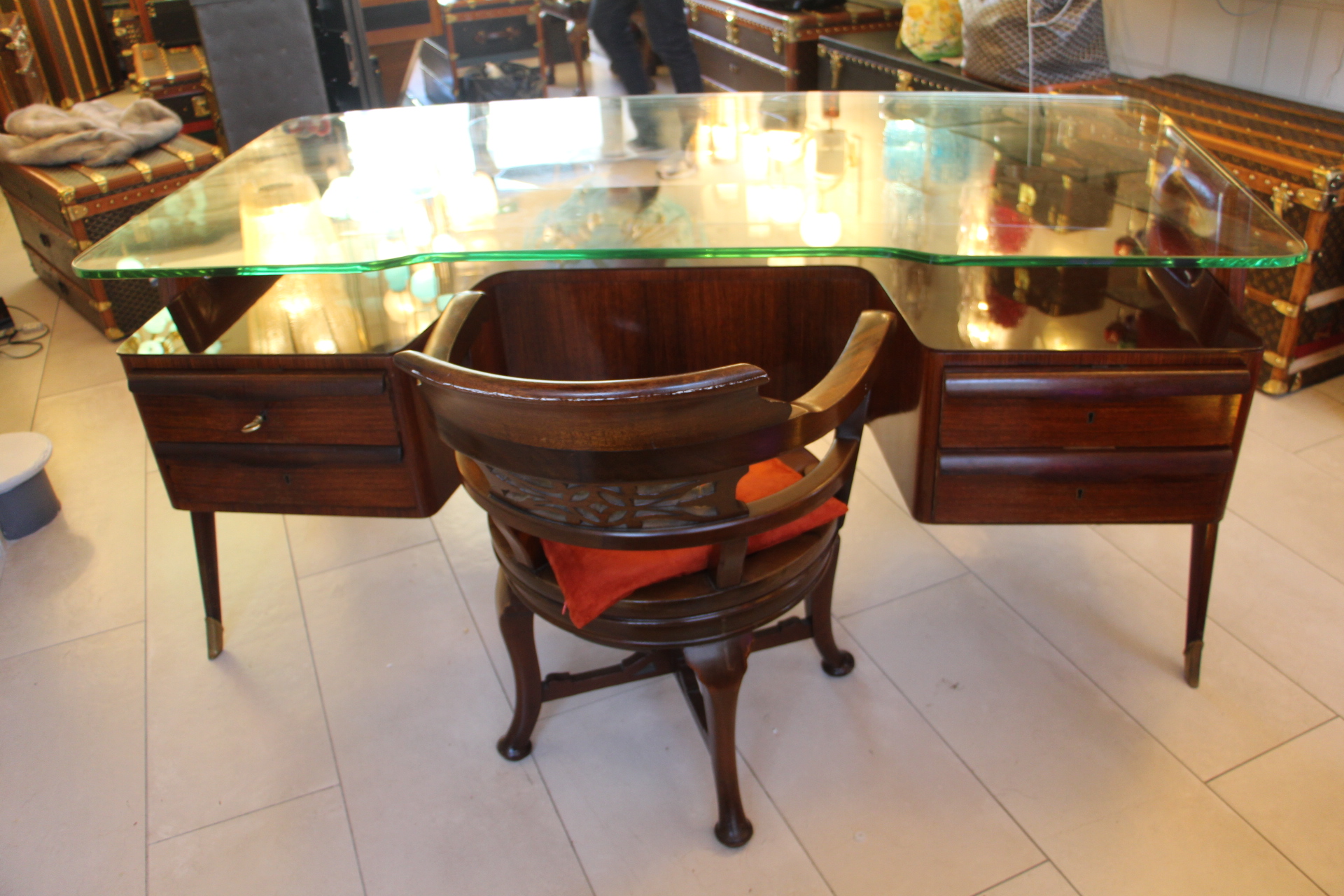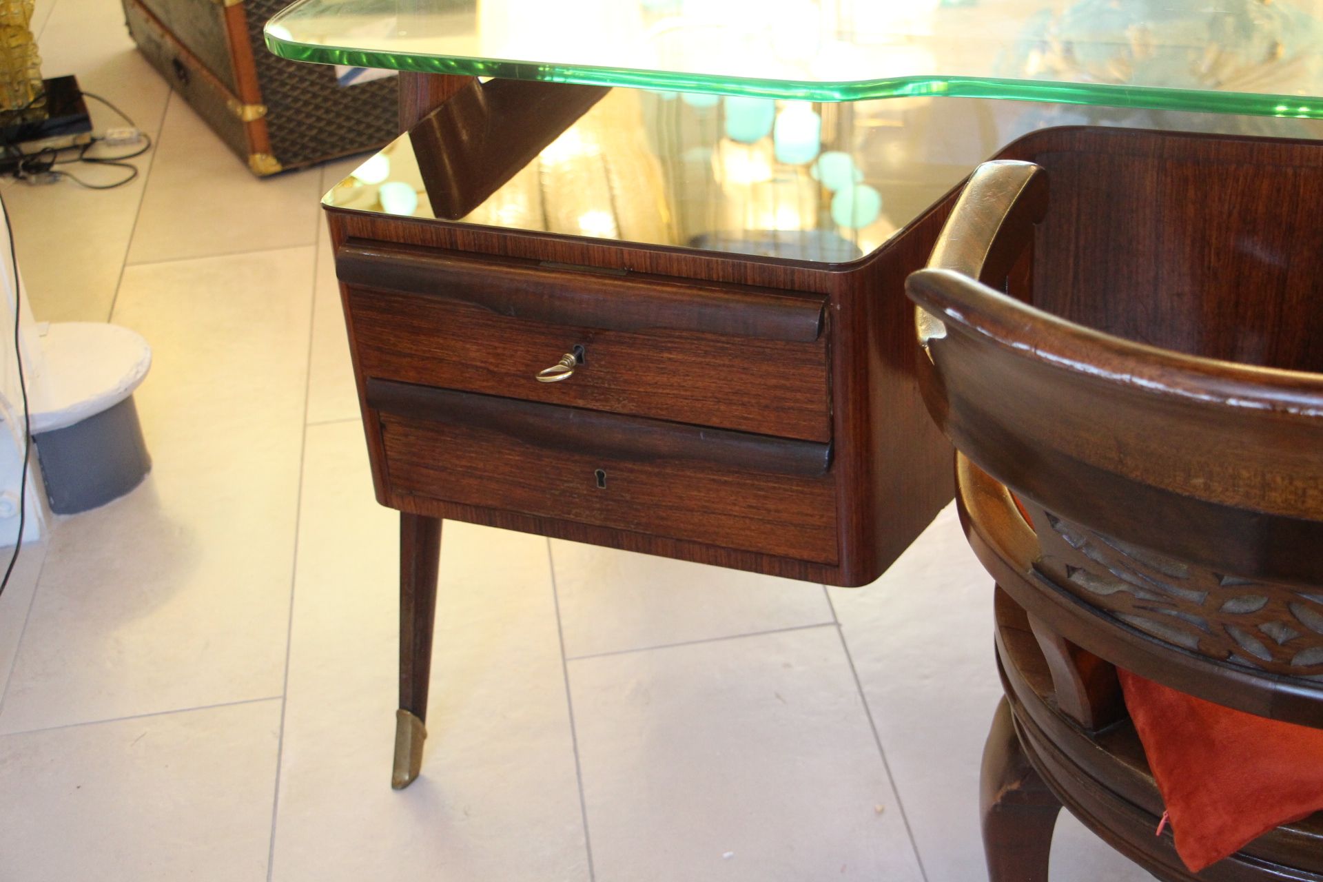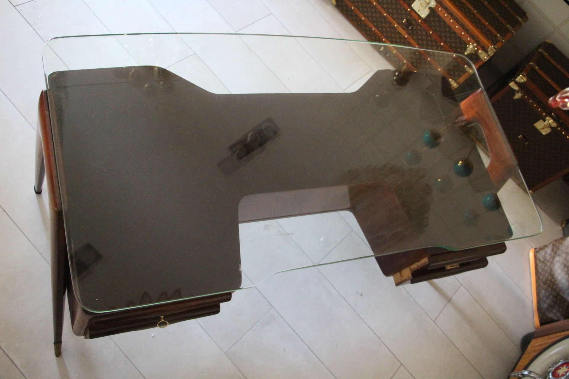 Cet impressionnant bureau Italien de Vittorio Dassi designer italien, des années 1950-1960 se compose d’un plateau de verre supérieur de 1.5 cm suspendu, puis en dessous d’un autre plateau de verre brun et de 2 colonnes de 2 tiroirs de part et d’autre.