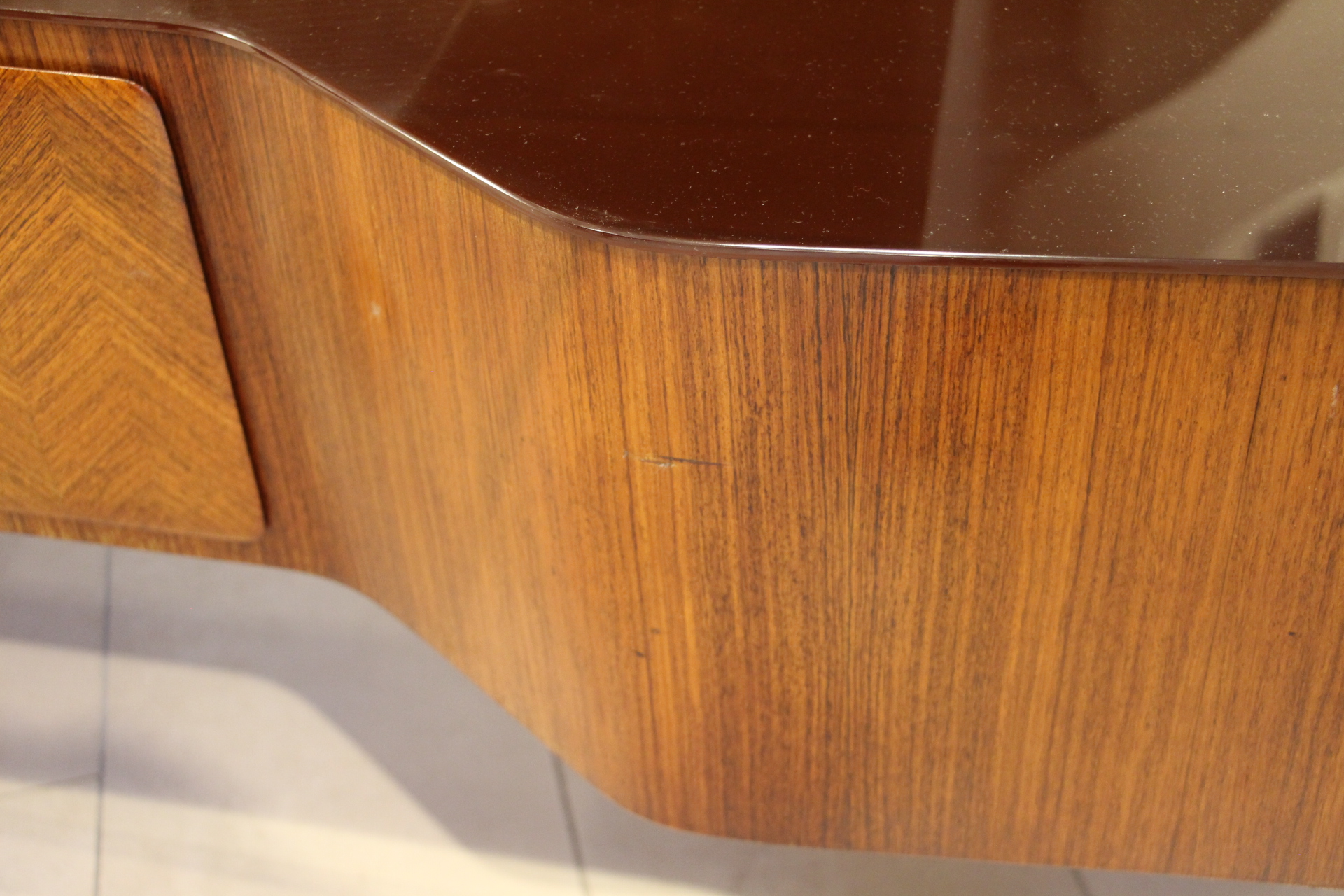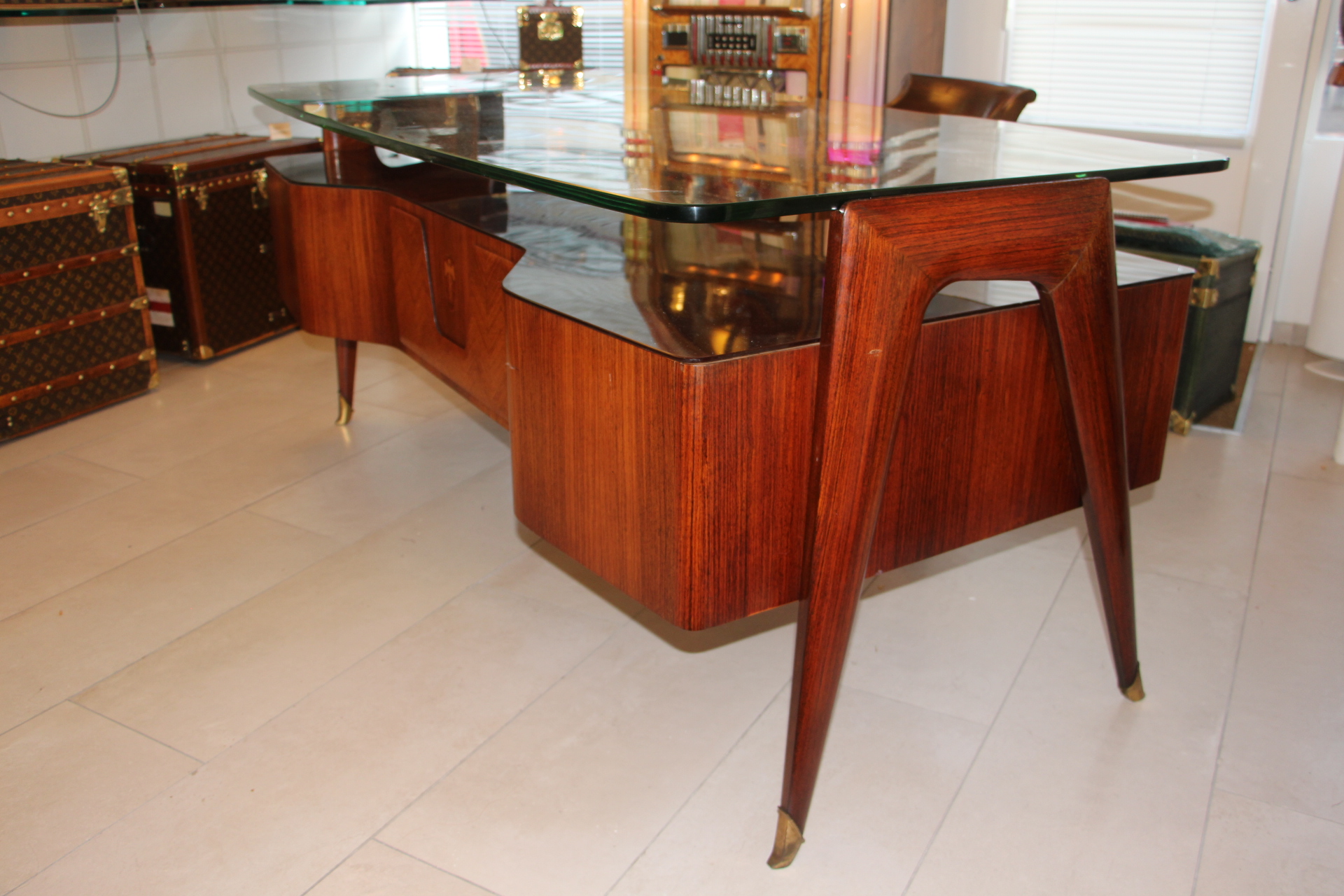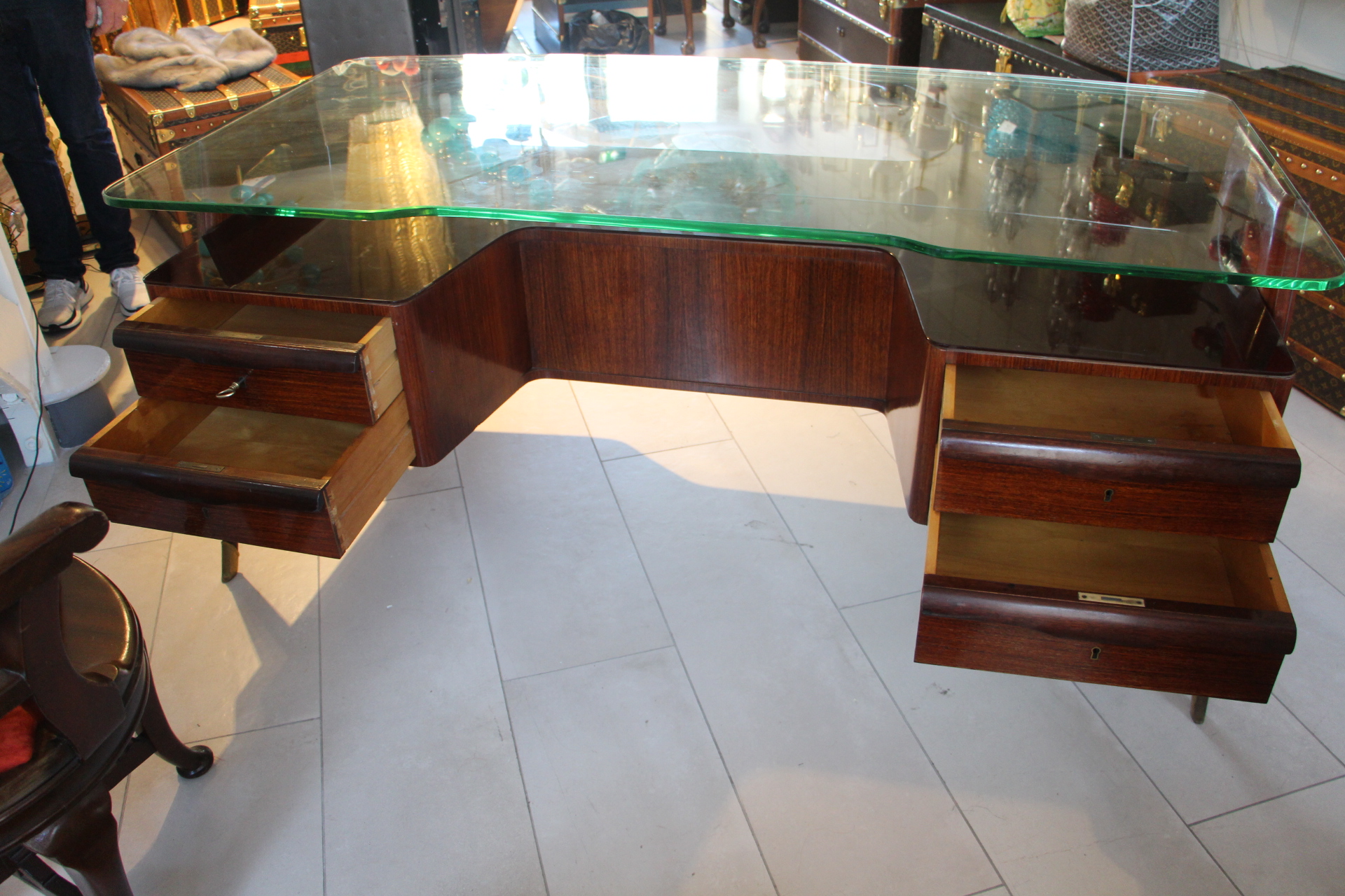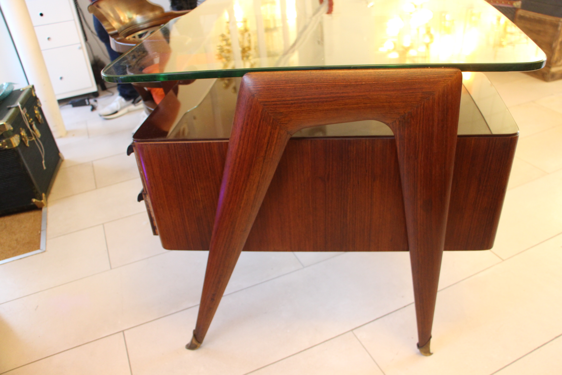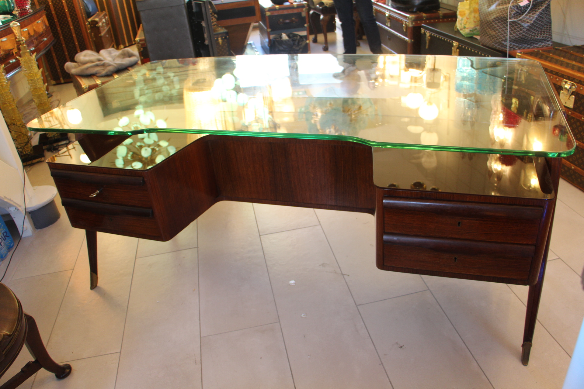 Cet impressionnant bureau Italien de Vittorio Dassi designer italien, des années 1950-1960 se compose d’un plateau de verre supérieur de 1.5 cm suspendu, puis en dessous d’un autre plateau de verre brun et de 2 colonnes de 2 tiroirs de part et d’autre.