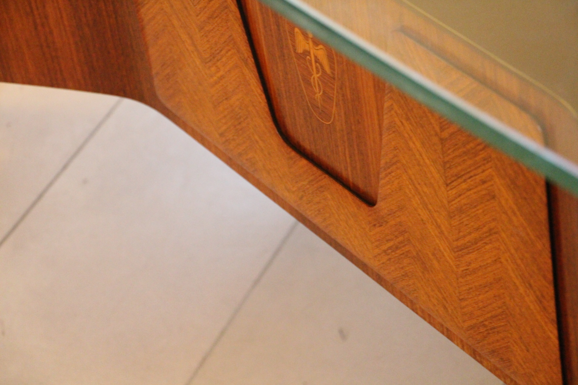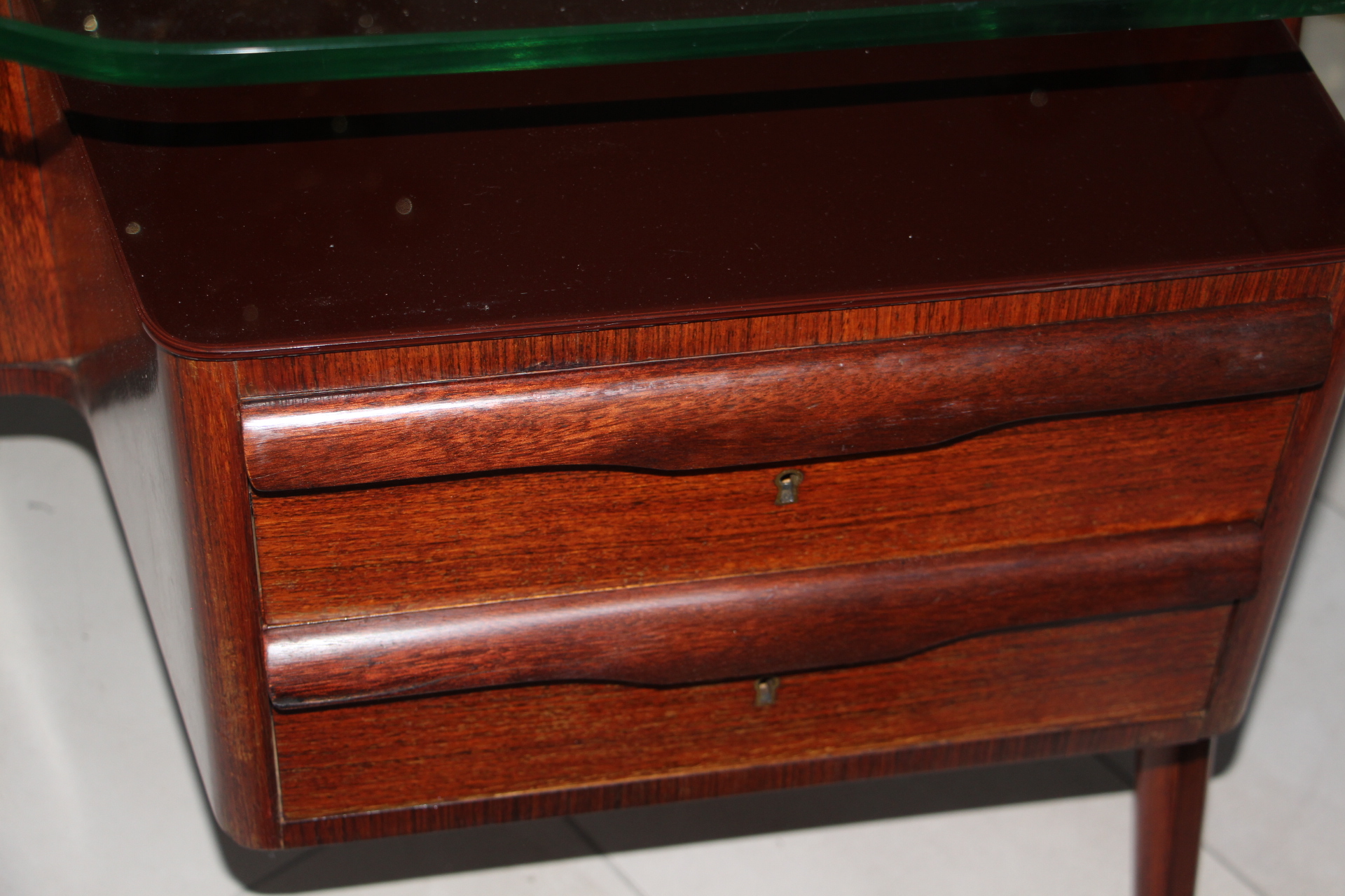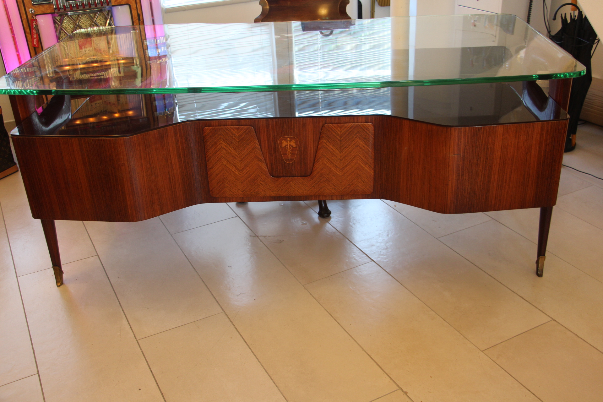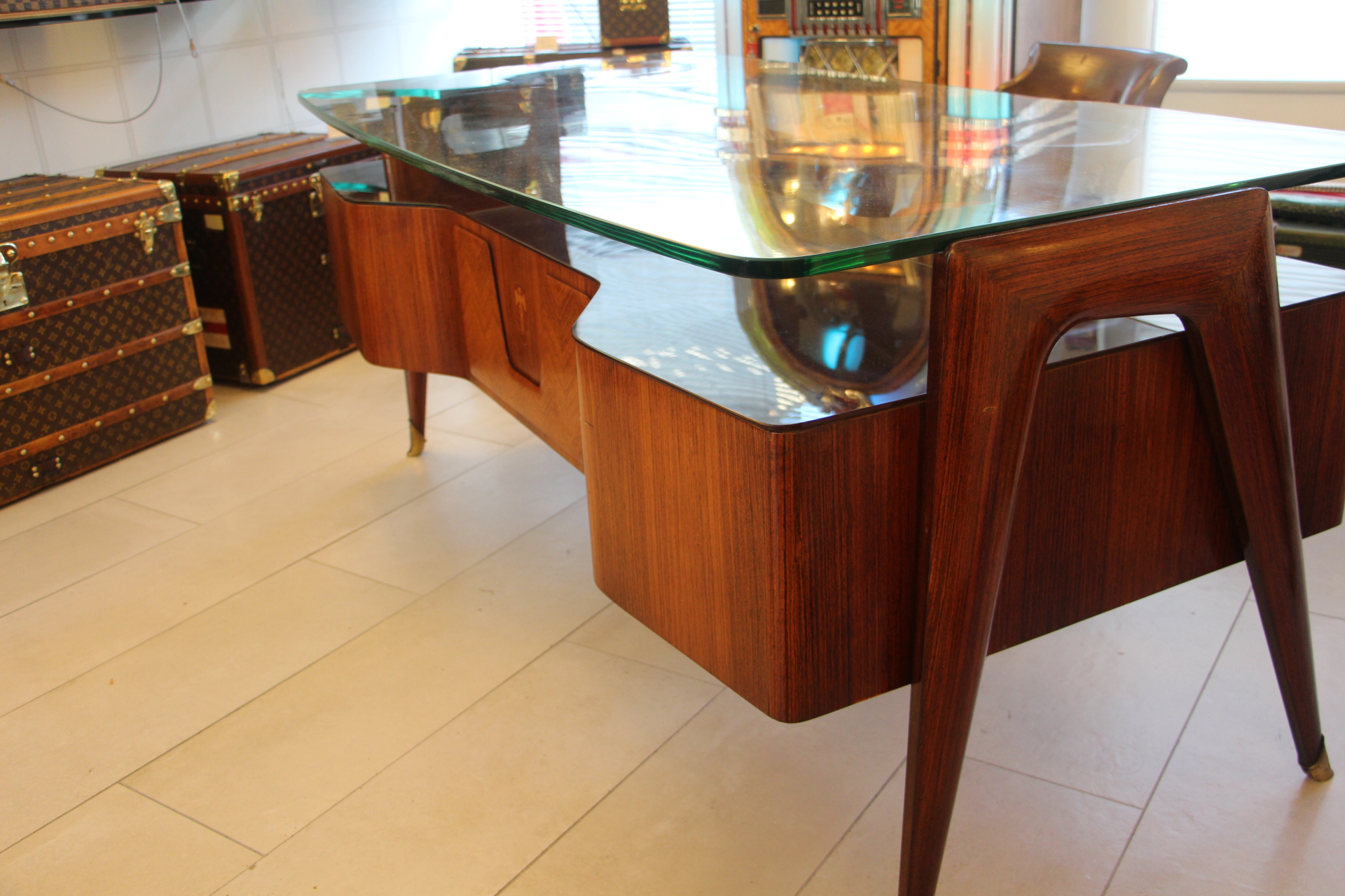 Cet impressionnant bureau Italien de Vittorio Dassi designer italien, des années 1950-1960 se compose d’un plateau de verre supérieur de 1.5 cm suspendu, puis en dessous d’un autre plateau de verre brun et de 2 colonnes de 2 tiroirs de part et d’autre.