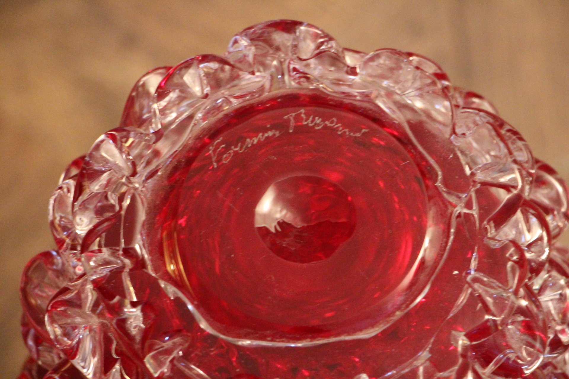 Gracieusement signé par l’artiste verrier, sa signature est un témoignage de son artisanat exceptionnel, bien que sa déchiffrabilité puisse parfois défier même les connaisseurs les plus avertis.