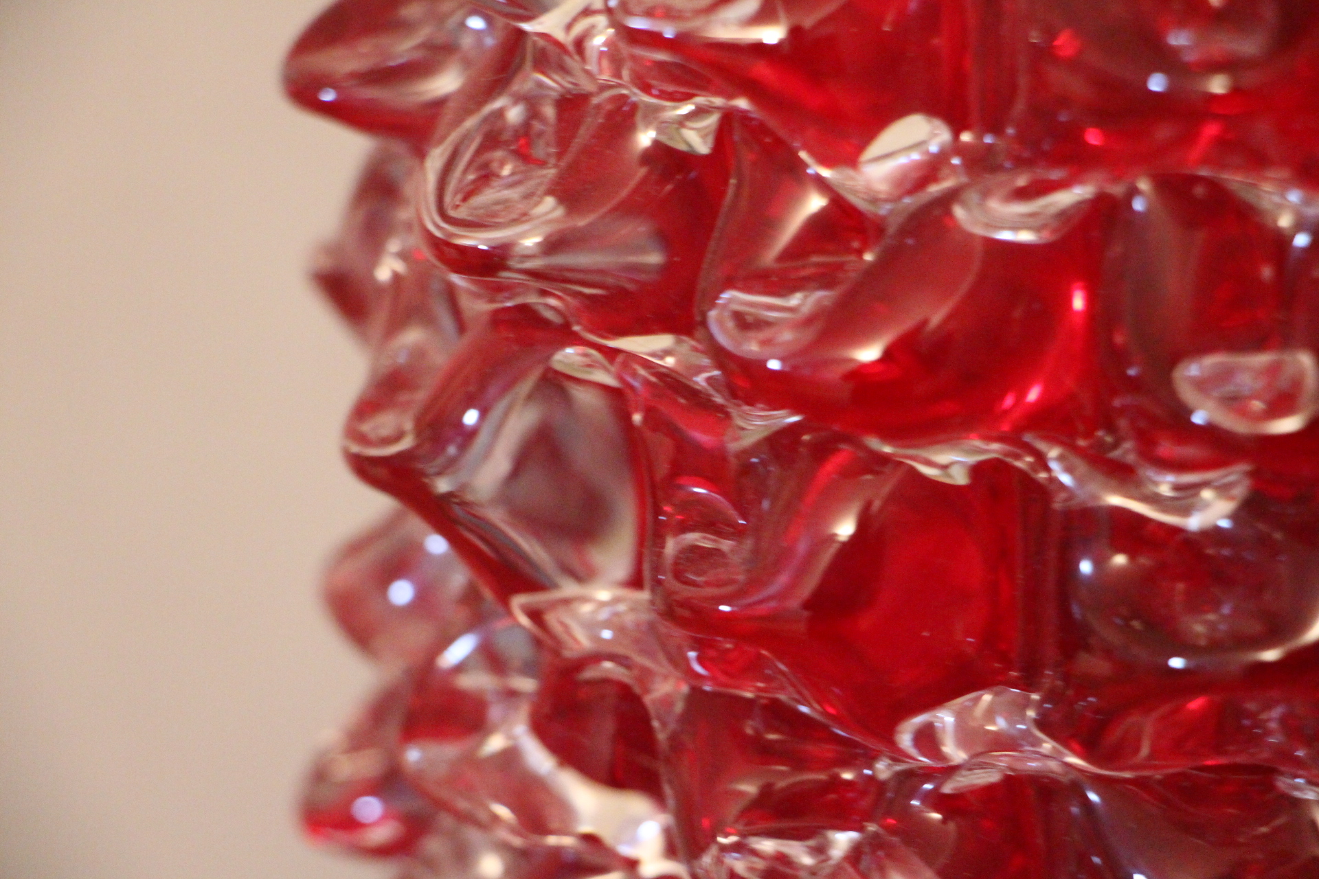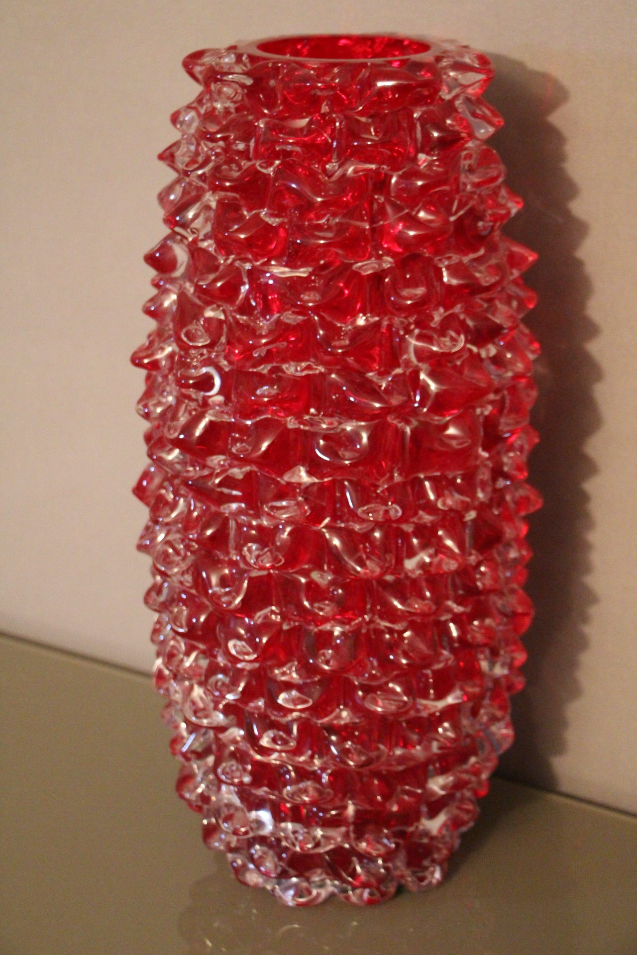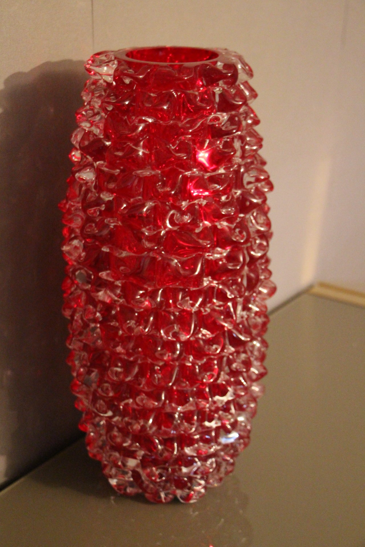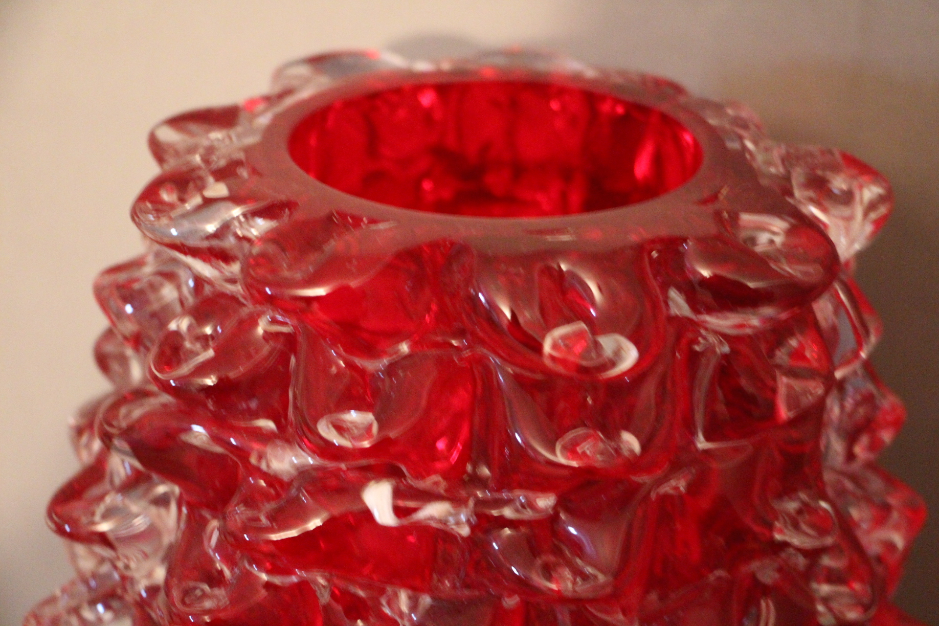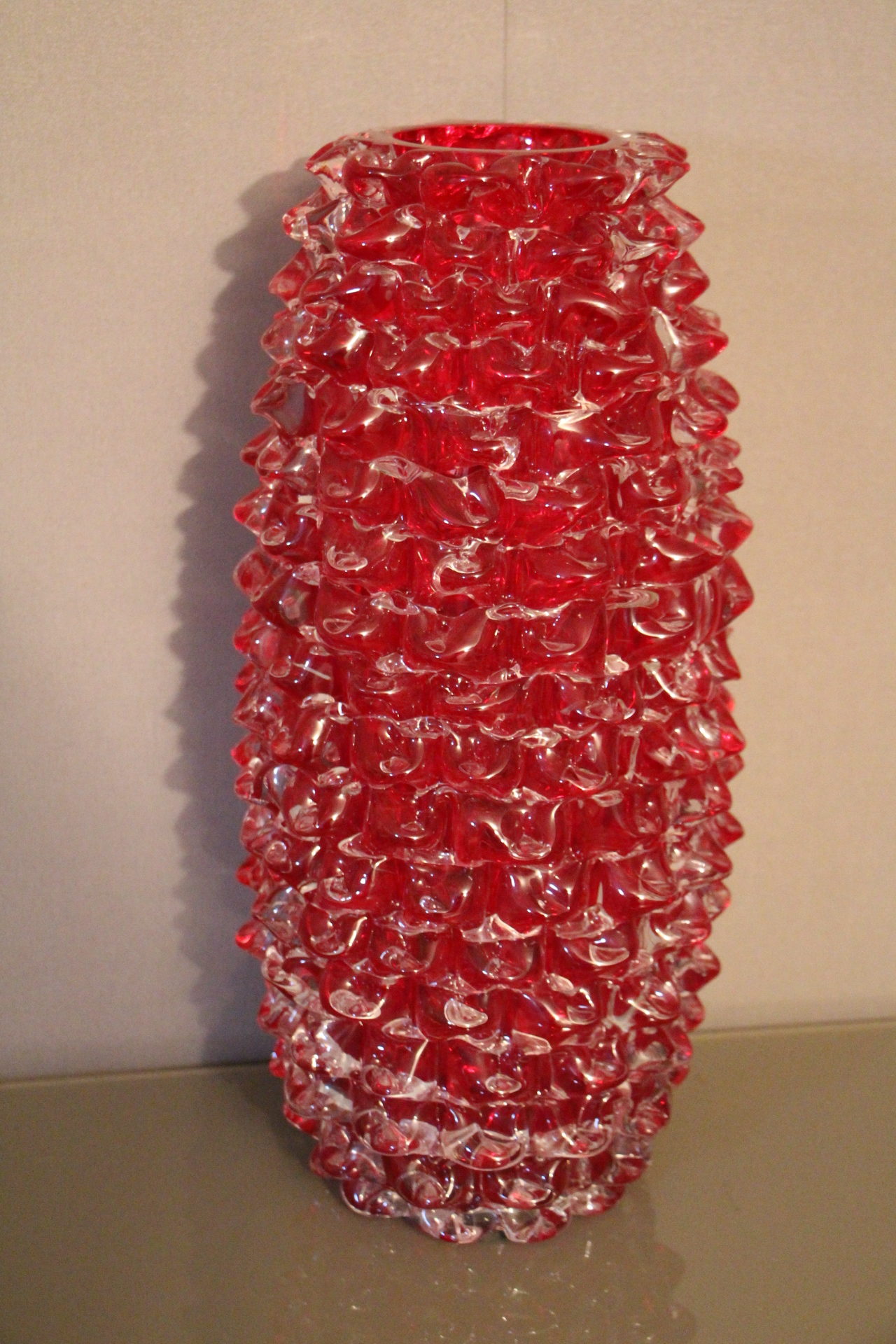 Magnifique grand vase en verre de Murano rouge rubis-Rostrato. Cette pièce exceptionnelle séduit par sa profondeur de couleur rouge rubis, créée à la main à Venise selon la technique unique du “rostrato”, où chaque pointe de verre est soigneusement travaillée en relief.