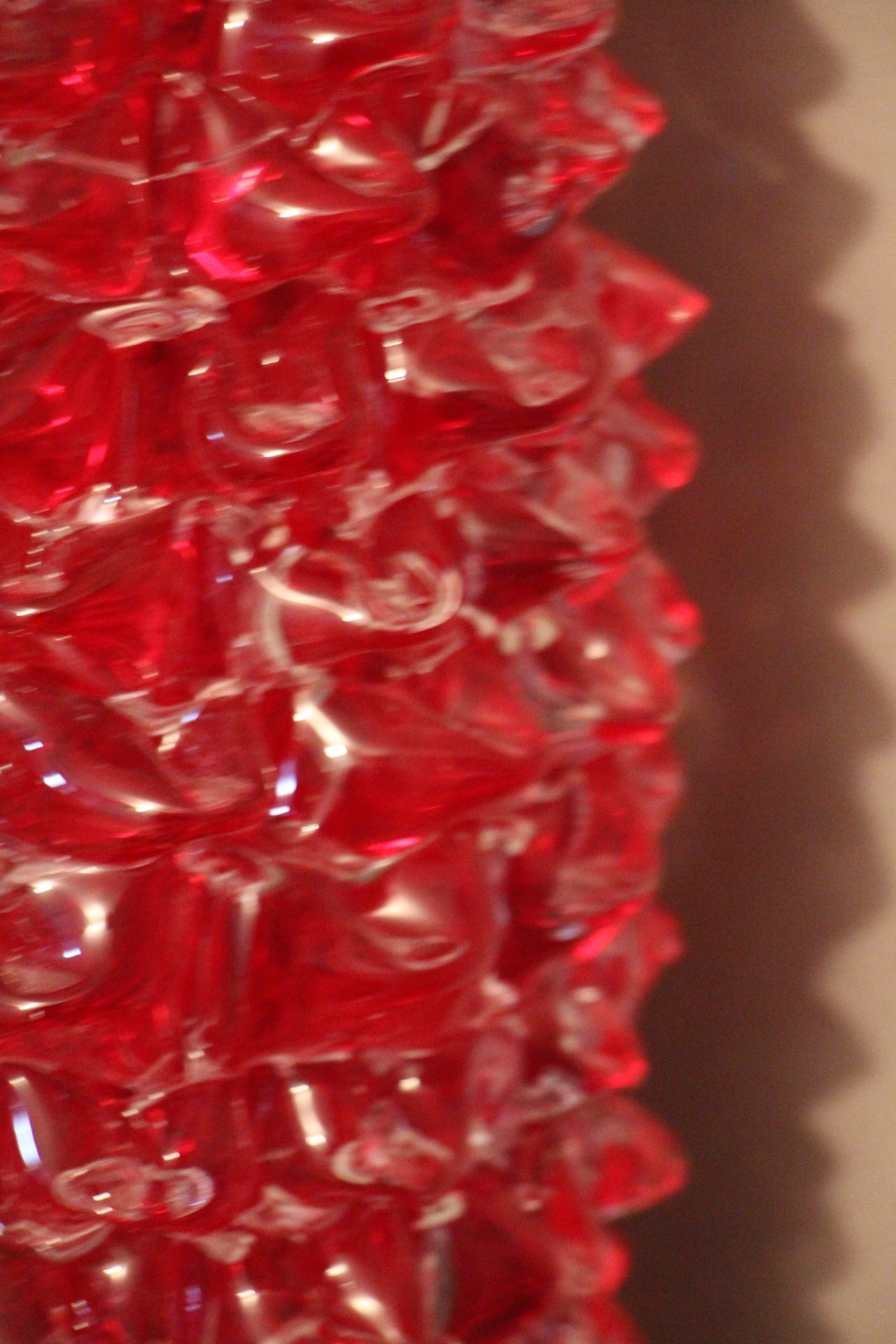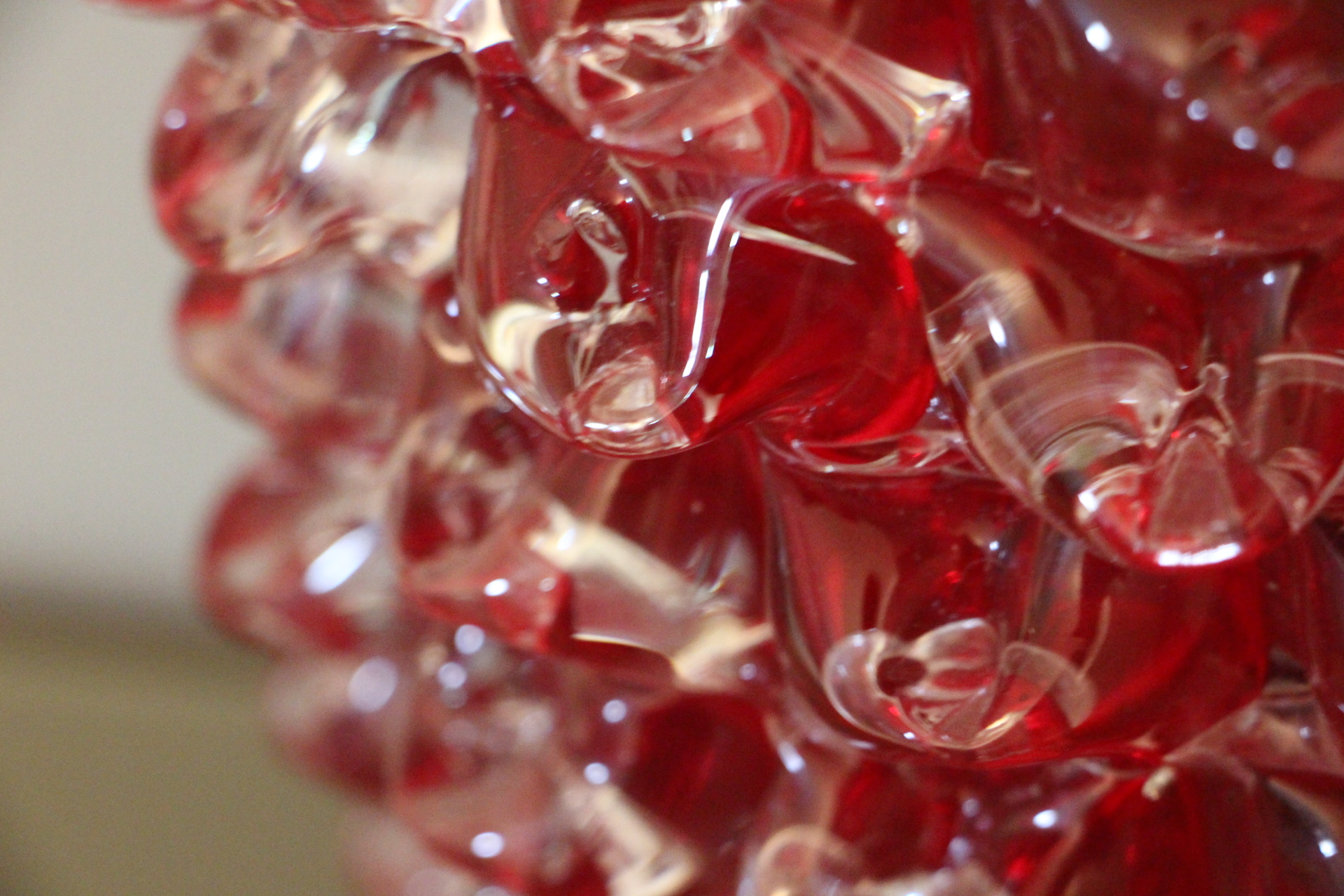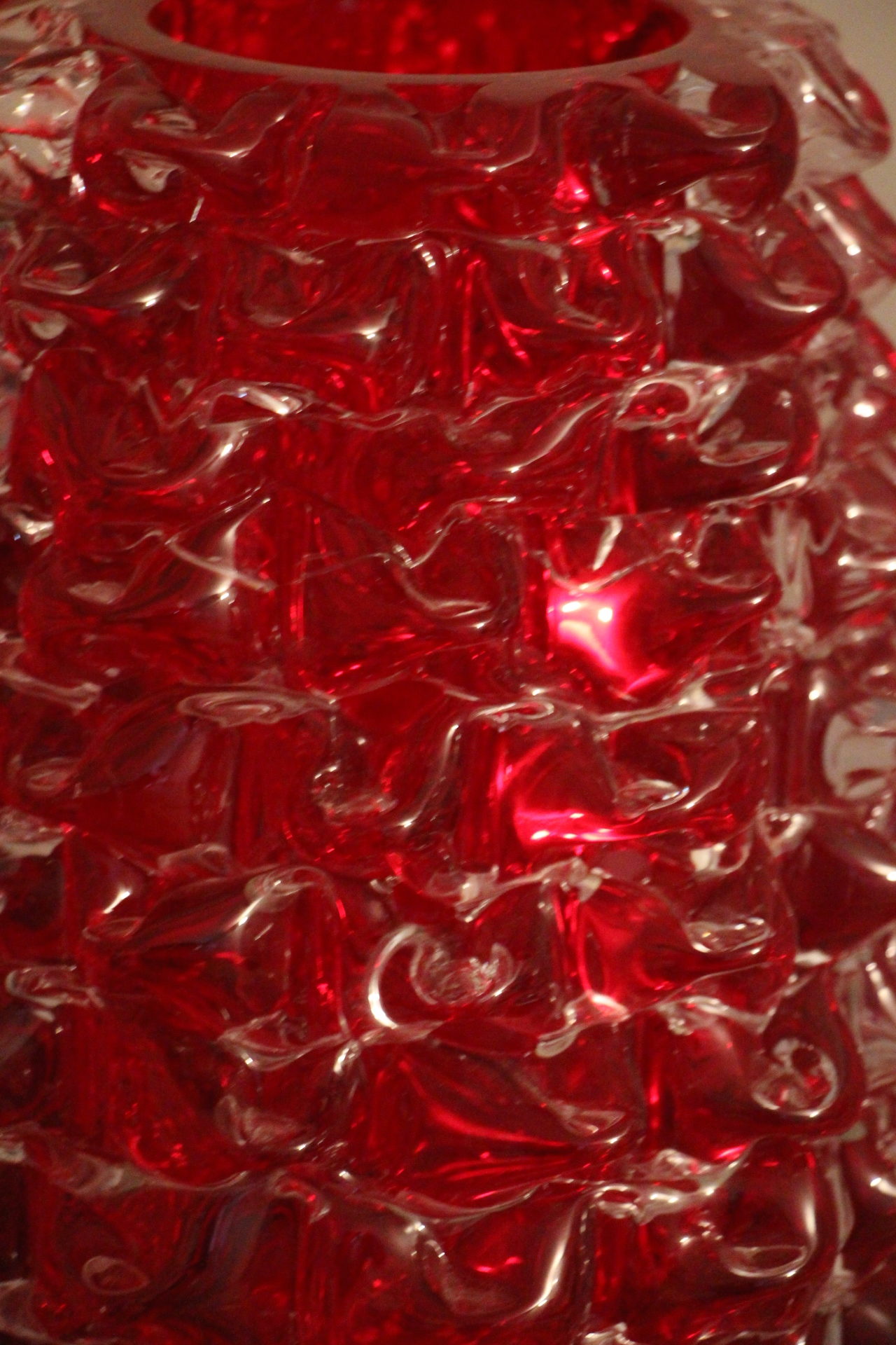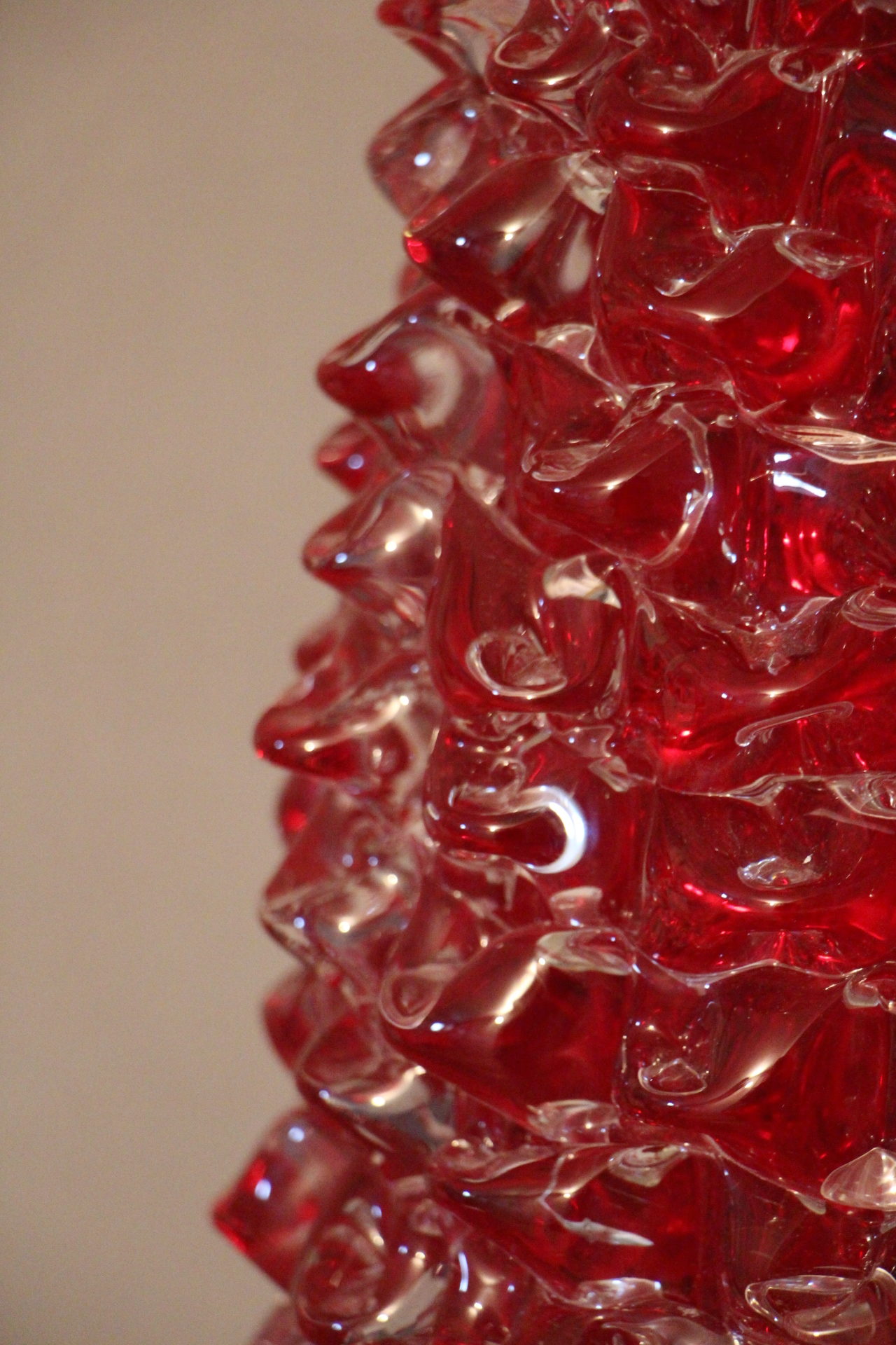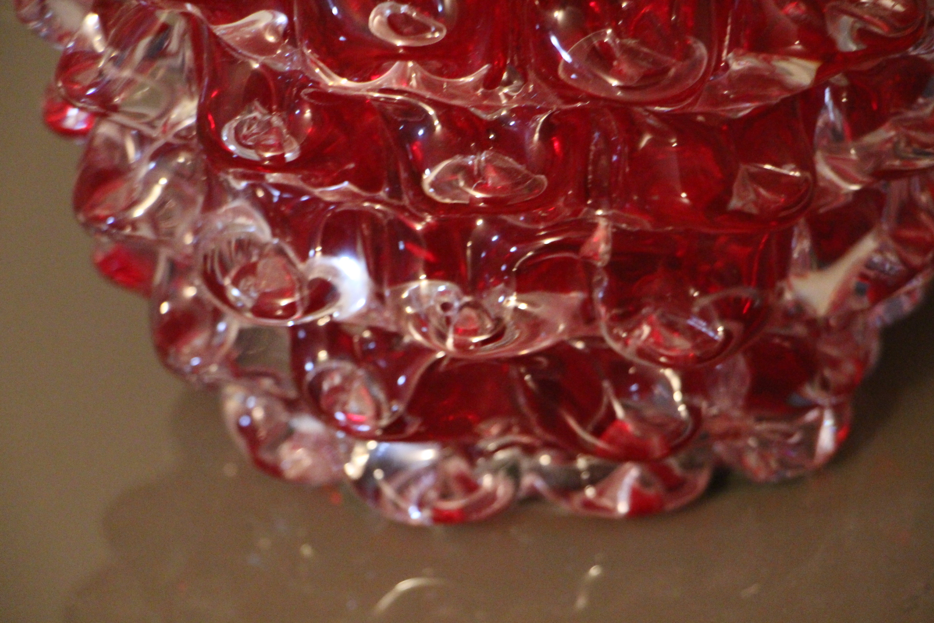 Magnifique grand vase en verre de Murano rouge rubis-Rostrato. Cette pièce exceptionnelle séduit par sa profondeur de couleur rouge rubis, créée à la main à Venise selon la technique unique du “rostrato”, où chaque pointe de verre est soigneusement travaillée en relief.