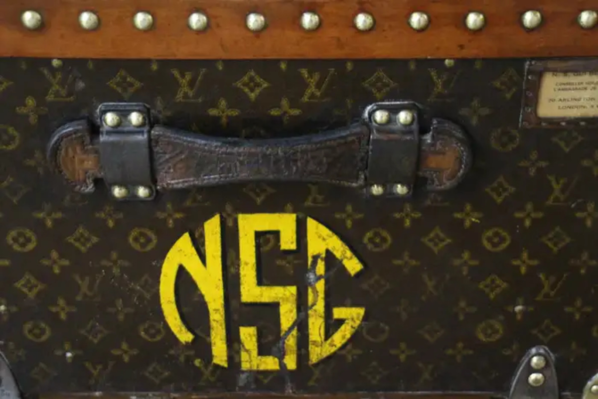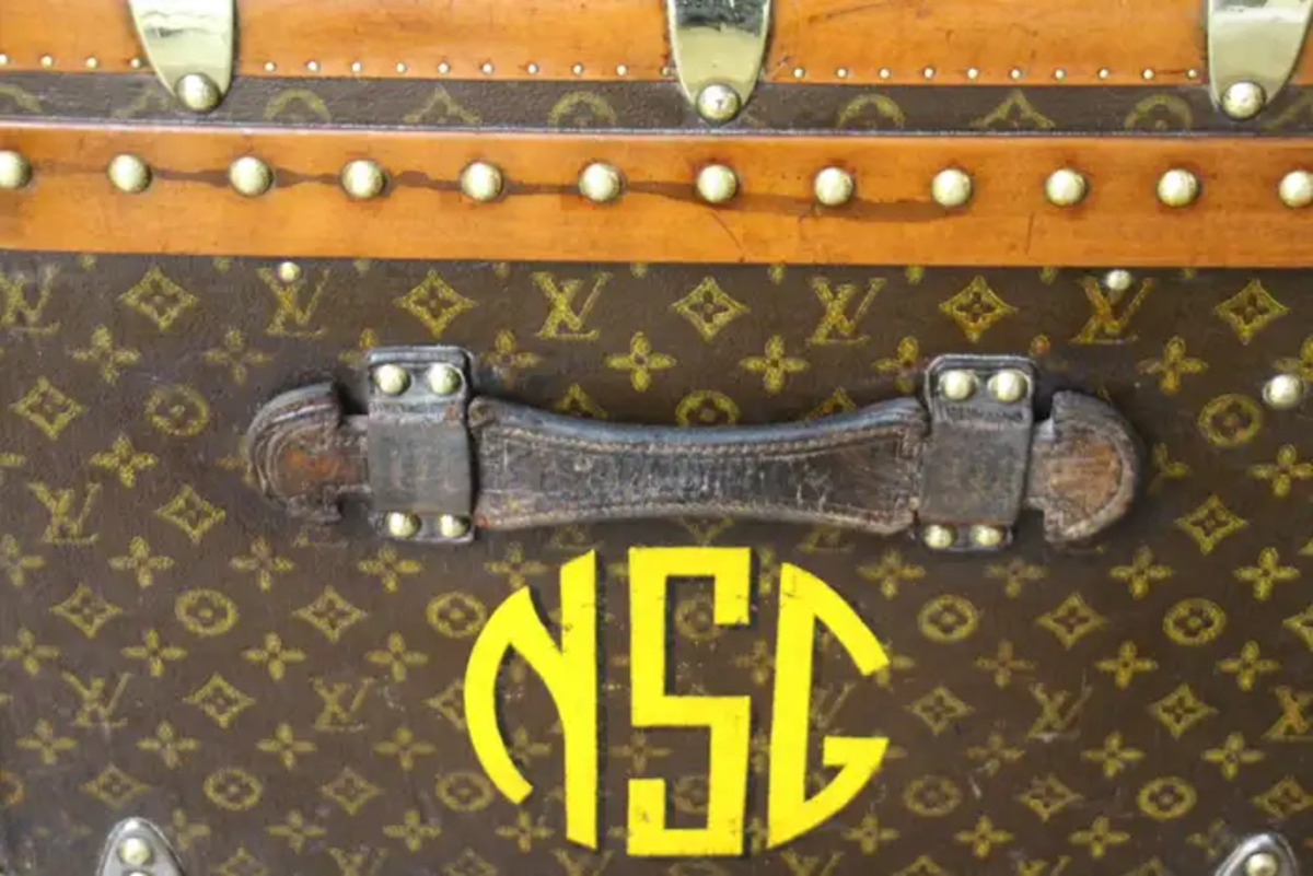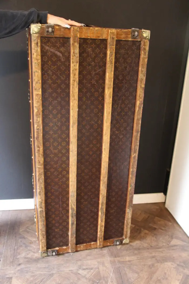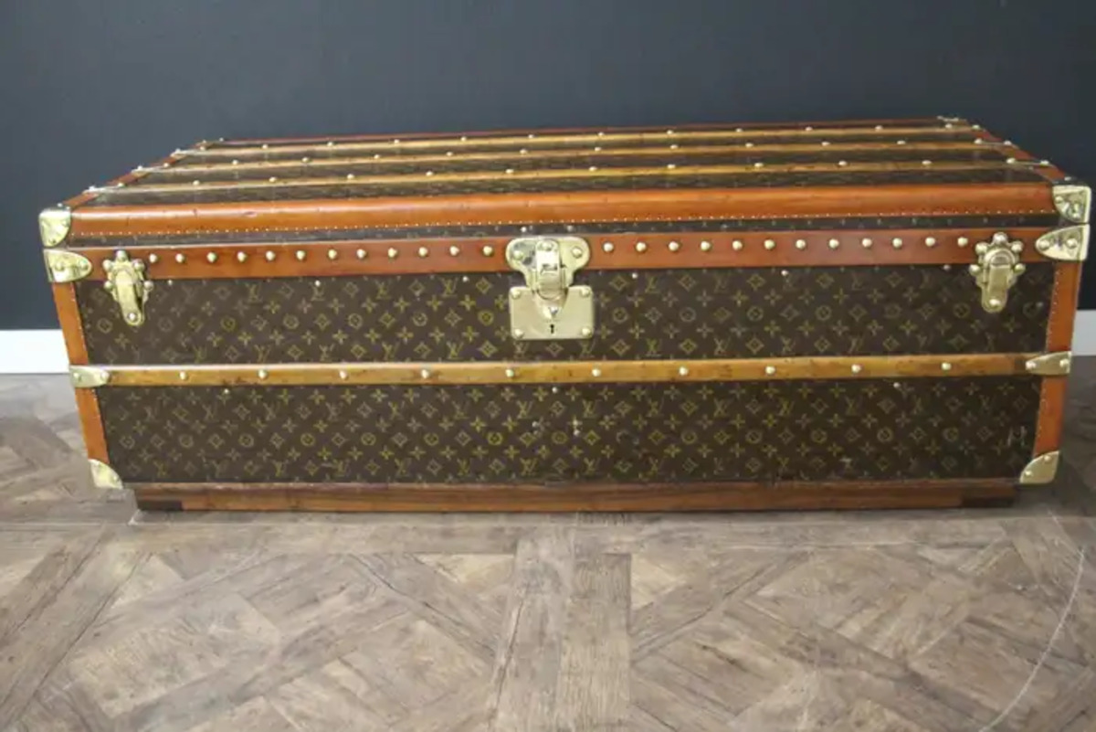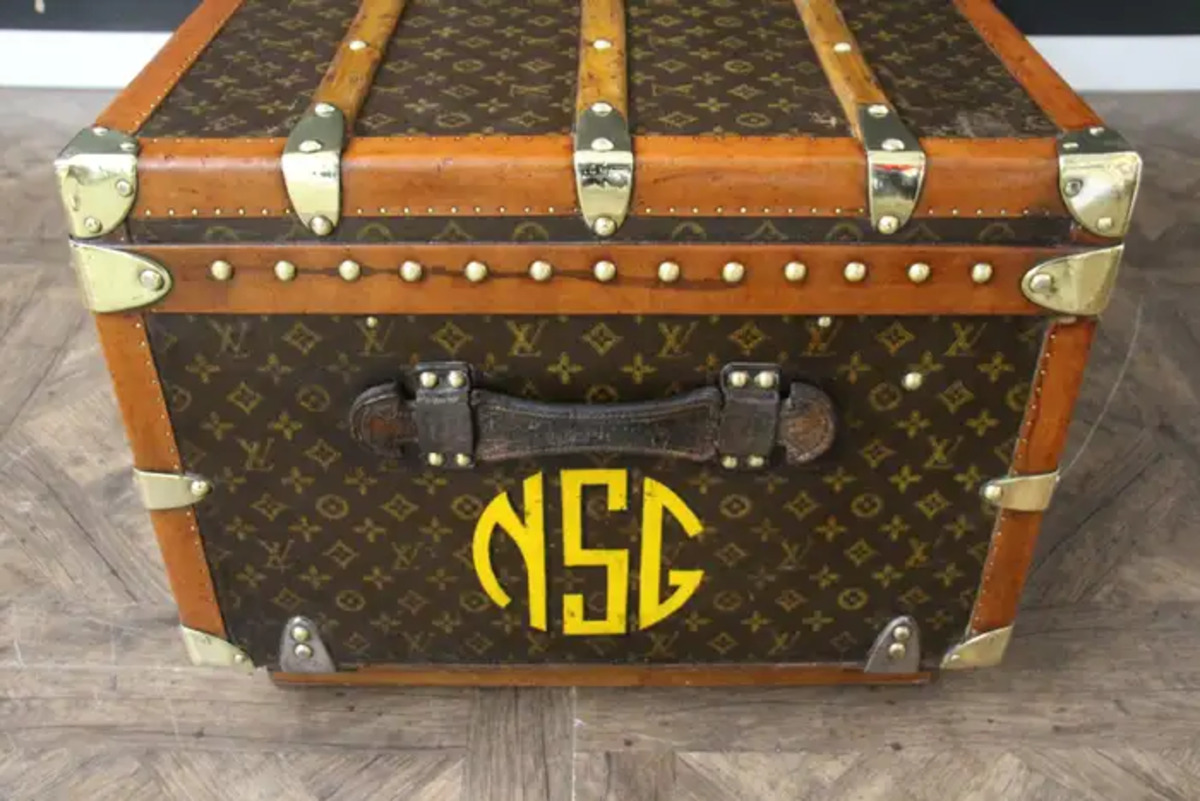 Au moment de sa fabrication, il s’agissait certainement d’une commande spéciale. Cette malle Vuitton est dotée d’une toile monogrammée peinte au pochoir à la main, d’une bordure en lozine couleur miel clair et de serrures et fermoirs en laiton massif estampillés Louis Vuitton, de clous estampillés Louis Vuitton ainsi que de larges poignées latérales en cuir. Sa patine est chaleureuse et élégante.
