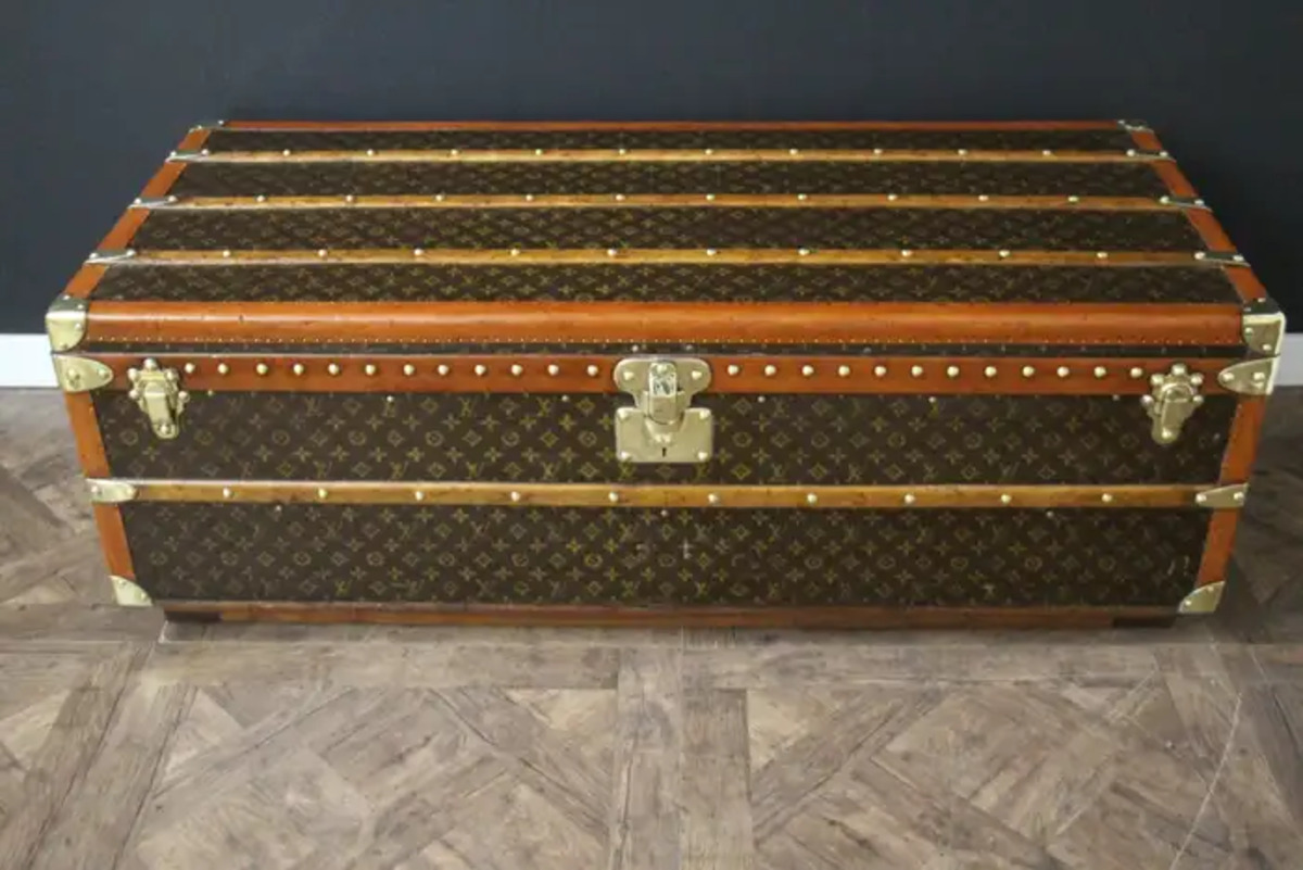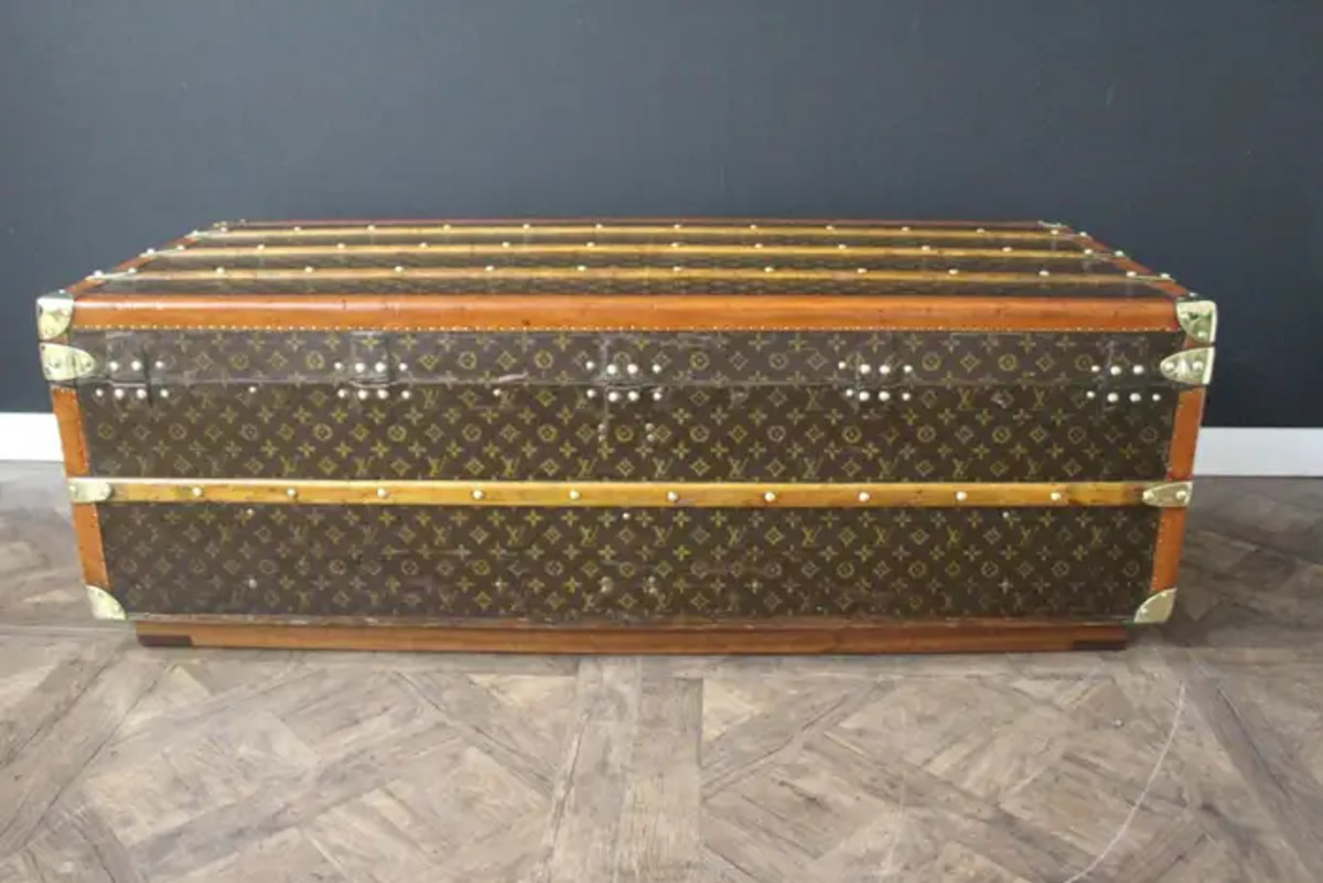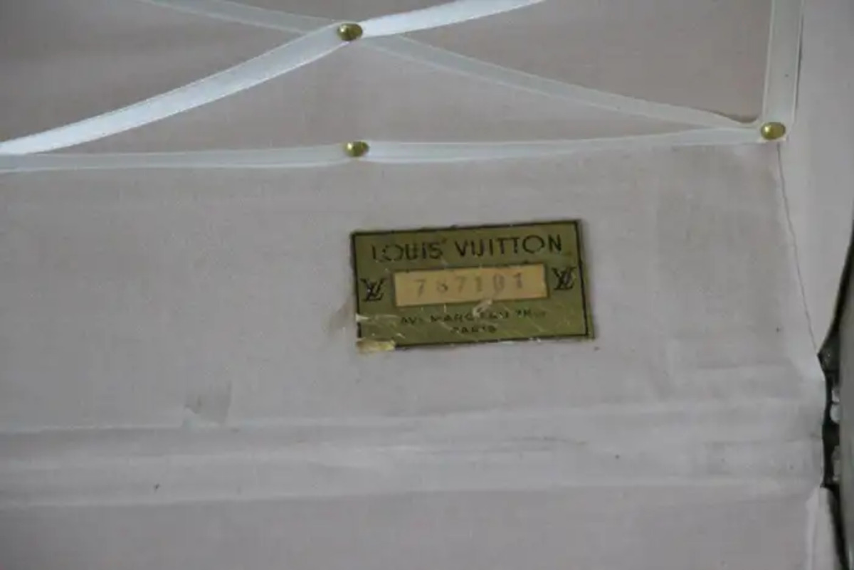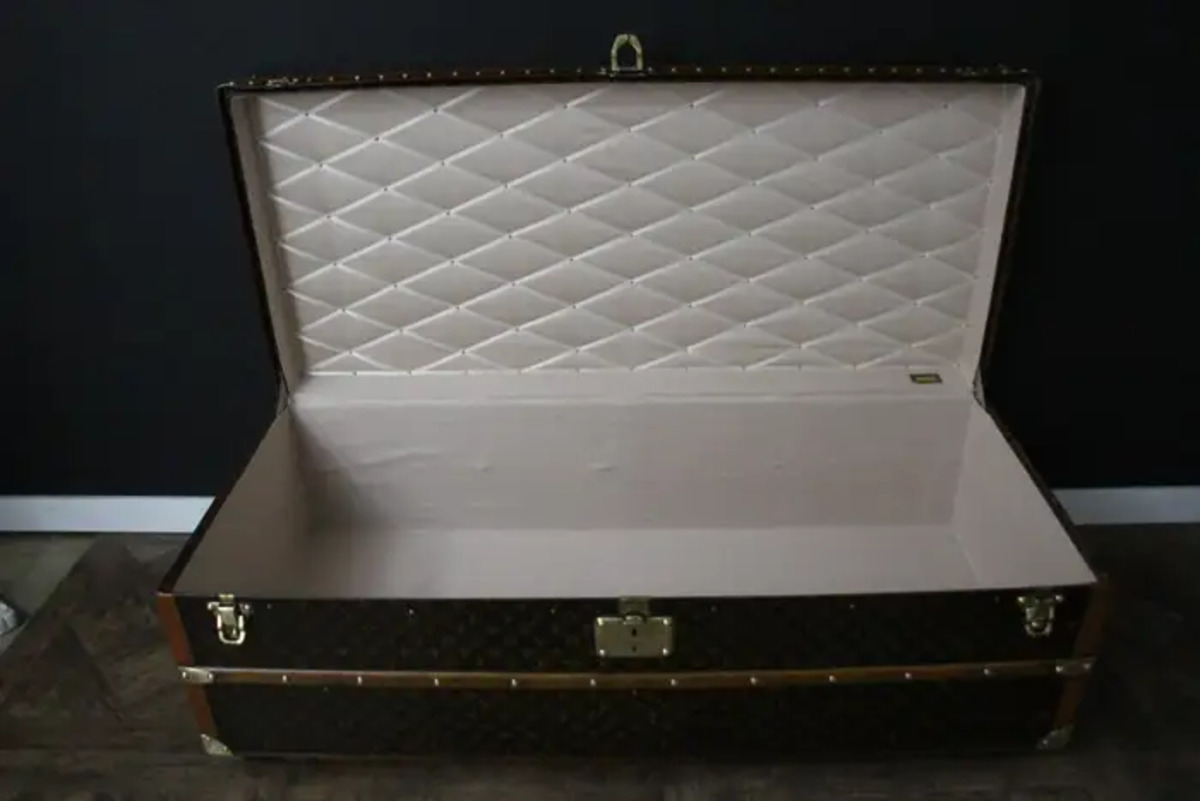 L’intérieur a été regarni il y a quelques temps, exactement comme autrefois. Elle porte toujours son étiquette Louis Vuitton ainsi que son numéro de série. Son intérieur est beau et propre. Son fond a gardé sa toile monogramme d’origine. Elle pourrait être utilisée comme une table basse très élégante et spectaculaire ou comme une malle à couvertures en bout de lit.