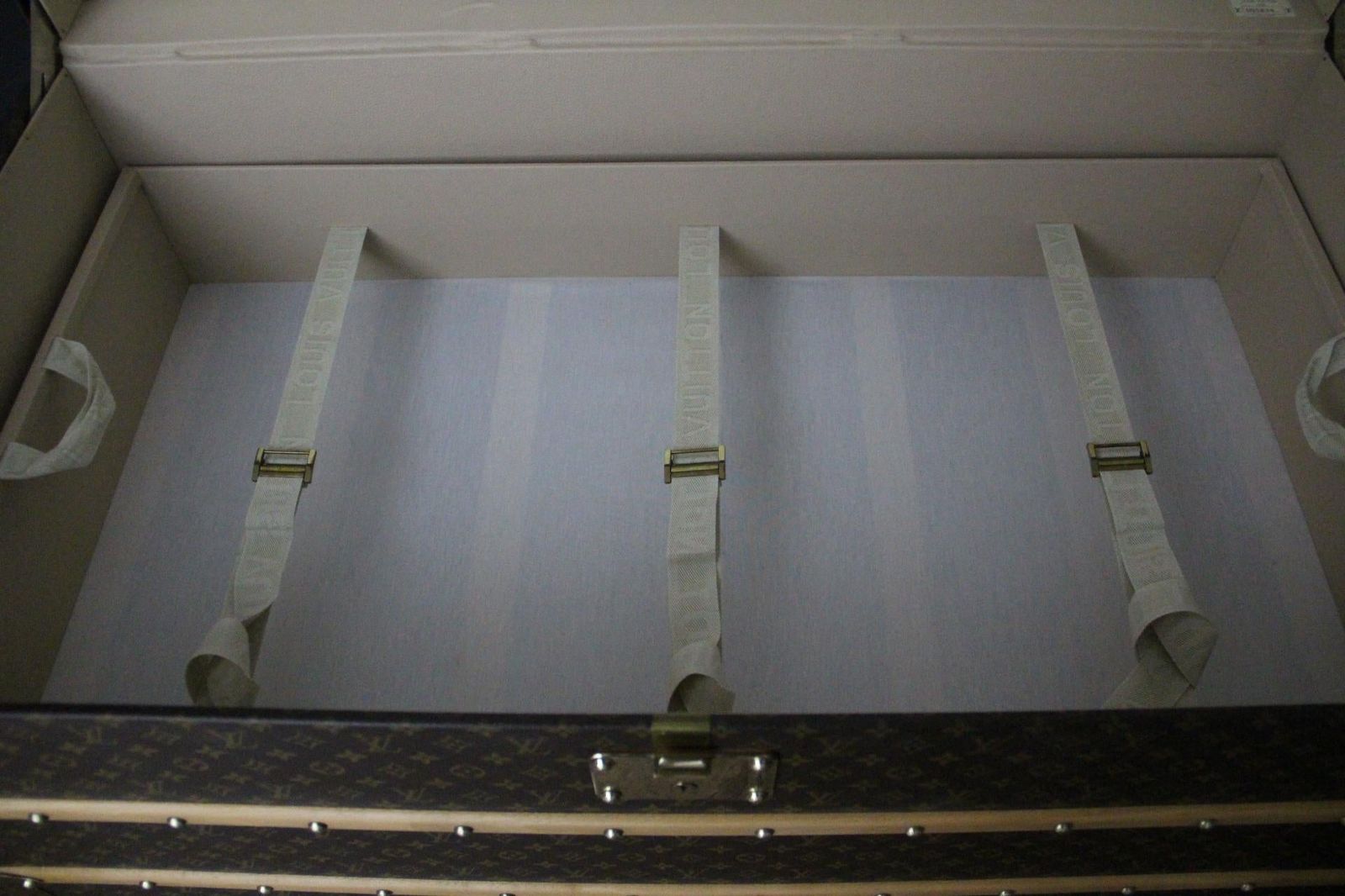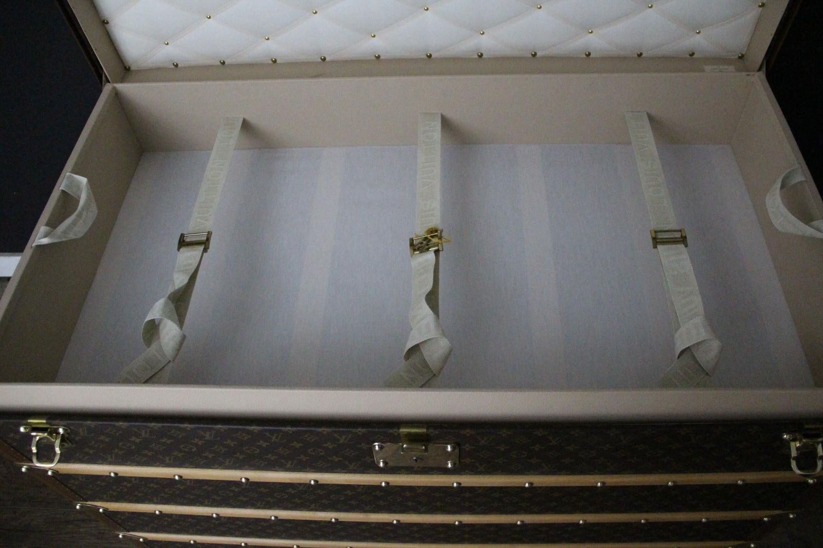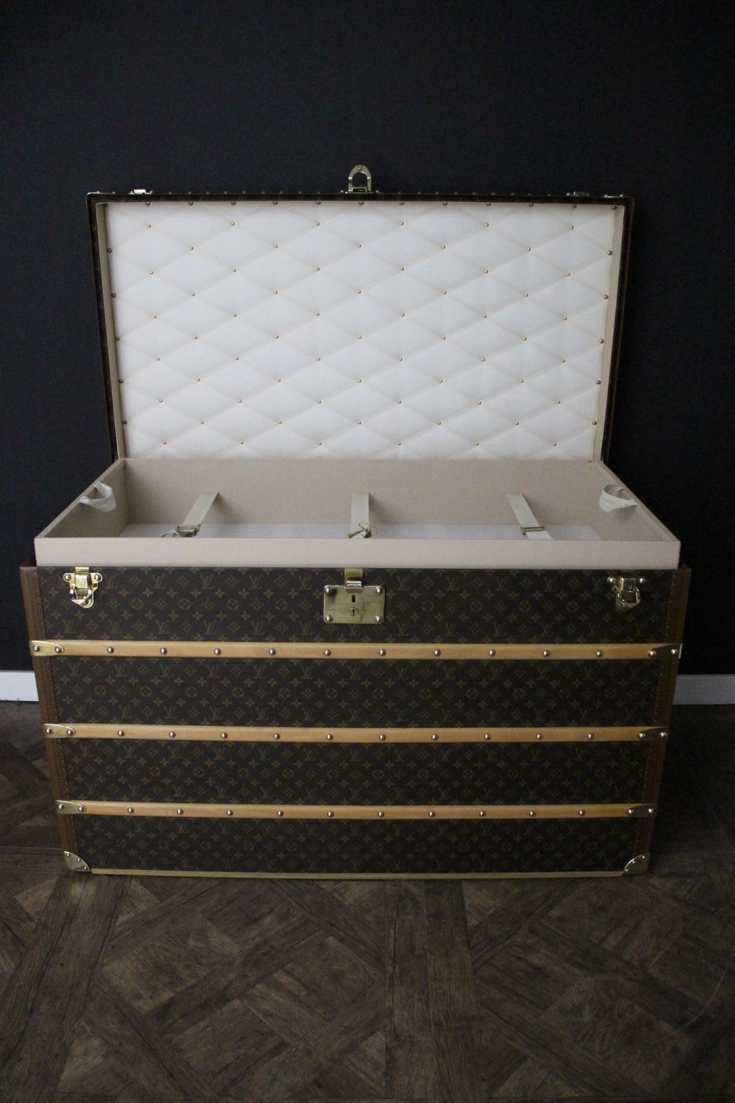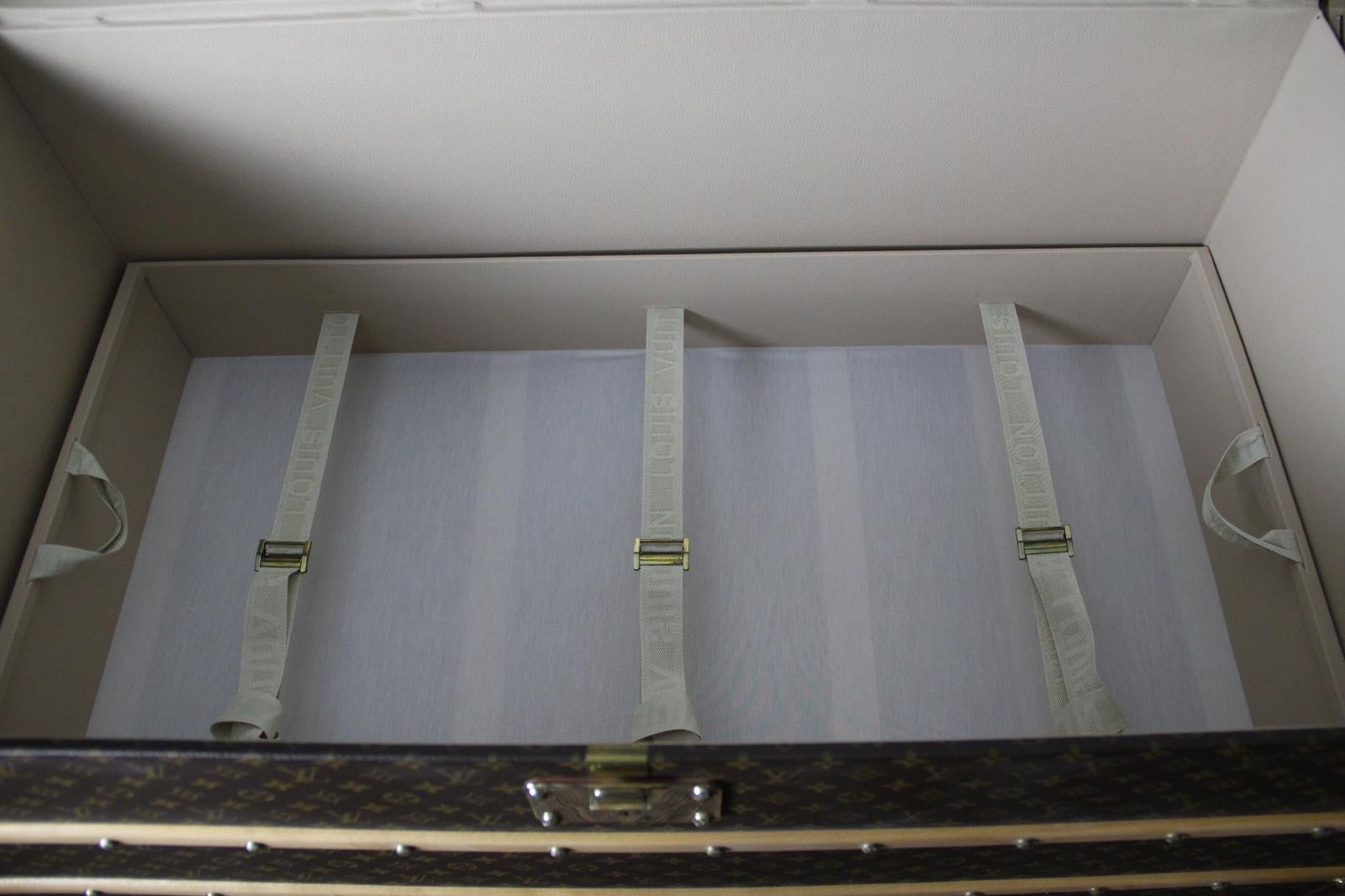 Il s’agit de la plus grande malle jamais produite par Louis Vuitton et elle est très impressionnante. Tout son intérieur est entièrement d’origine, avec ses 3 plateaux amovibles, son capiton sous le capot, son ruban brodé Louis Vuitton, son étiquette Louis Vuitton et son numéro de série. Elle est en très bon état. Elle est très spacieuse et serait très pratique pour le rangement. De plus, elle ne dégage aucune odeur. Elle possède toujours ses 2 clés Vuitton d’origine.