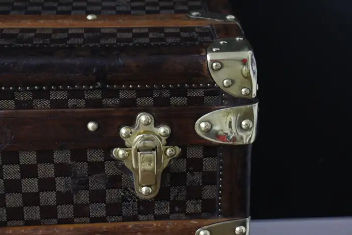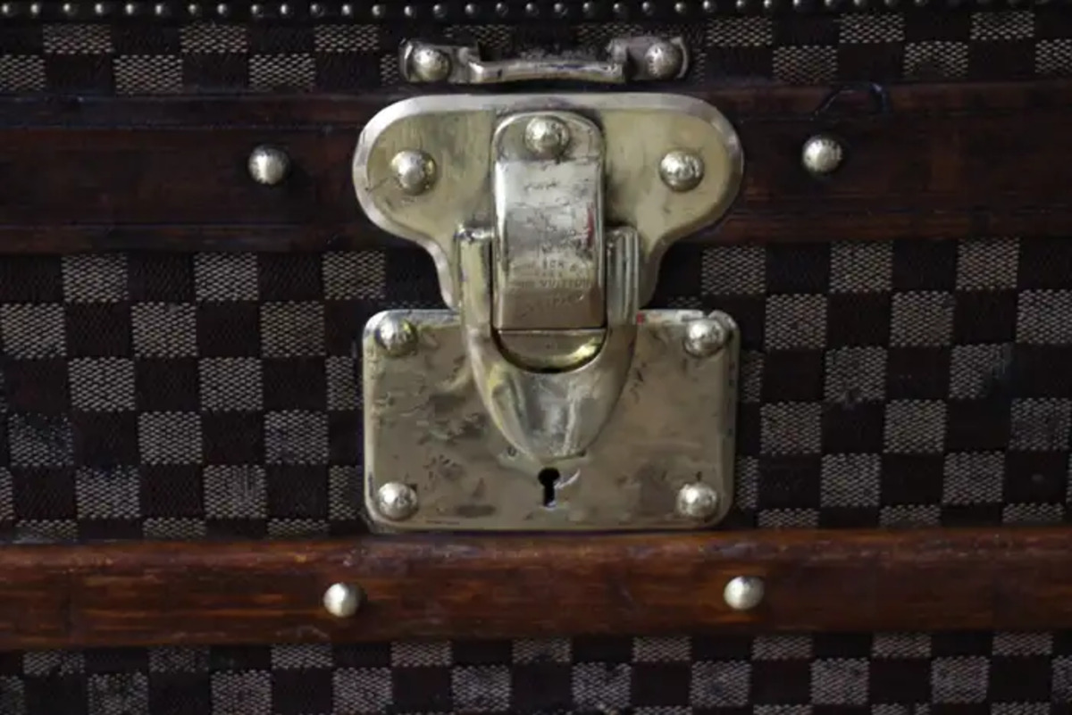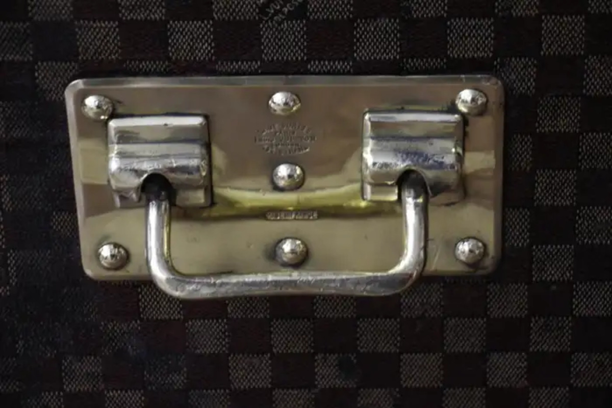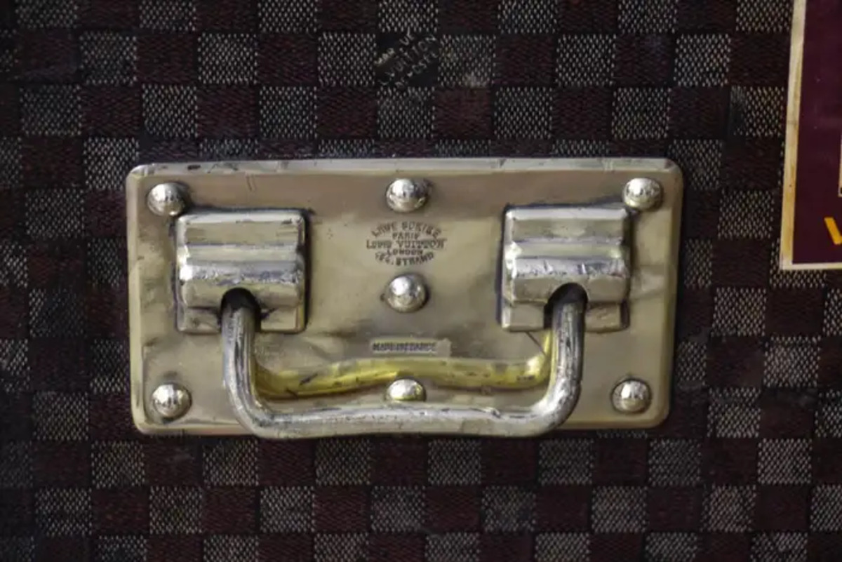 En dessous, sur le fond, cette grande malle Louis Vuitton damiers a conservé son zinc d’origine afin de protéger la malle de l’humidité lorsqu’elle voyageait dans des pays humides. Ses grandes dimensions sont inhabituelles et rendent cette pièce absolument spectaculaire.