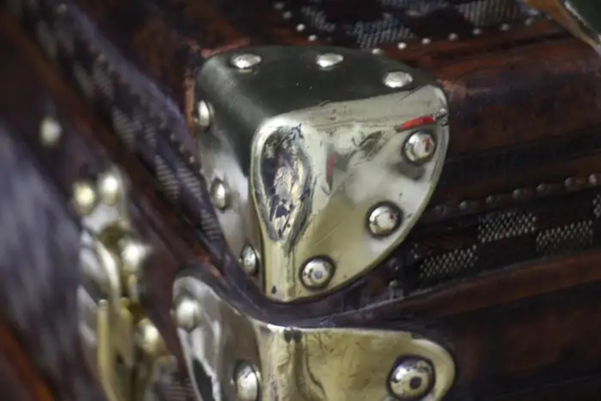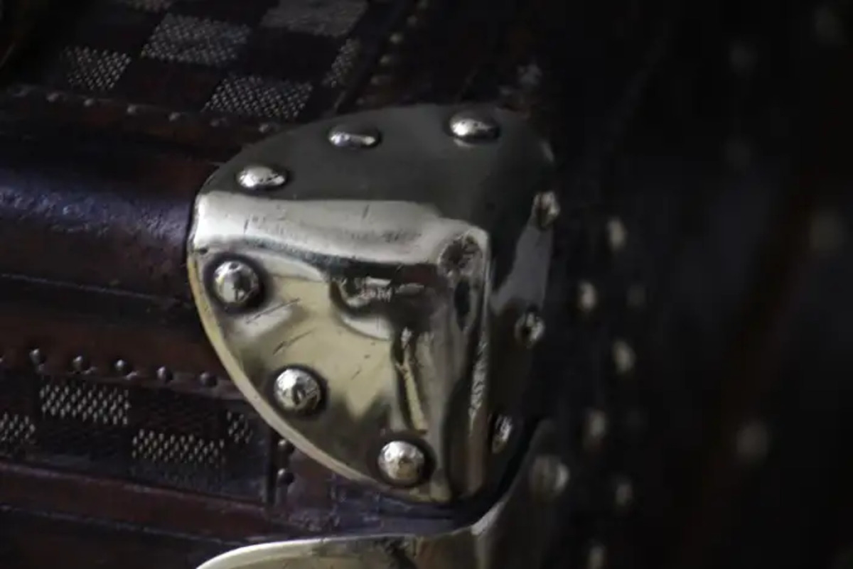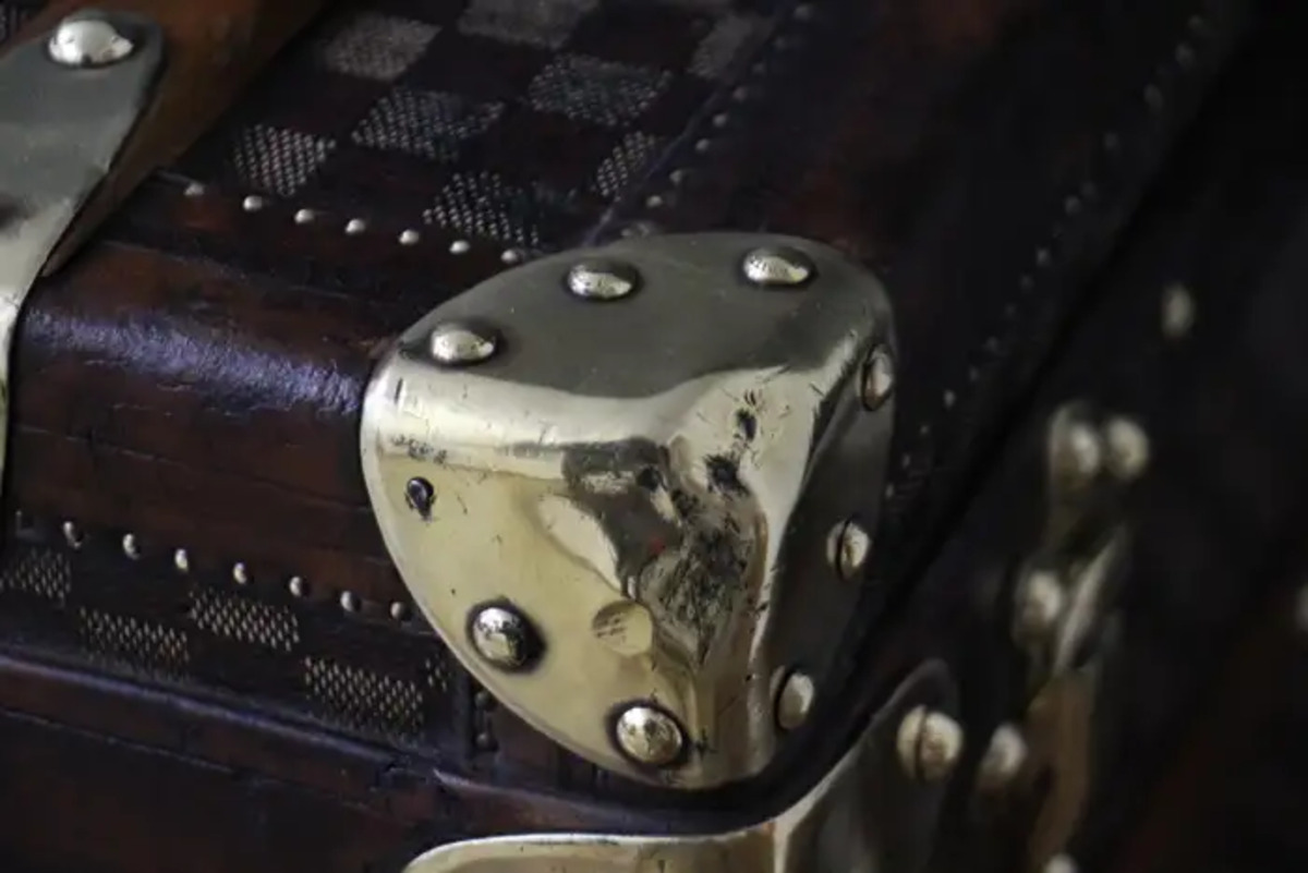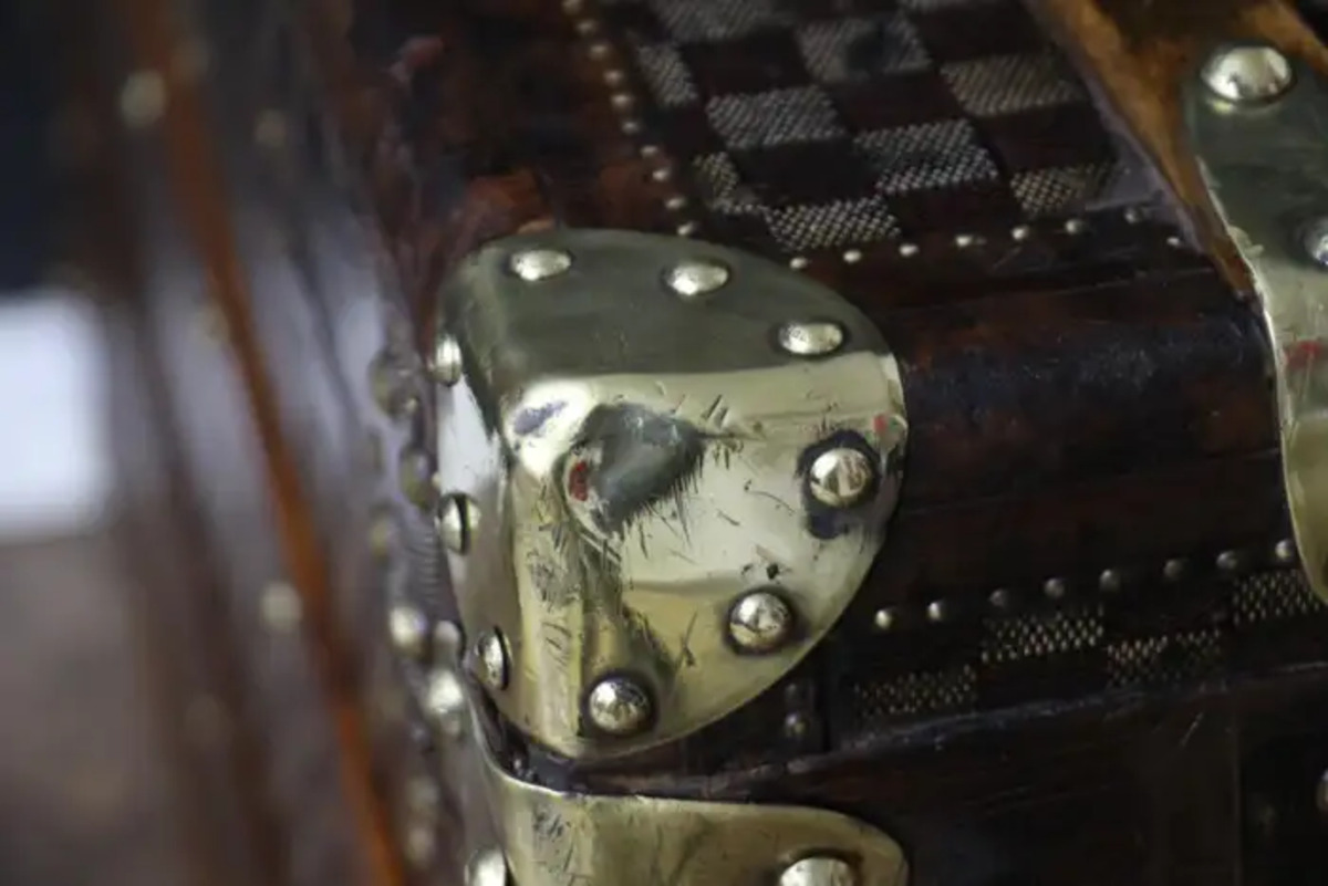 En dessous, sur le fond, cette grande malle Louis Vuitton damiers a conservé son zinc d’origine afin de protéger la malle de l’humidité lorsqu’elle voyageait dans des pays humides. Ses grandes dimensions sont inhabituelles et rendent cette pièce absolument spectaculaire.