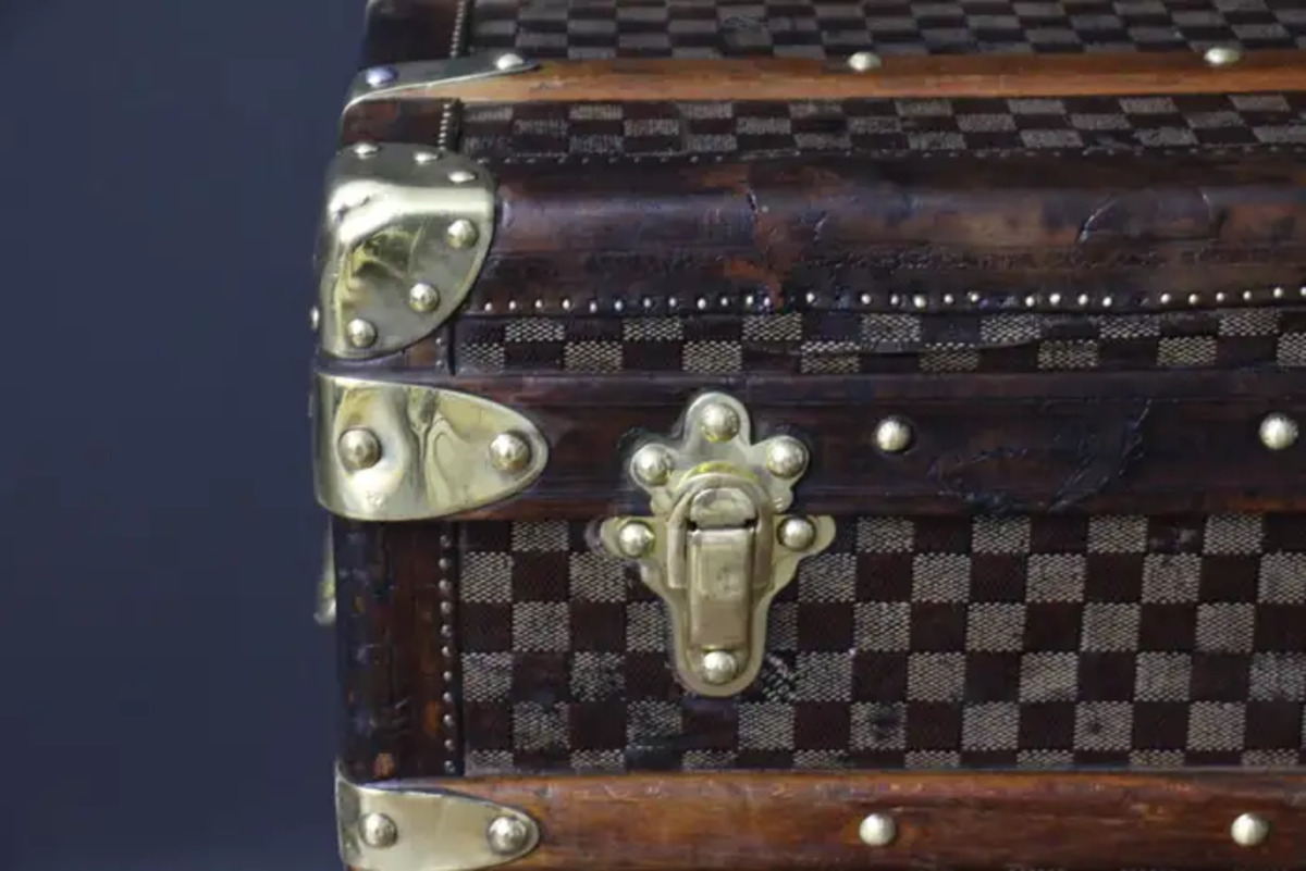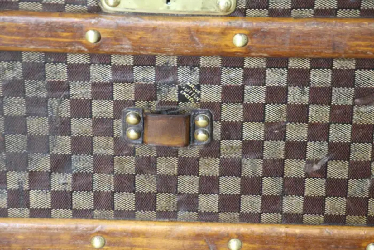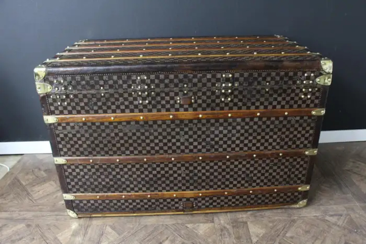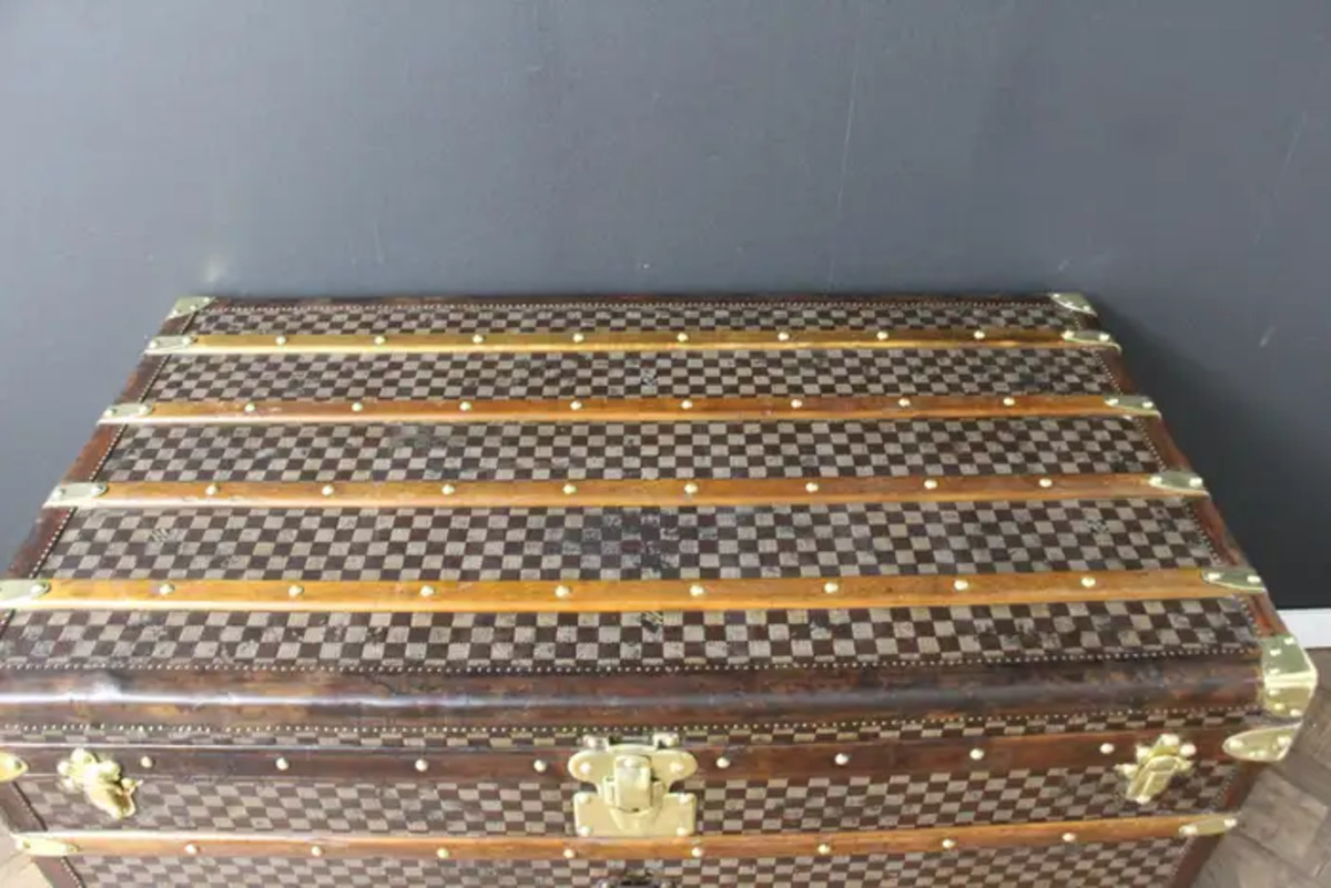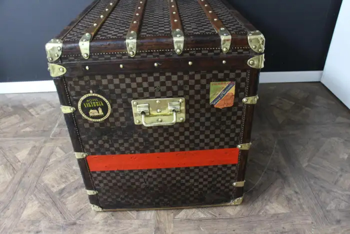 Cette très belle grande malle Louis Vuitton présente la très recherchée toile à damiers, des bordures en cuir couleur chocolat, des serrures et des clous en laiton massif estampillés LV, ainsi que des poignées latérales et des coins en laiton massif.