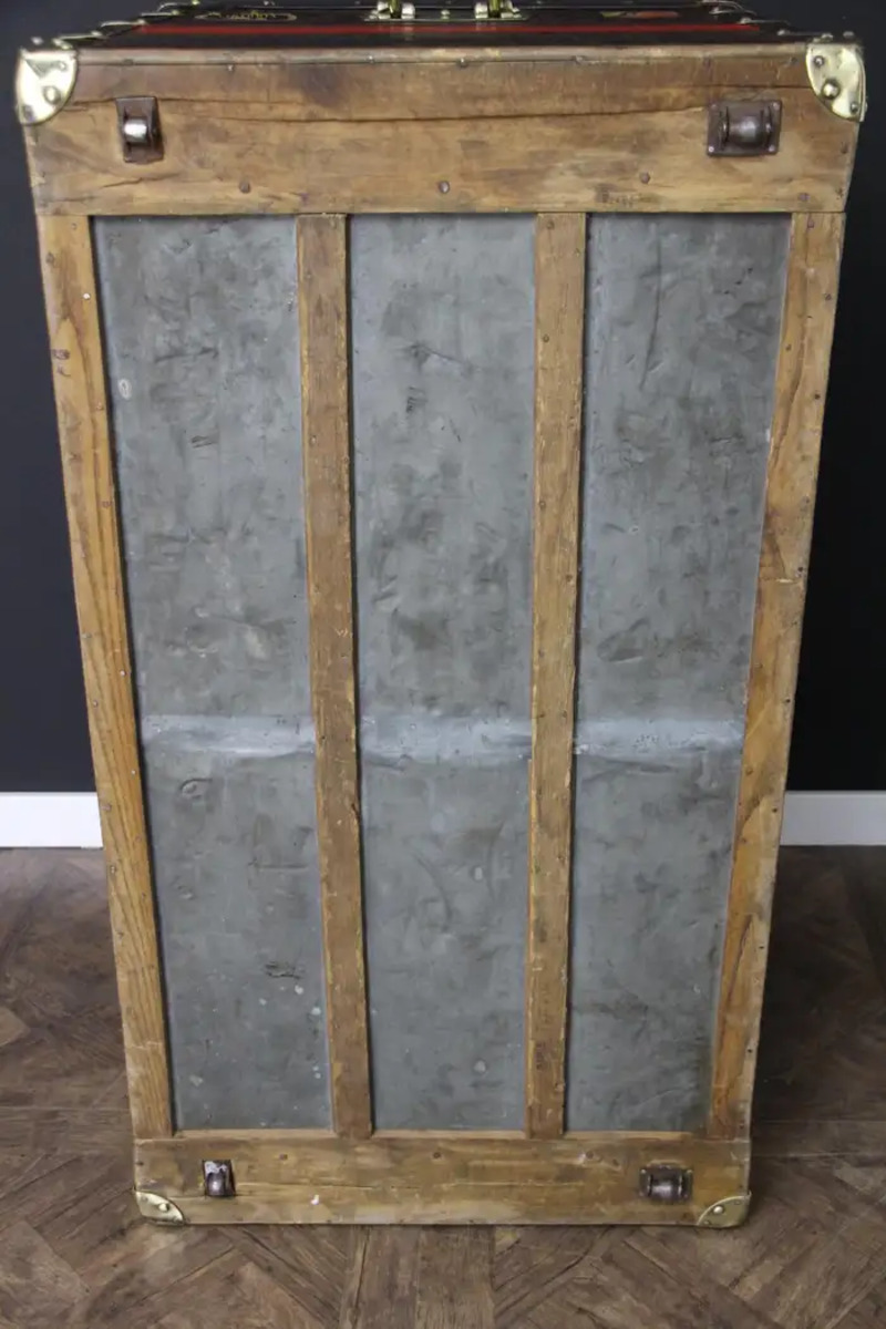 Ses bandes d’écurie rouges personnalisées peintes à la main ainsi que ses quelques étiquettes de voyage ajoutent une touche de personnalité. Cette malle Vuitton bénéficie d’une belle patine d’origine et est très élégante.