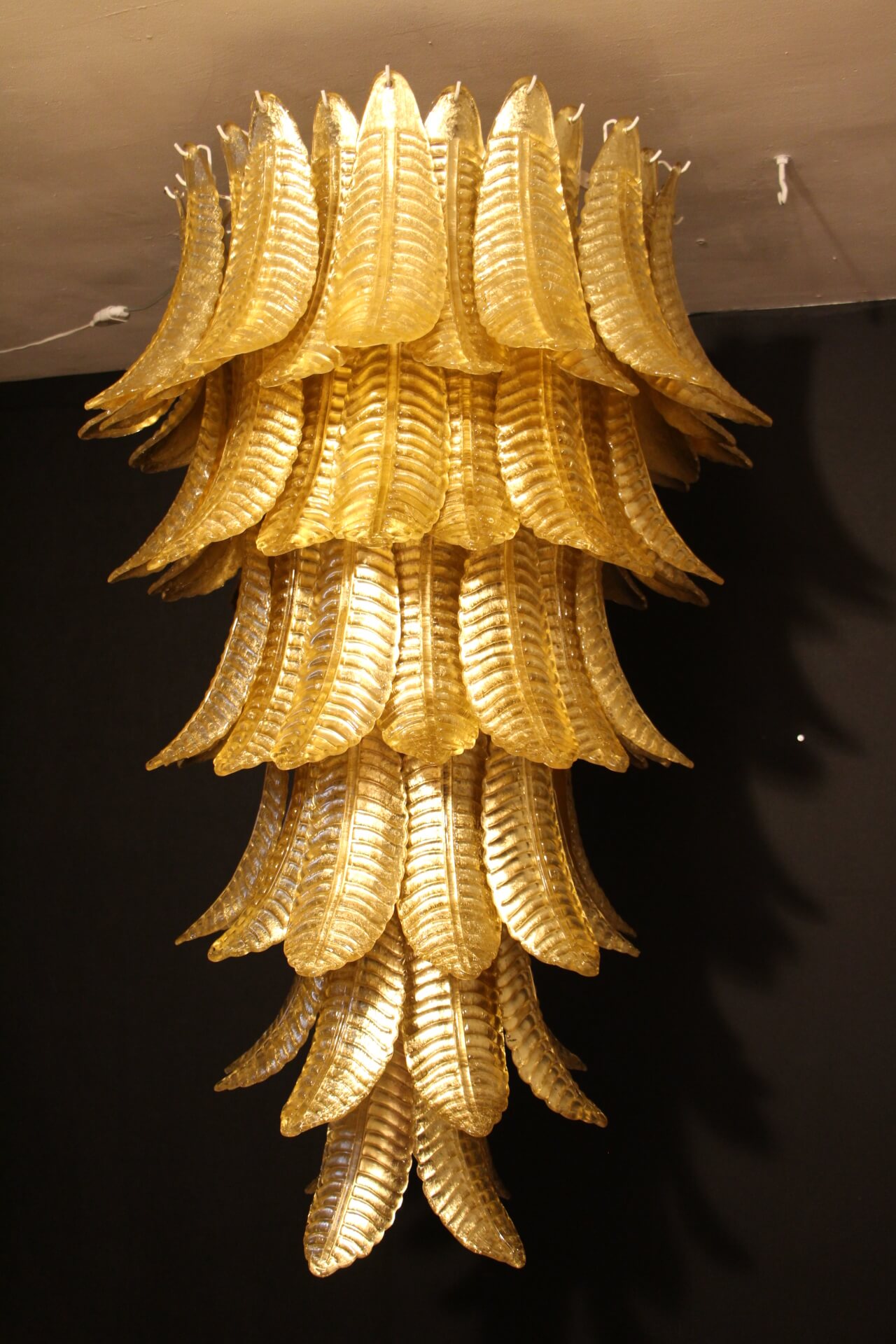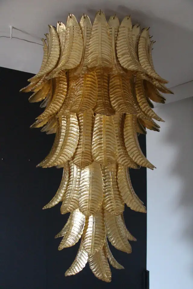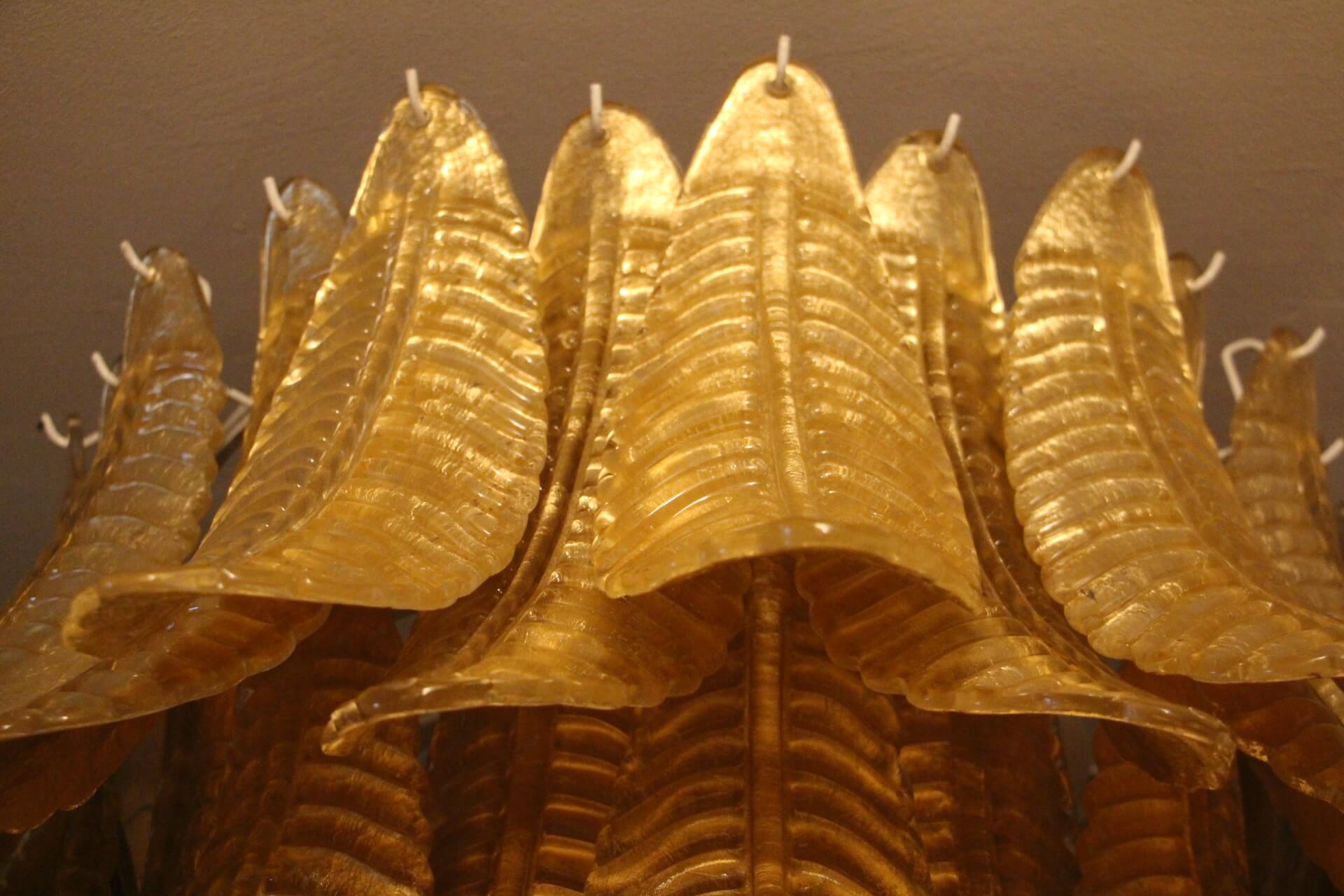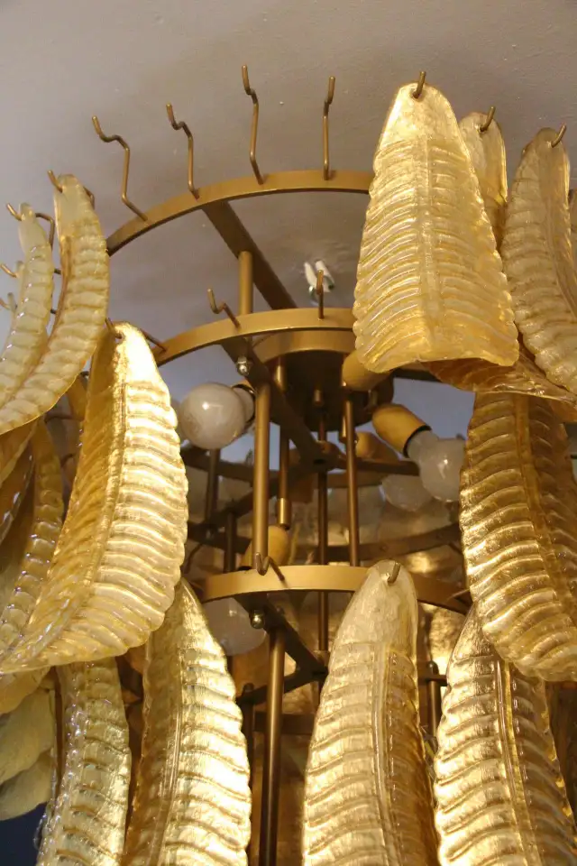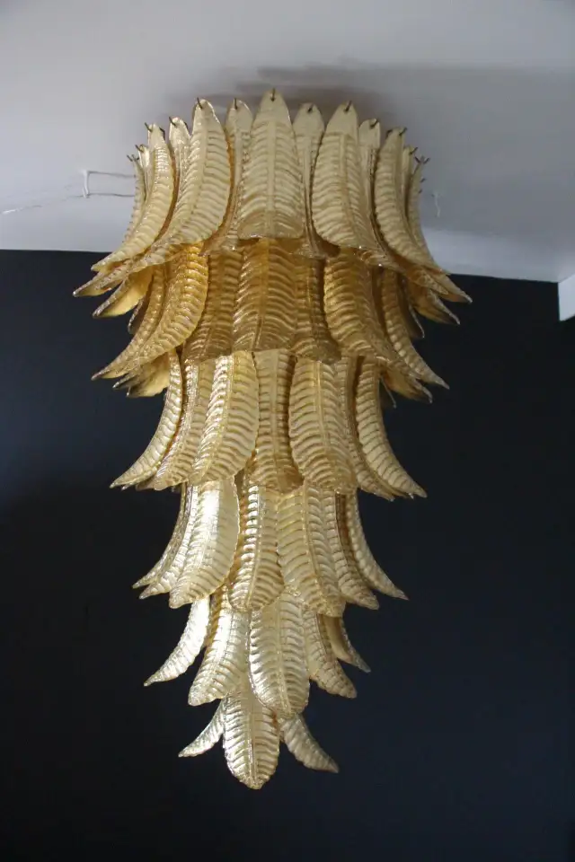 Ce lustre vintage long doré en verre de Murano en forme de palmier est spectaculaire. Entièrement fabriqué à la main à Murano, chaque feuille a été réalisée individuellement en verre soufflé de haute qualité, c’est pourquoi on peut remarquer de très légères différences d’une pièce à l’autre. Sa couleur or a été réalisée grâce à la technique de la feuille d’or 24 carats. C’est de la verrerie d’art de qualité supérieure en même temps qu’un éclairage très décoratif. C’est un élément central dans une pièce, rayonnant de beauté éclairé ou éteint. Ce lustre palmier vintage est extrêmement décoratif et peut être utilisé dans toutes les pièces ou dans des escaliers. Sa lumière est chaleureuse et très agréable. Il y a un total de 88 palmettes en verre et son poids total est d’environ 55 kg. Structure en acier blanc. 9 ampoules.