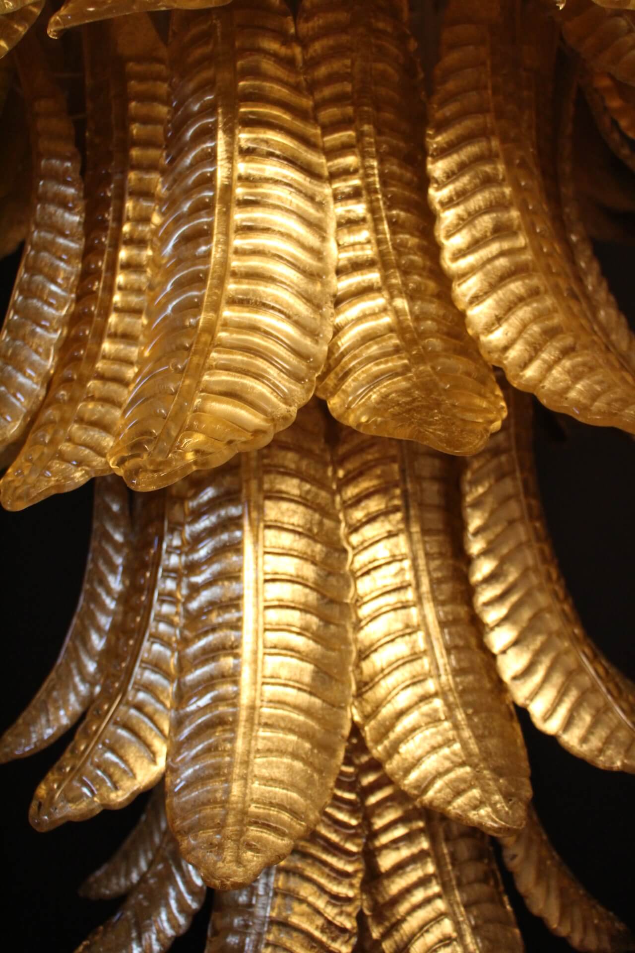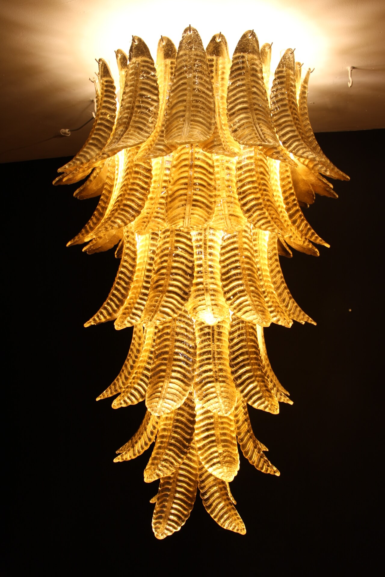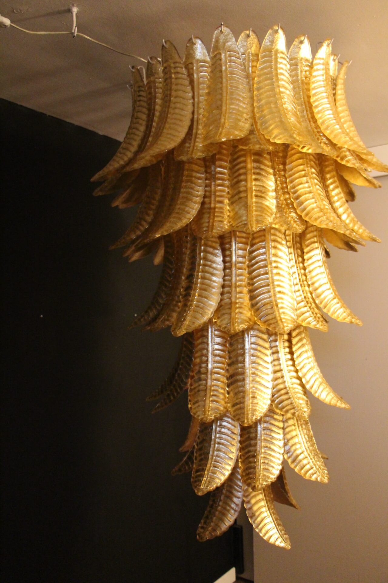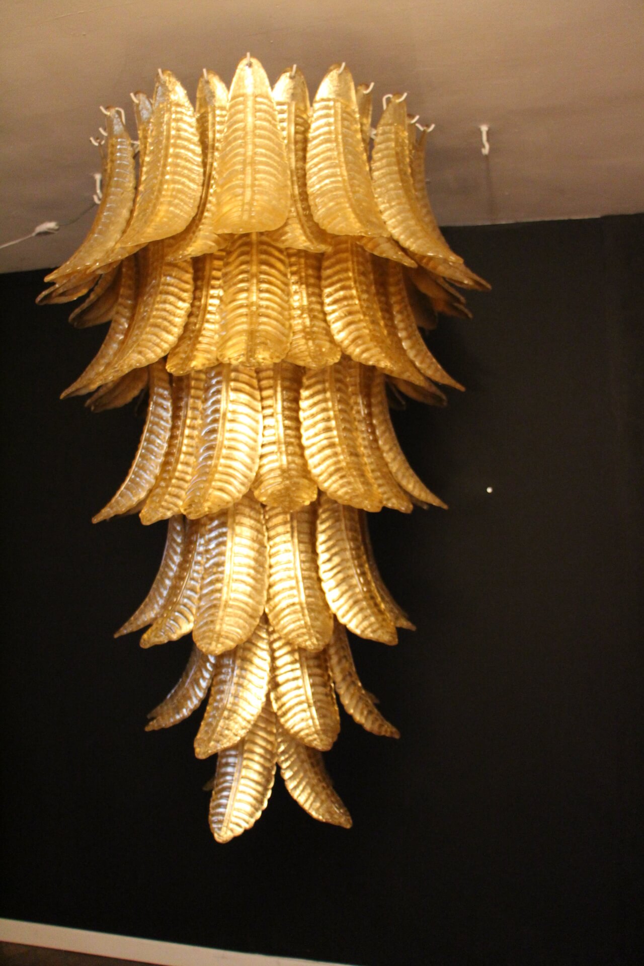 Ce lustre vintage long doré en verre de Murano en forme de palmier est spectaculaire. Entièrement fabriqué à la main à Murano, chaque feuille a été réalisée individuellement en verre soufflé de haute qualité, c’est pourquoi on peut remarquer de très légères différences d’une pièce à l’autre. Sa couleur or a été réalisée grâce à la technique de la feuille d’or 24 carats. C’est de la verrerie d’art de qualité supérieure en même temps qu’un éclairage très décoratif. C’est un élément central dans une pièce, rayonnant de beauté éclairé ou éteint. Ce lustre palmier vintage est extrêmement décoratif et peut être utilisé dans toutes les pièces ou dans des escaliers. Sa lumière est chaleureuse et très agréable. Il y a un total de 88 palmettes en verre et son poids total est d’environ 55 kg. Structure en acier blanc. 9 ampoules.