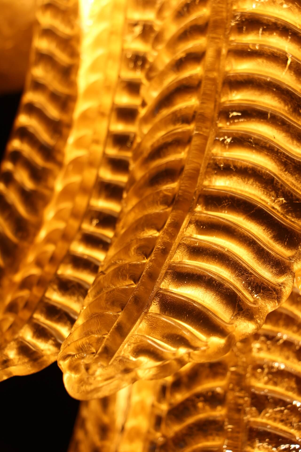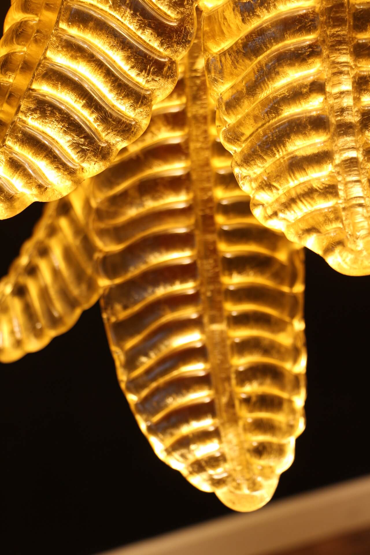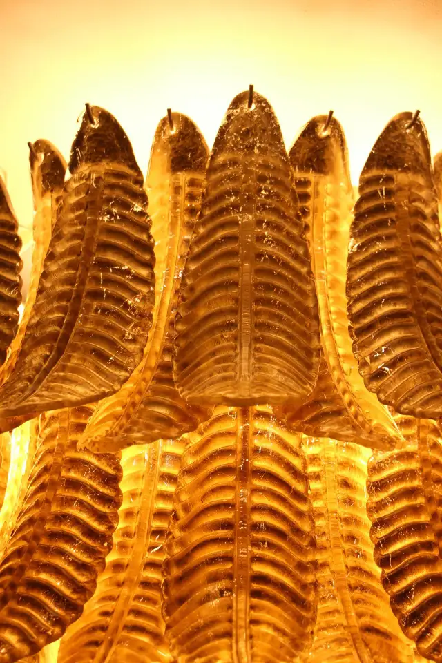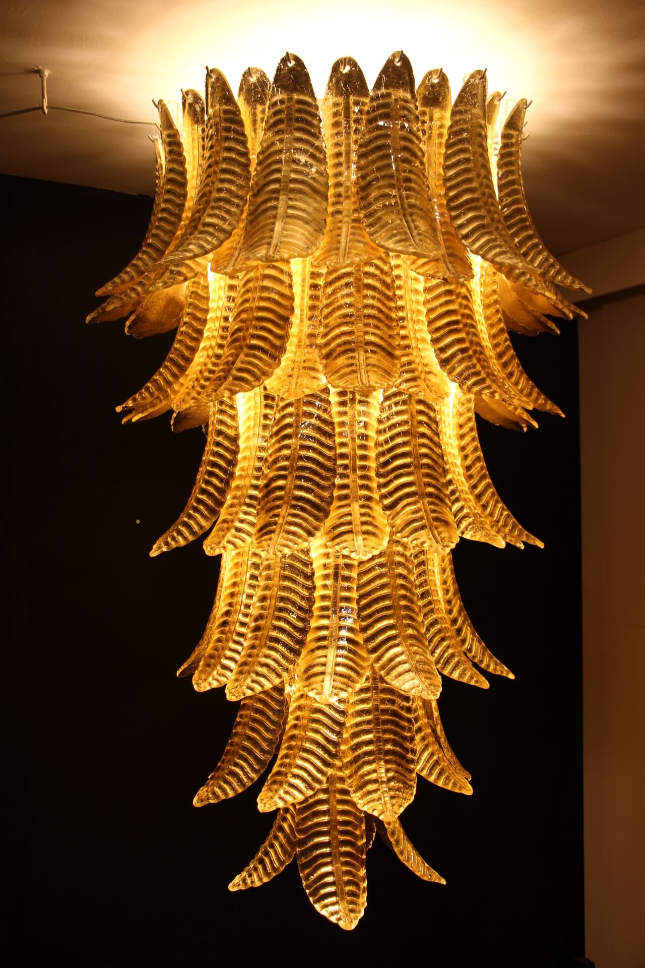 Ce lustre vintage long doré en verre de Murano en forme de palmier est spectaculaire. Entièrement fabriqué à la main à Murano, chaque feuille a été réalisée individuellement en verre soufflé de haute qualité, c’est pourquoi on peut remarquer de très légères différences d’une pièce à l’autre. Sa couleur or a été réalisée grâce à la technique de la feuille d’or 24 carats. C’est de la verrerie d’art de qualité supérieure en même temps qu’un éclairage très décoratif. C’est un élément central dans une pièce, rayonnant de beauté éclairé ou éteint. Ce lustre palmier vintage est extrêmement décoratif et peut être utilisé dans toutes les pièces ou dans des escaliers. Sa lumière est chaleureuse et très agréable. Il y a un total de 88 palmettes en verre et son poids total est d’environ 55 kg. Structure en acier blanc. 9 ampoules.