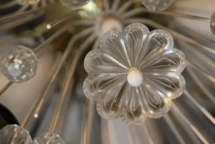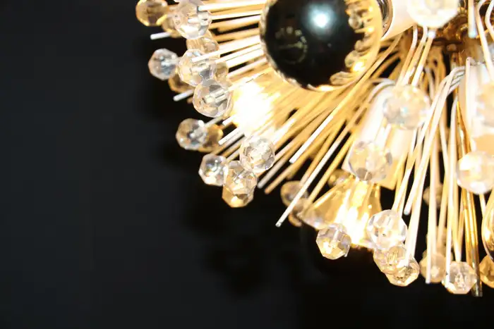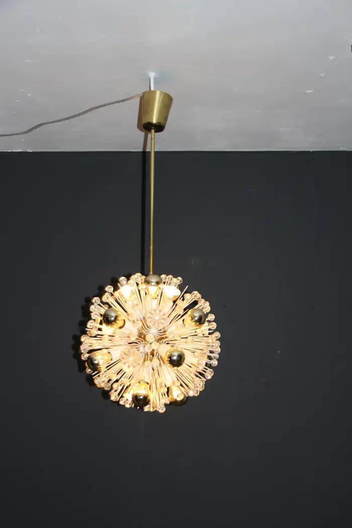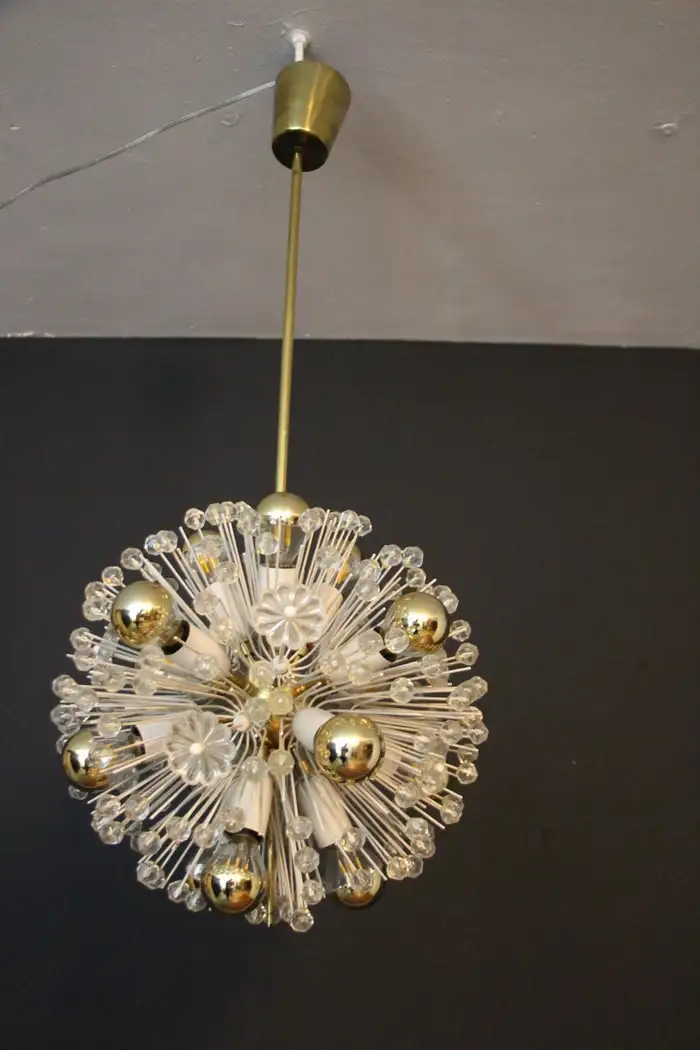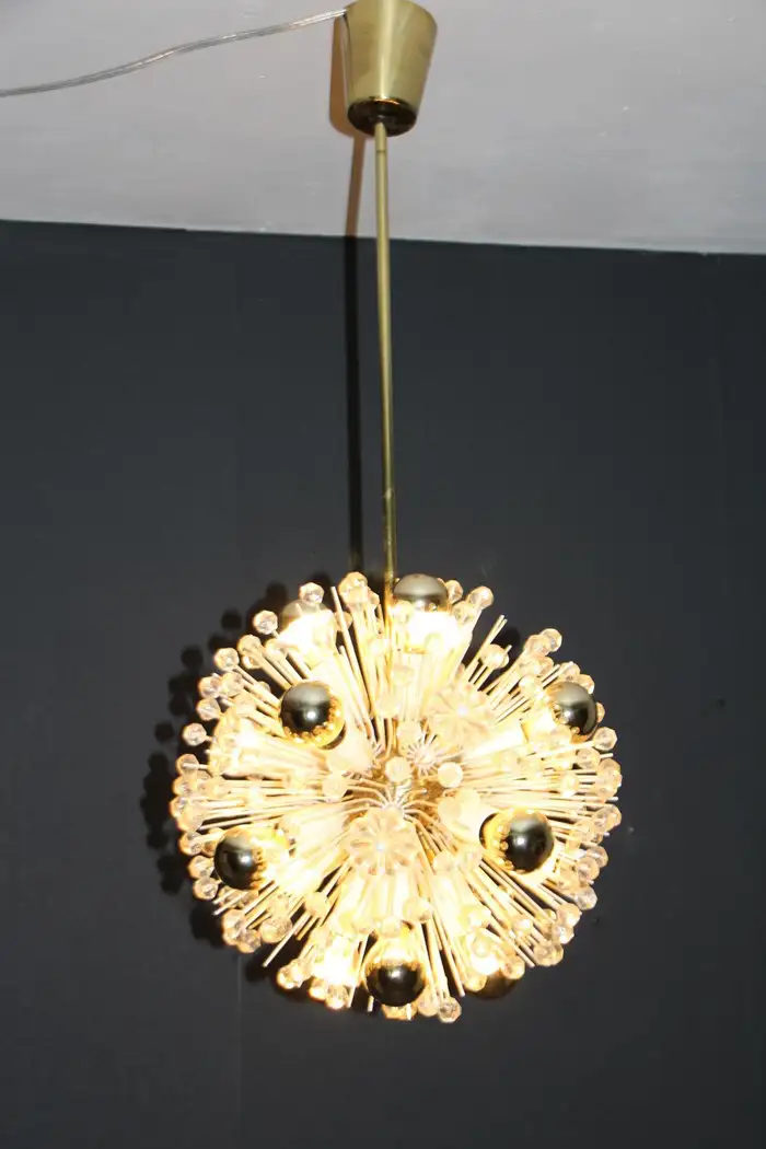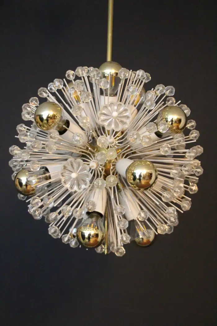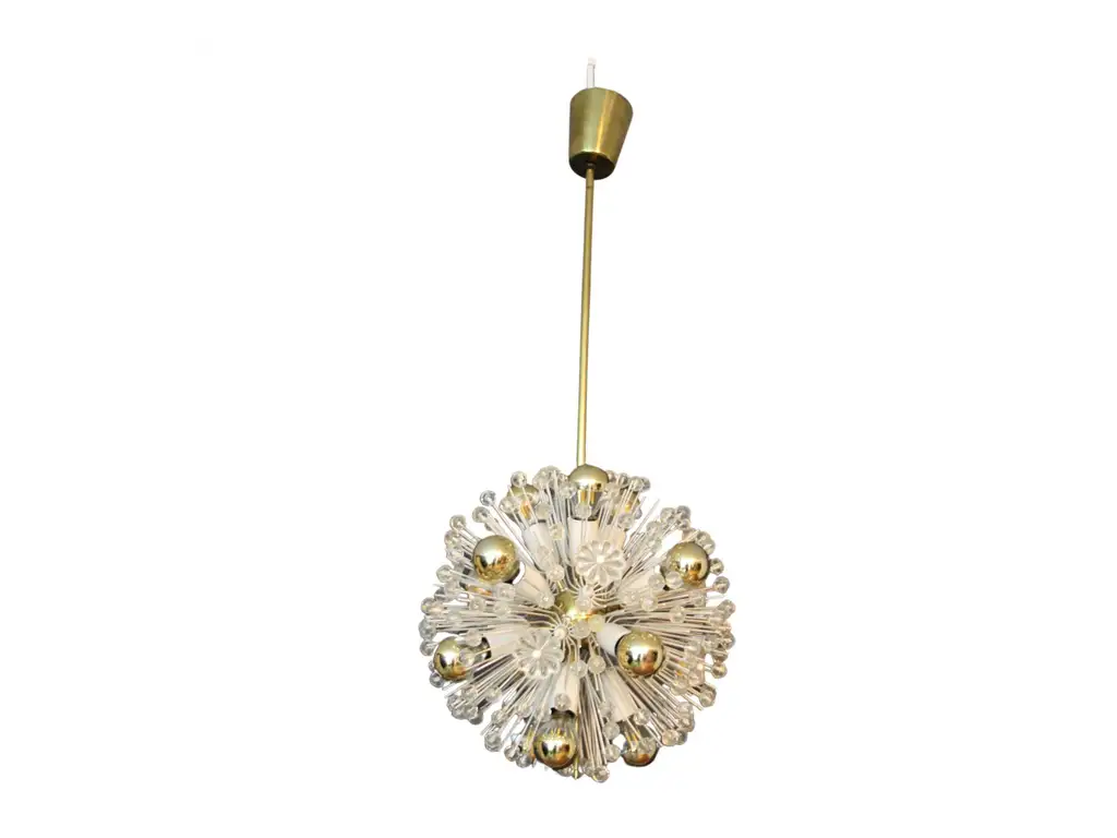 Ce spectaculaire lustre Spoutnik ressemble à une explosion de fleurs et se compose d’une multitude de tiges en laiton terminées par des bulbes ou des fleurs en cristal clair. Chaque tige est directement fixée sur sa sphère centrale en laiton poli.