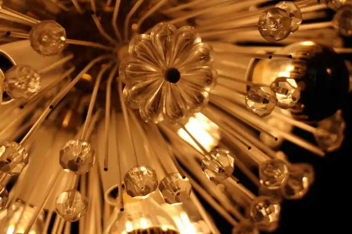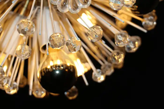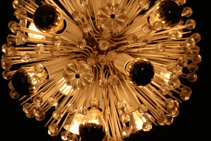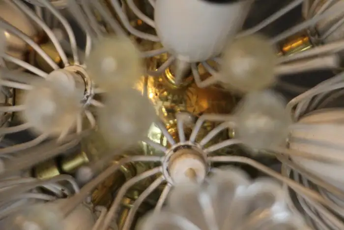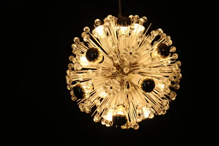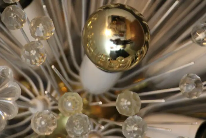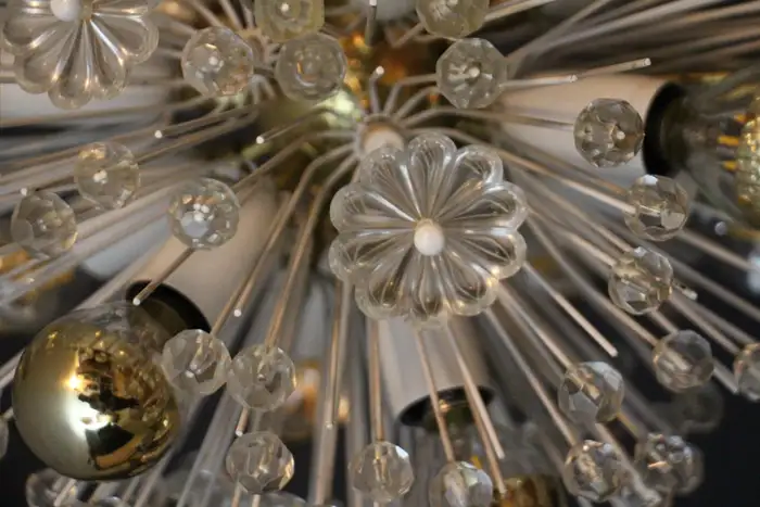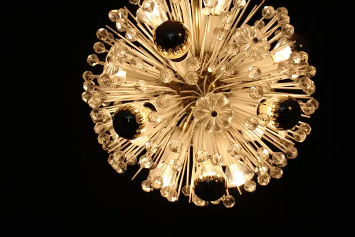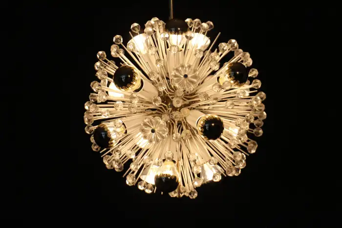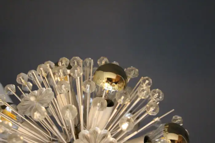 Il est équipé d’ampoules à réflecteur doré afin de masquer la lumière directe et d’obtenir une lumière très chaleureuse et agréable. Ce lustre année 50 moderne est à la fois très puissant et extrêmement délicat. Il présente un style floral et organique très moderne. Il faut 12 ampoules.