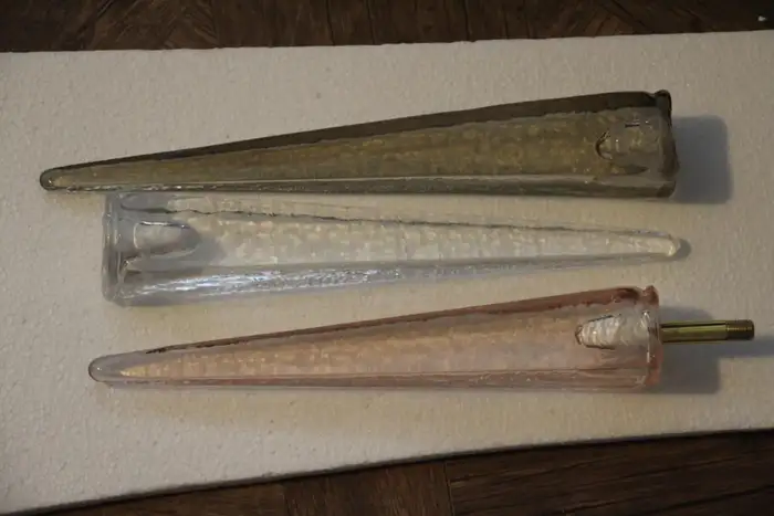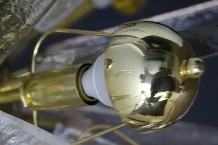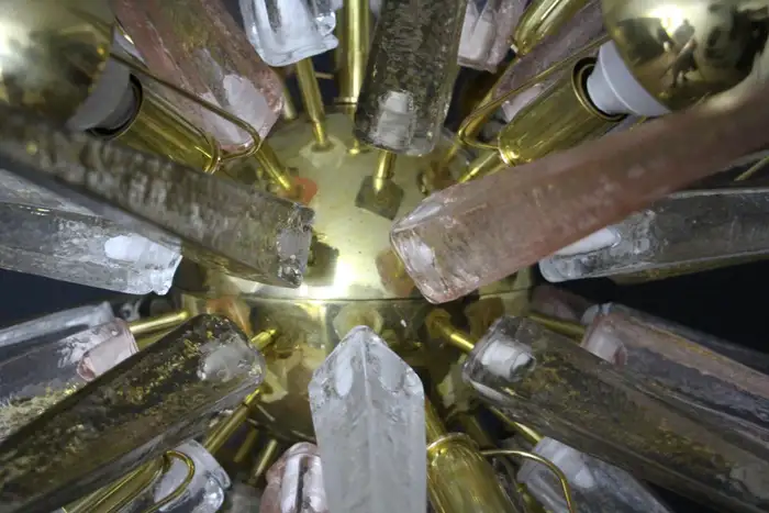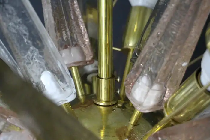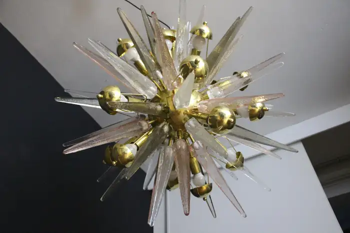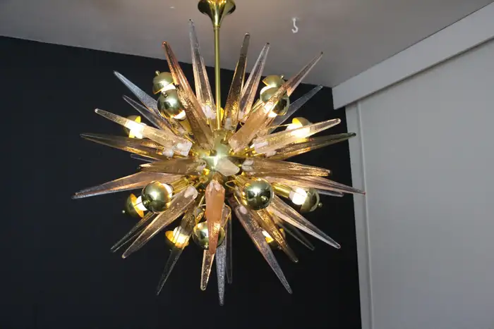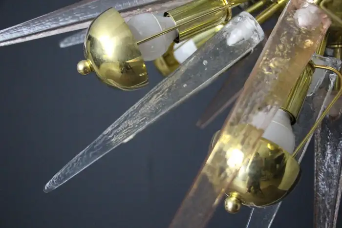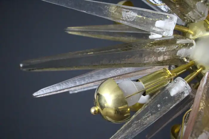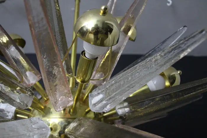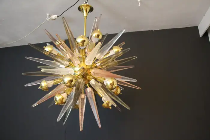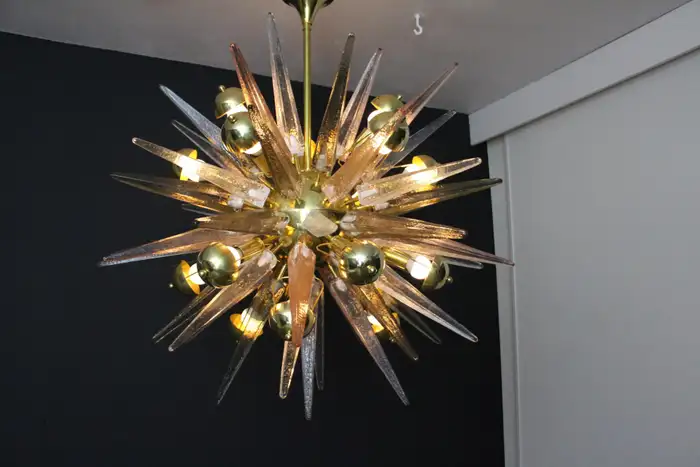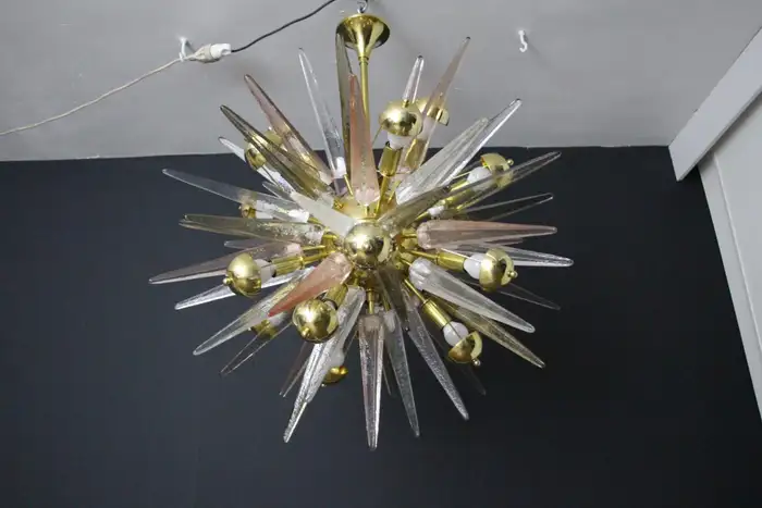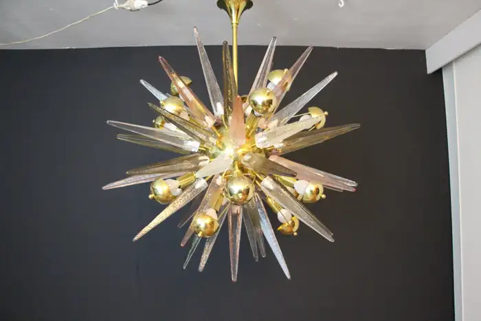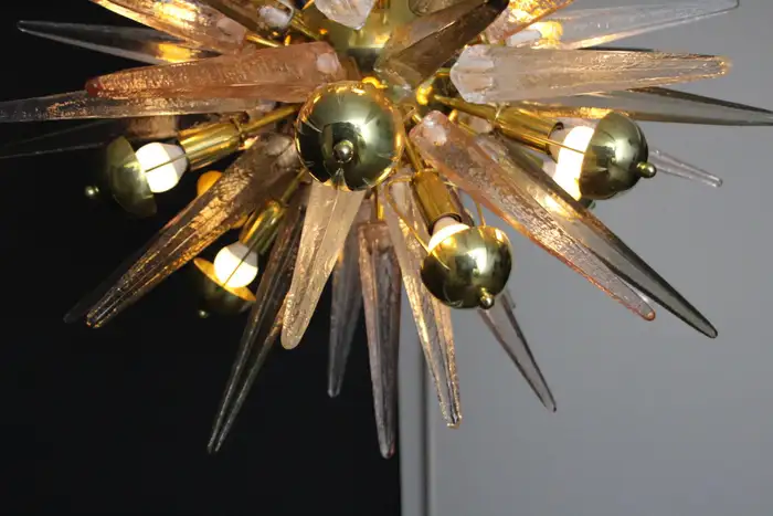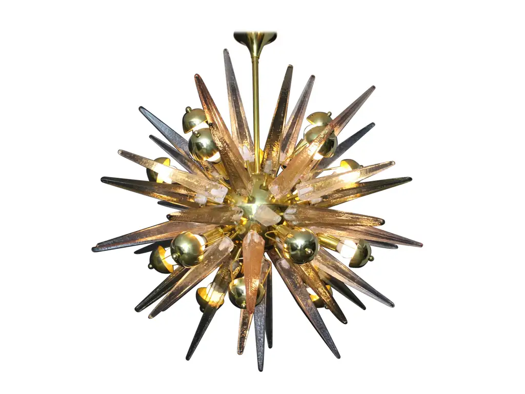 Ce lustre spectaculaire présente de magnifiques pointes en verre de Murano de couleur fumée, cristal et rose tendre. Chaque pointe est directement fixée sur sa sphère centrale en laiton poli. Ses pointes ressemblent à des stalactites de glace et confèrent à ce luminaire un aspect très unique. Il comporte un abat-jour en laiton sur chaque ampoule afin de masquer la lumière directe et d’obtenir une lumière très chaude et agréable. Il nécessite 18 ampoules. Chaque pointe de verre a été fabriquée individuellement à la main par des artisans de Murano. Ce lustre sputnik avec pointes en verre de Murano est si élégant et a une telle présence dans une pièce qu’il deviendra à coup sûr un véritable sujet de conversation. Il est câblé pour les États-Unis et l’Europe. Actuellement, il mesure 125 cm de haut, mais sa hauteur peut être portée à 94 cm sur demande spéciale.