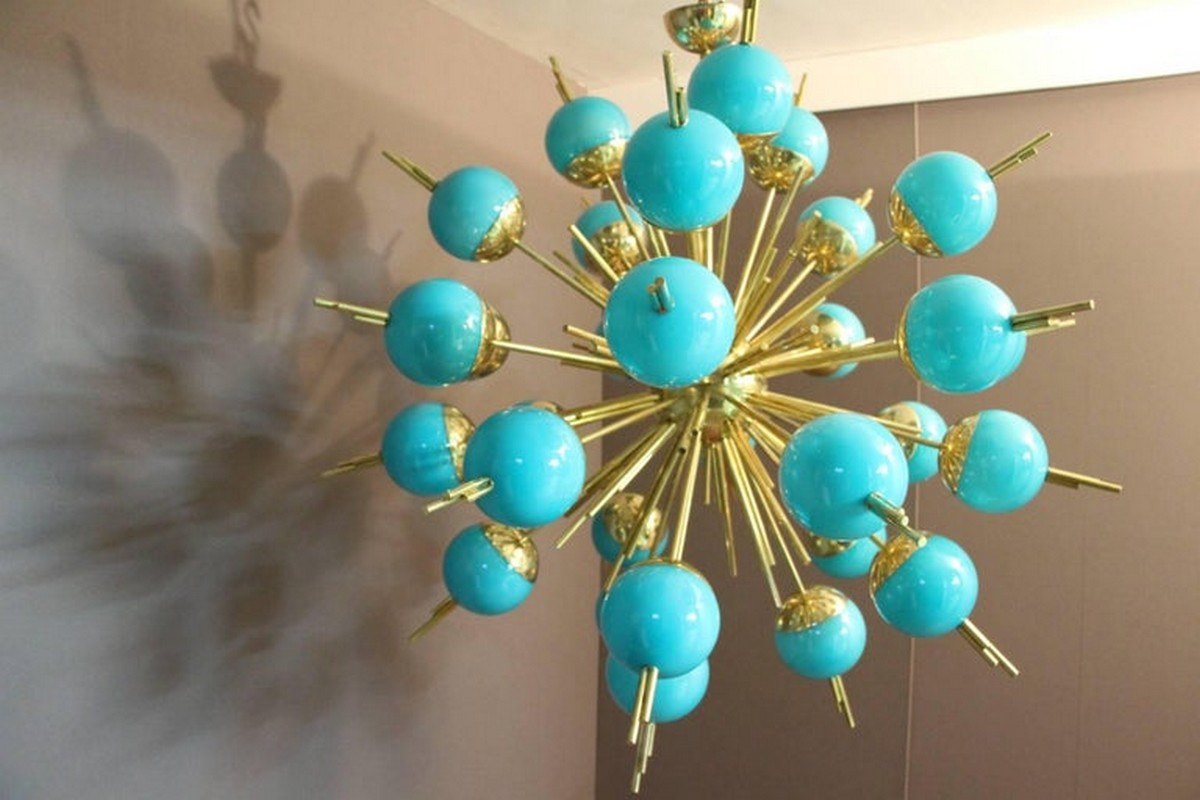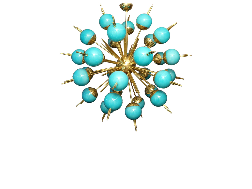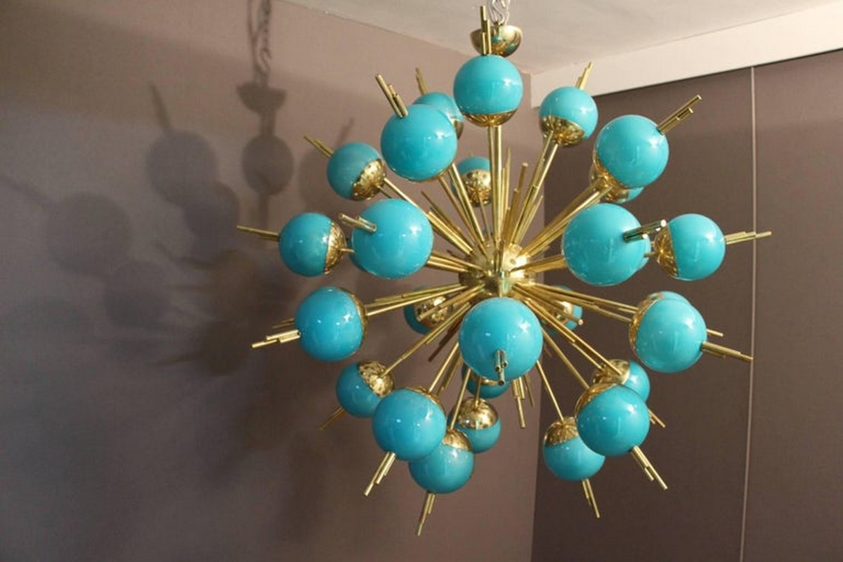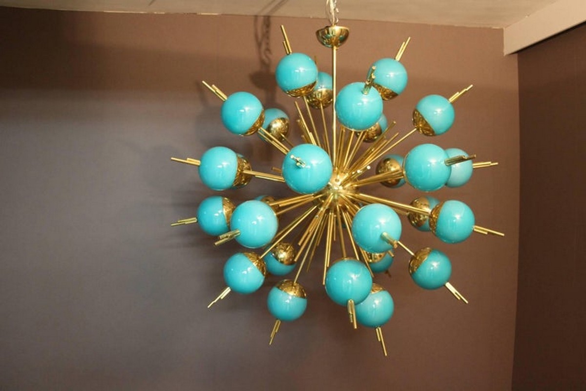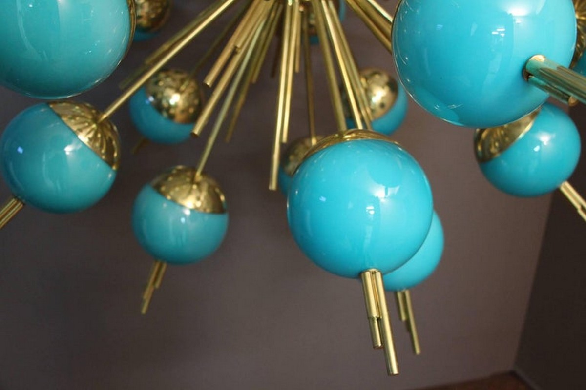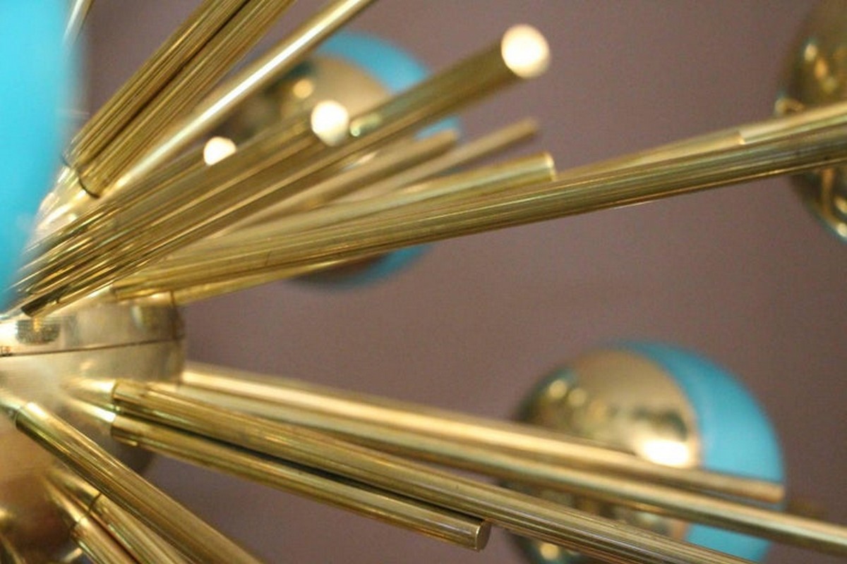 Ce Lustre Sputnik en laiton et globes très inhabituel comprend 30 globes en verre turquoise montés sur des tiges en laiton. Lorsque la lumière est allumée:: ses globes turquoise deviennent bleu clair et il est toujours aussi magnifique. Accepte les ampoules E14. Câblé pour les États-Unis