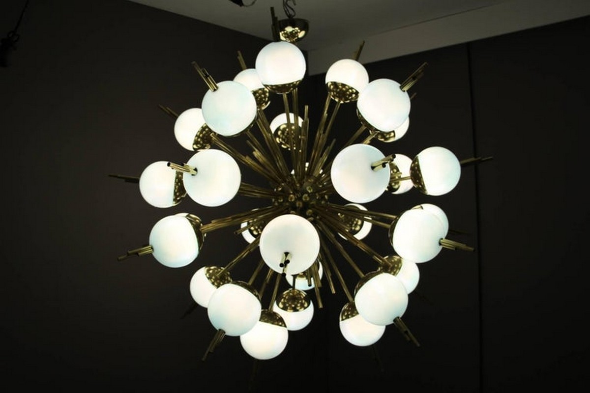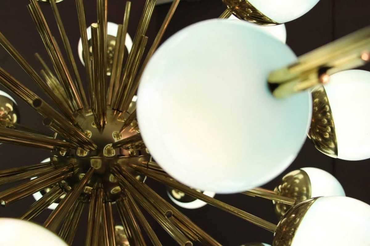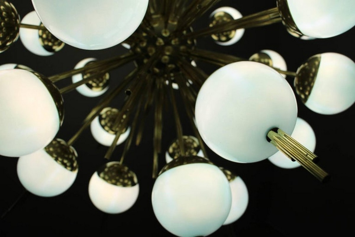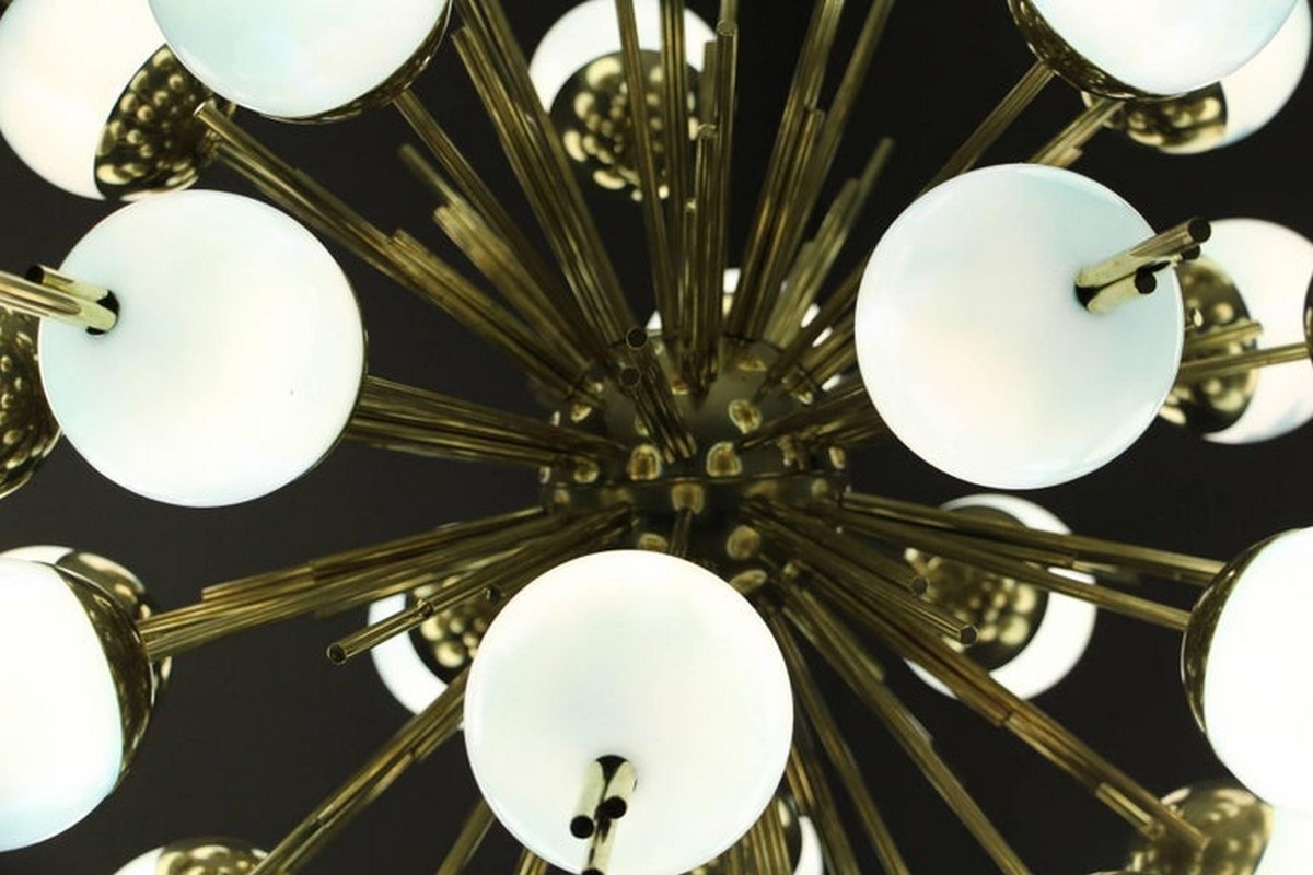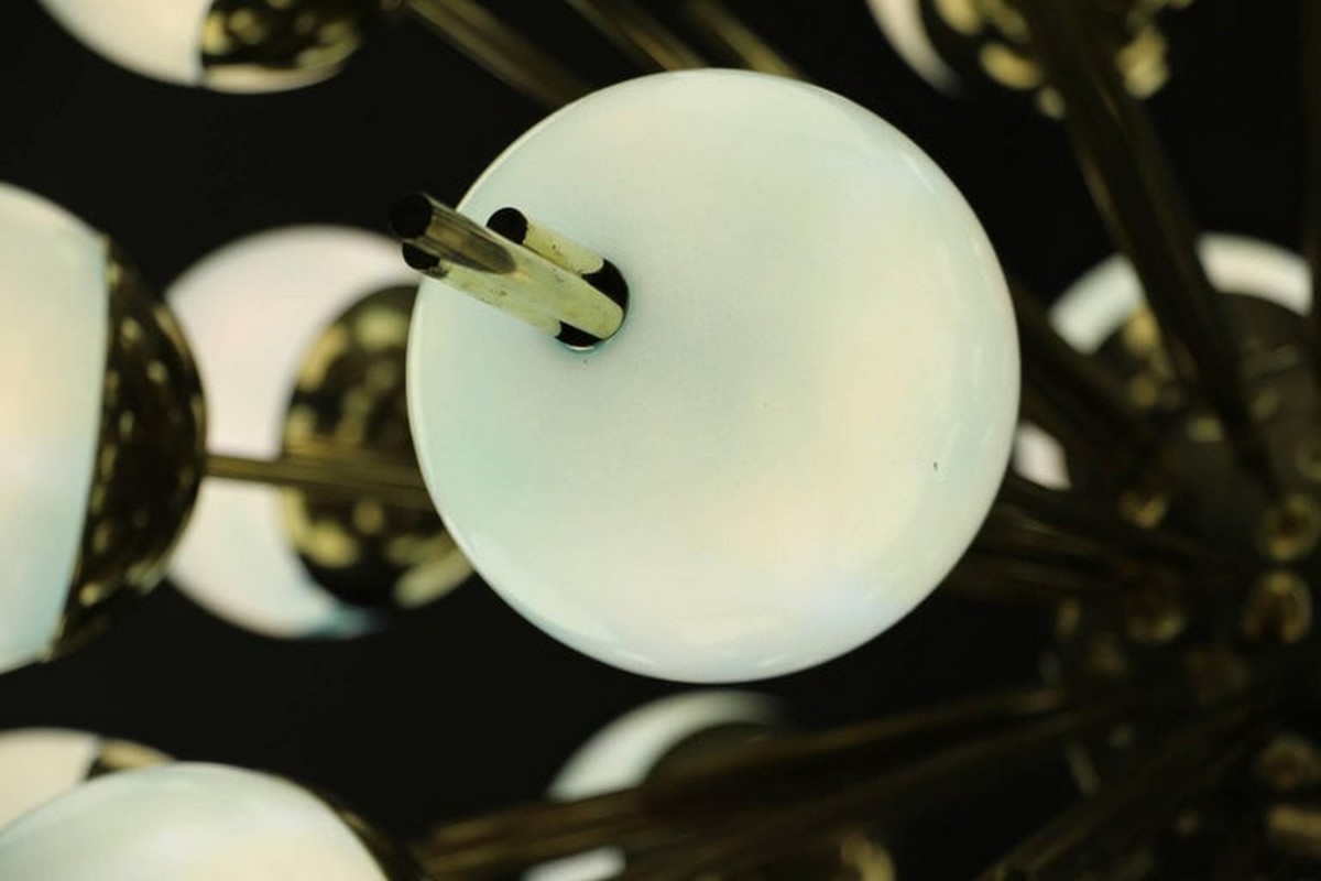 Ce Lustre Sputnik en laiton et globes très inhabituel comprend 30 globes en verre turquoise montés sur des tiges en laiton. Lorsque la lumière est allumée:: ses globes turquoise deviennent bleu clair et il est toujours aussi magnifique. Accepte les ampoules E14. Câblé pour les États-Unis