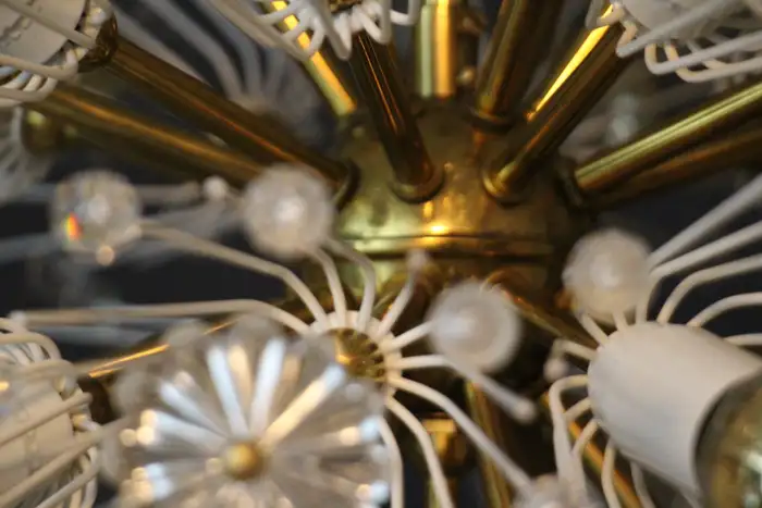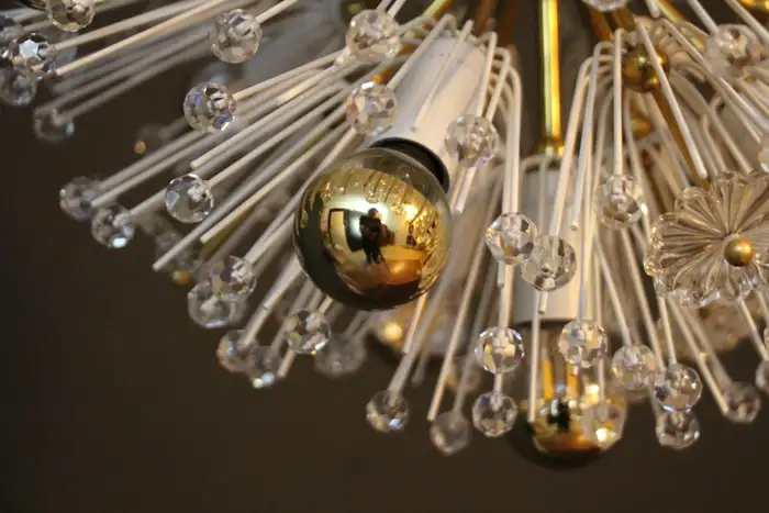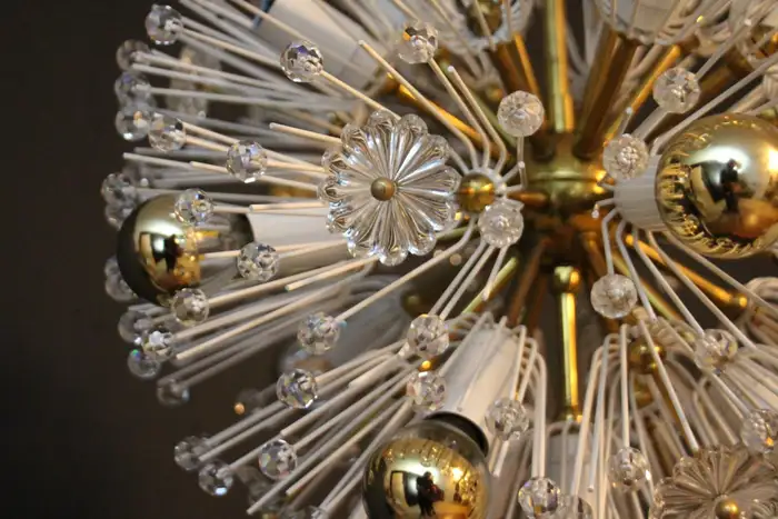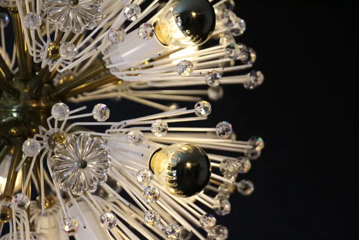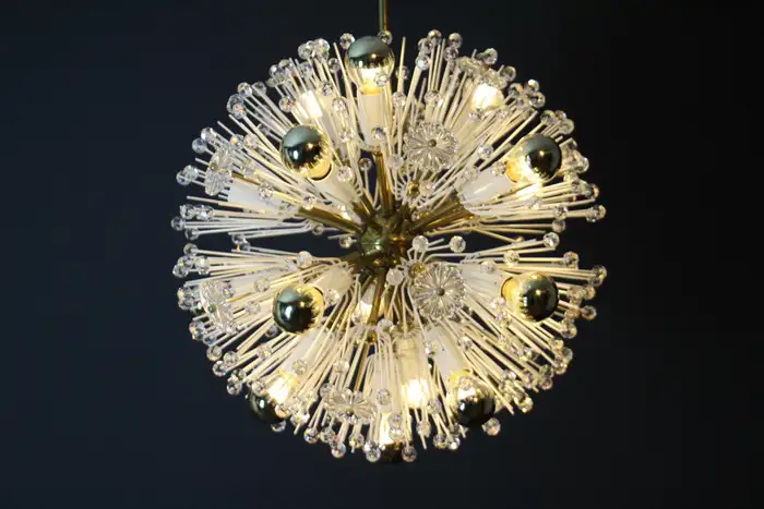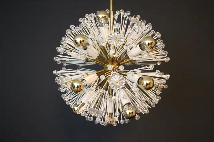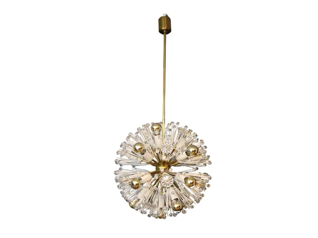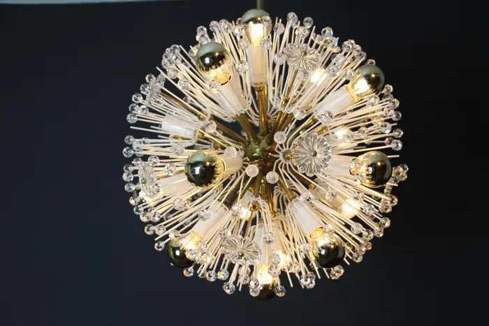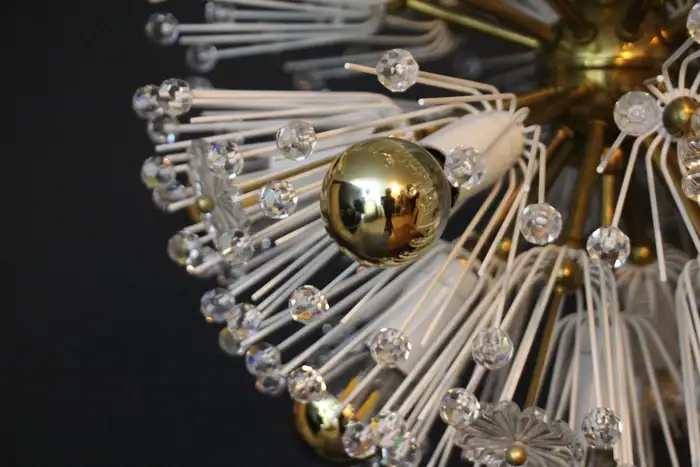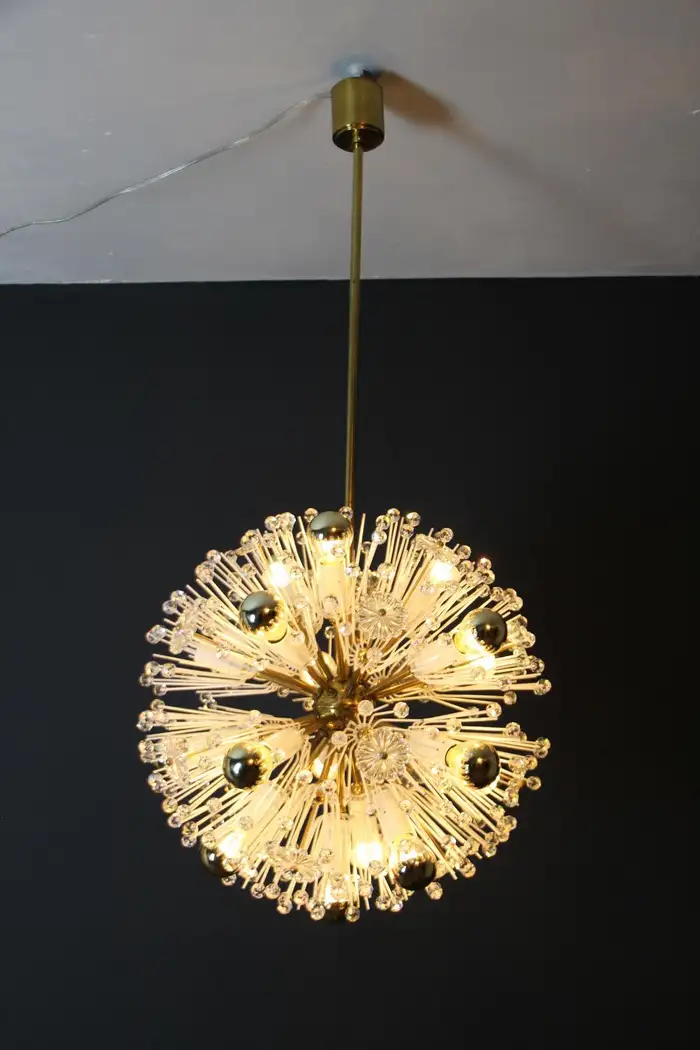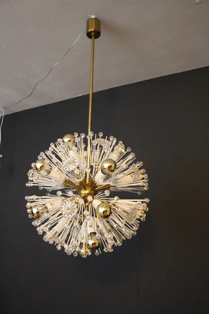 Ce spectaculaire lustre Spoutnik moderne ressemble à une explosion de fleurs et se compose d’une multitude de tiges en laiton terminées par des ampoules, des perles ou des fleurs en cristal clair.