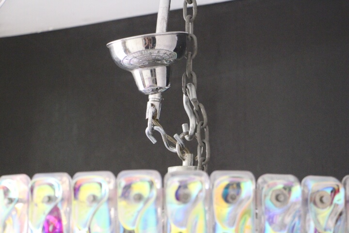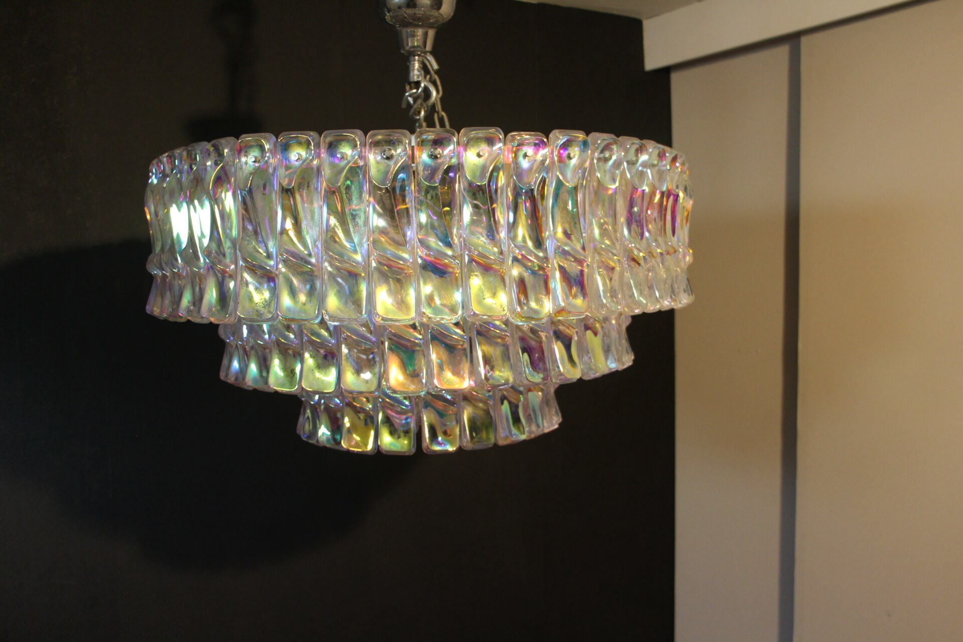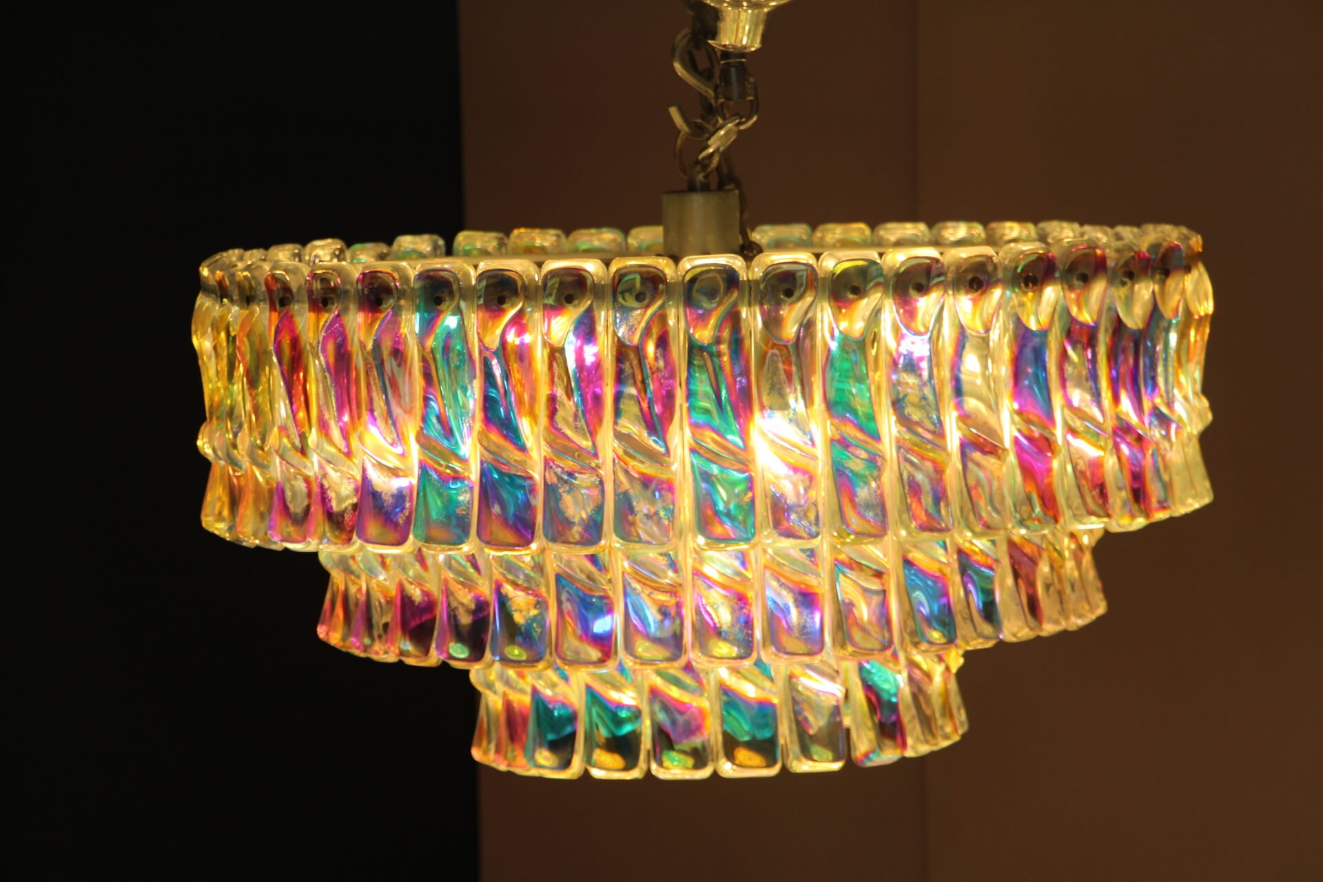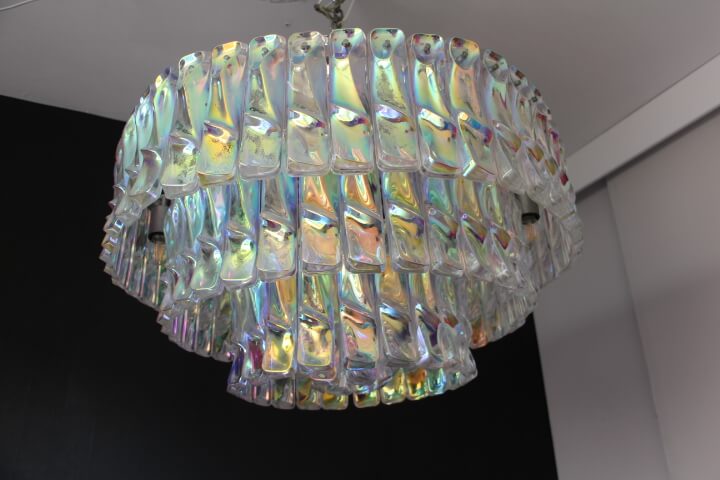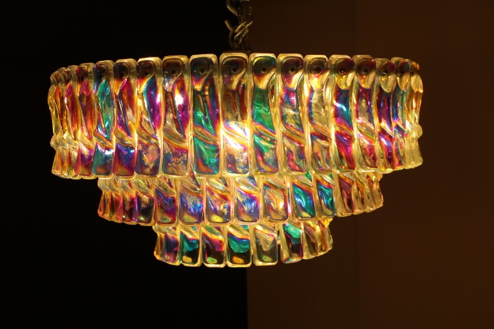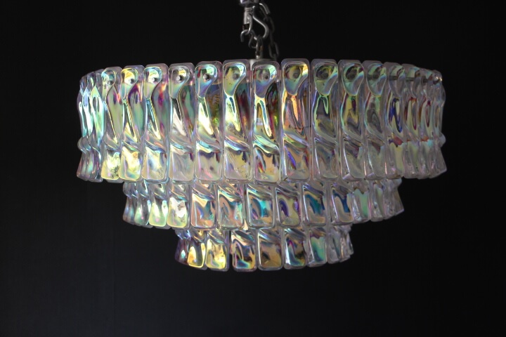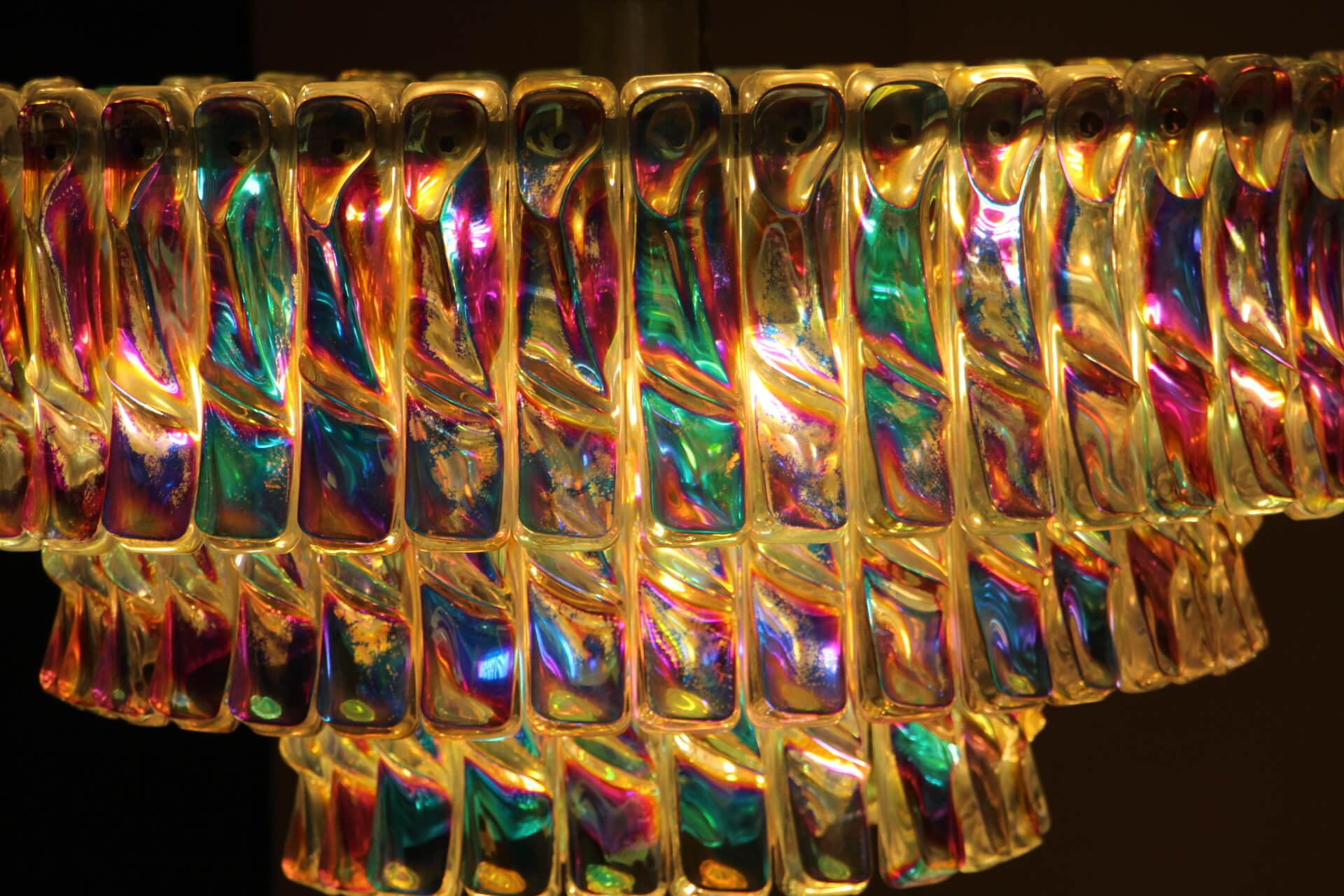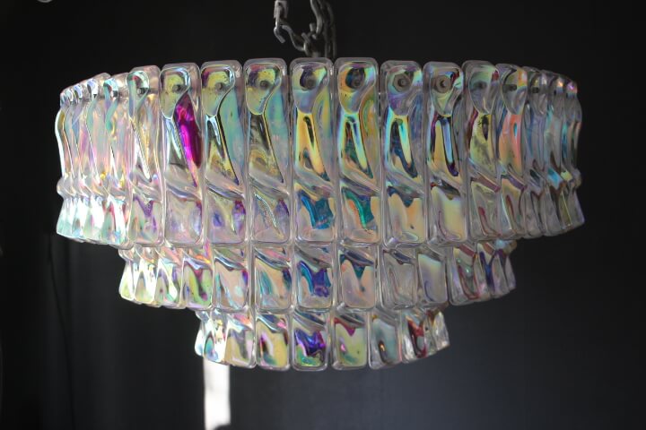 Ce fabuleux Lustre vintage style Vénini est étonnant. En effet, ses couleurs changent en fonction de la lumière et de l’environnement. Ses plaques en verre de Murano changent de couleur du blanc irisé au jaune, vert, bleu, rose et violet.