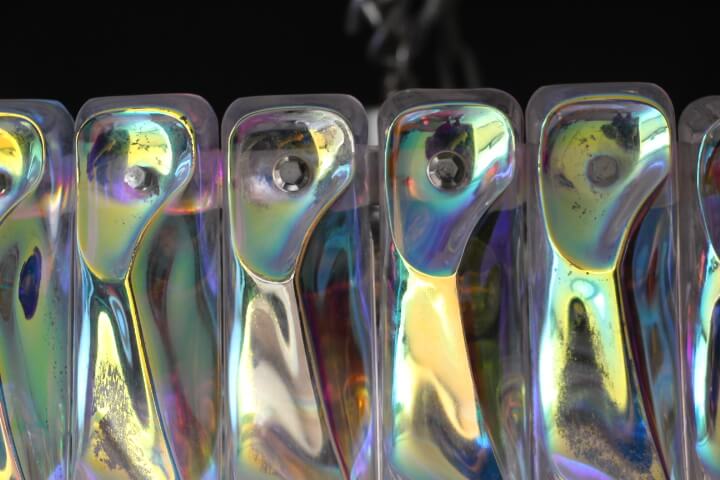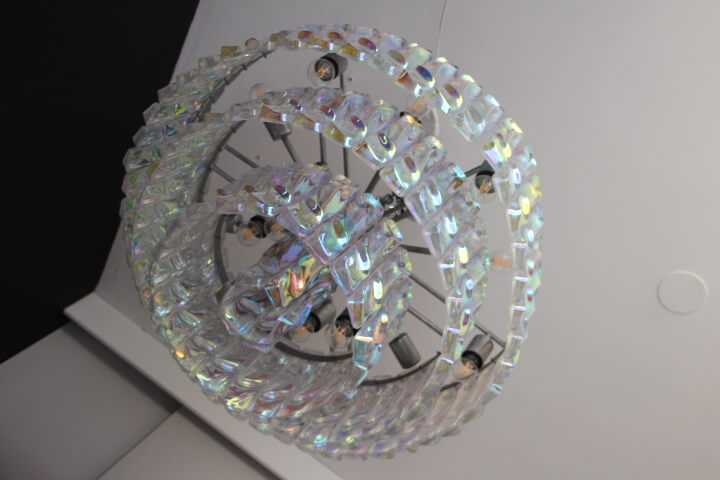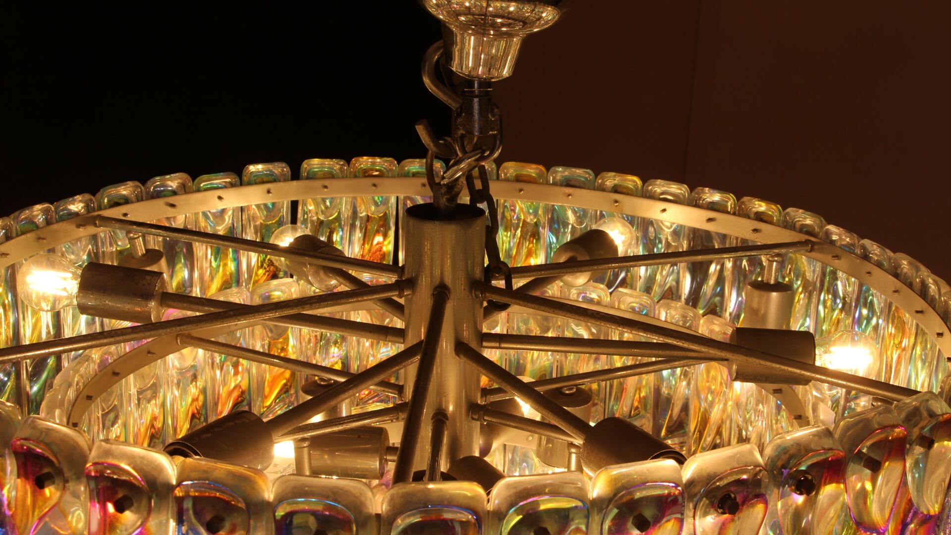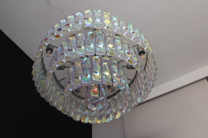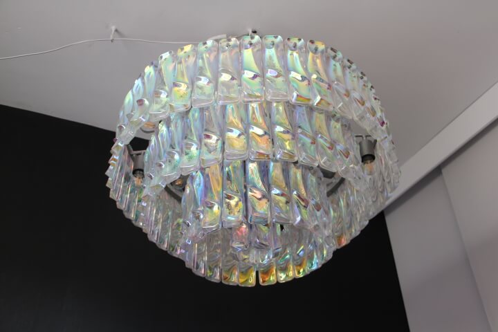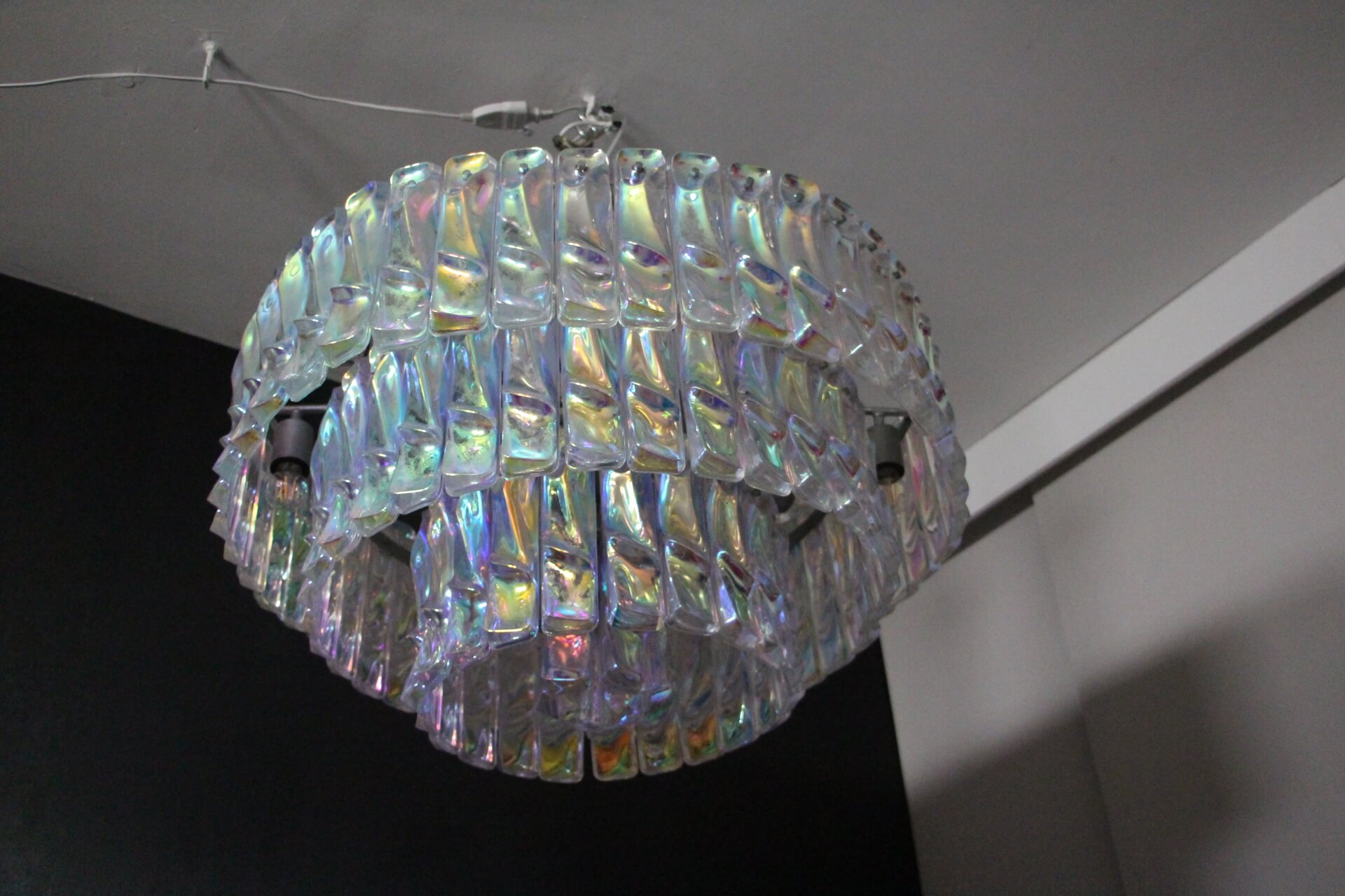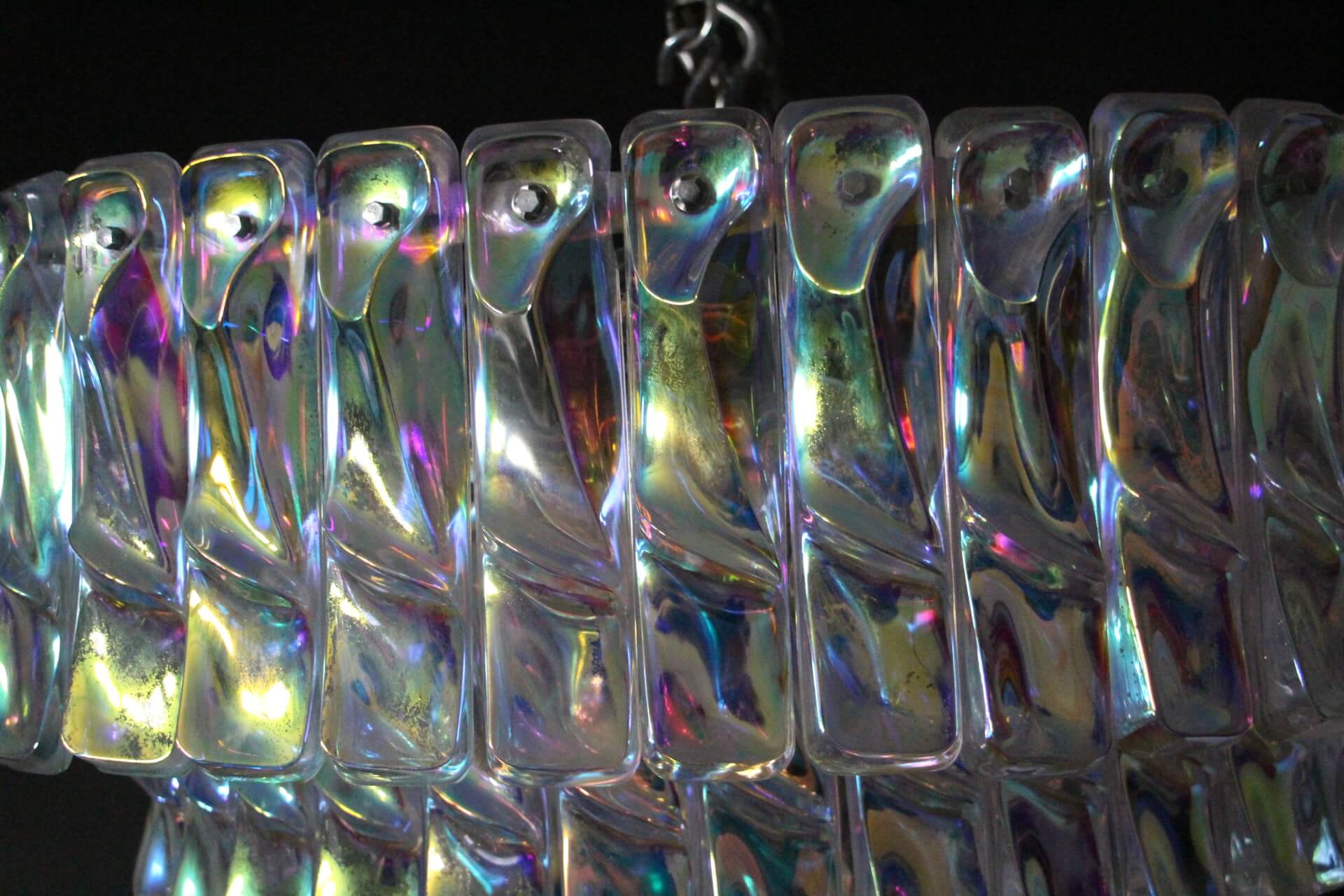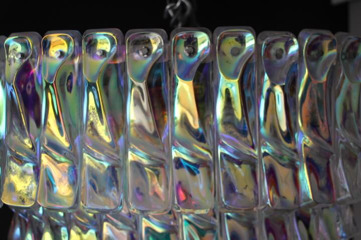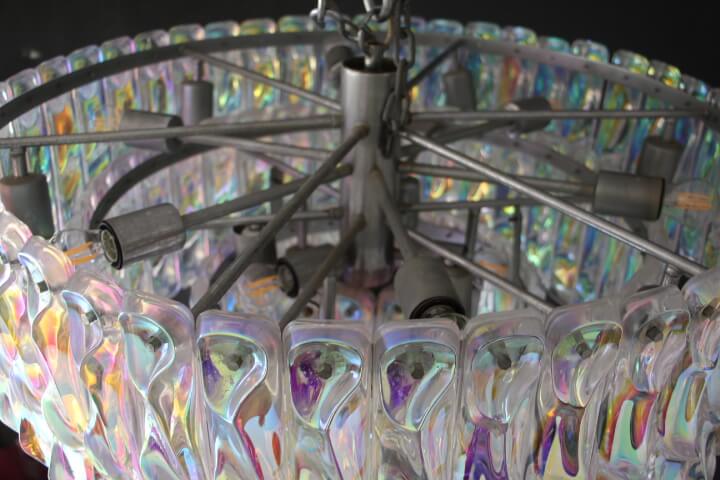 Ce fabuleux Lustre vintage style Vénini est étonnant. En effet, ses couleurs changent en fonction de la lumière et de l’environnement. Ses plaques en verre de Murano changent de couleur du blanc irisé au jaune, vert, bleu, rose et violet.