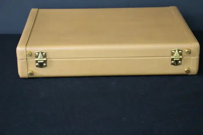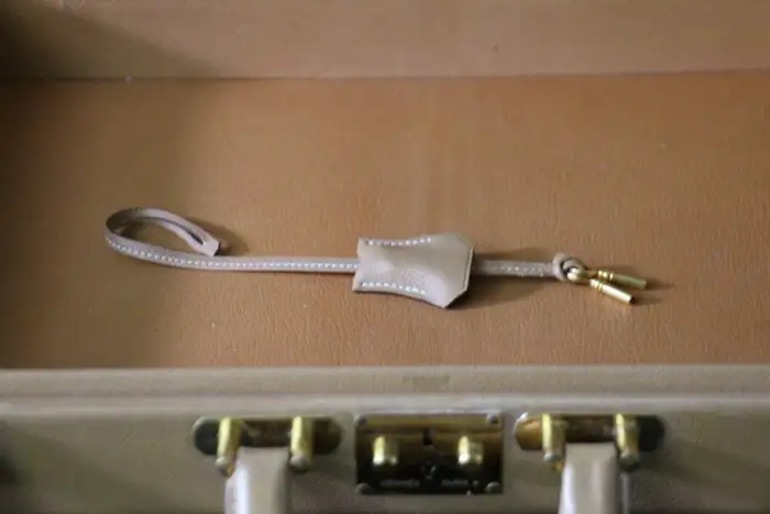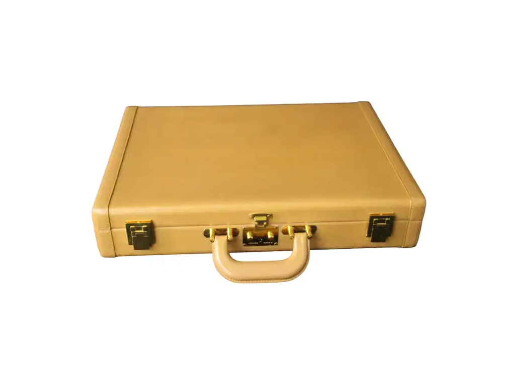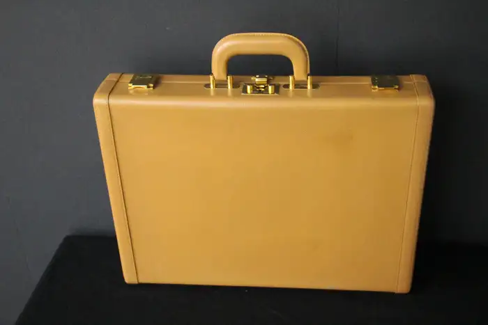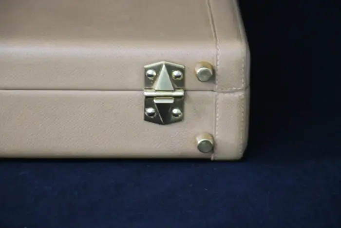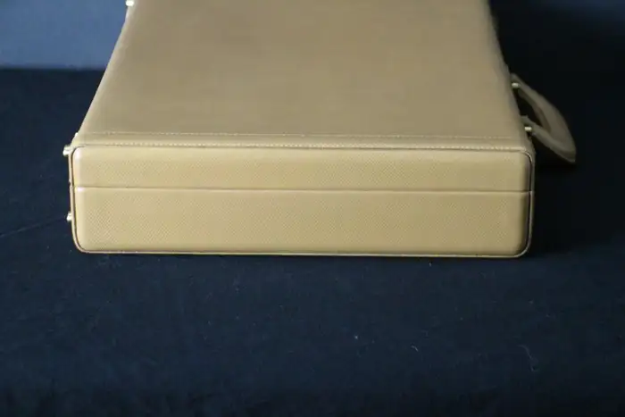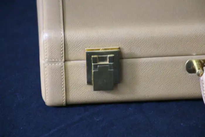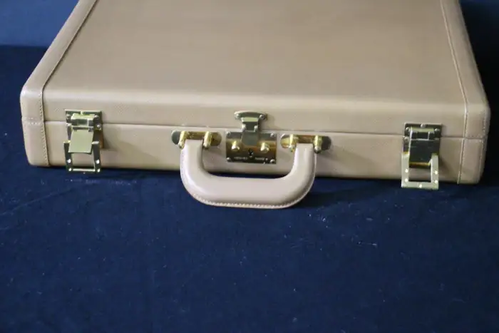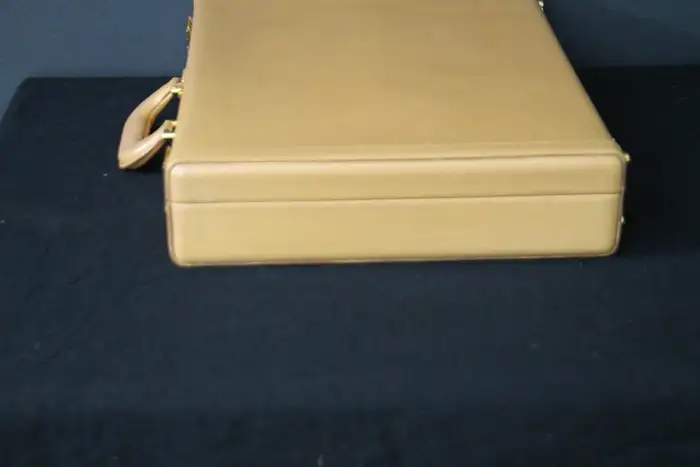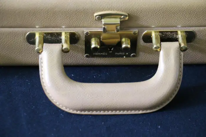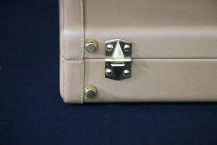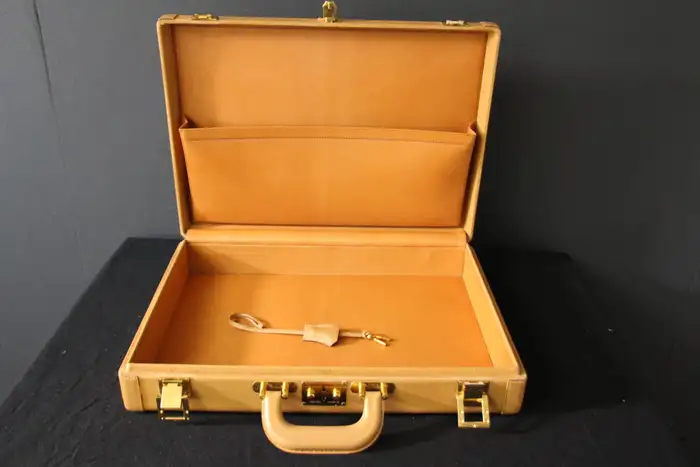 Cet élégant porte-documents Hermès est doté d’un beau cuir beige et d’une poignée confortable en cuir. C’est une couleur très inhabituelle pour un bagage Hermès. Fermé par 2 loquets en laiton massif plaqués or gravés Hermès en forme de H ainsi qu’une fermeture à pince gravée Hermès. Cet attache case est marqué Hermès Paris en or sur la tranche de son intérieur. Lorsqu’il est ouvert, son intérieur révèle un magnifique intérieur en cuir beige assorti et une pochette plate pour ranger dossiers et documents. Il possède encore ses 2 clés d’origine et sa clochette, ensemble complet.